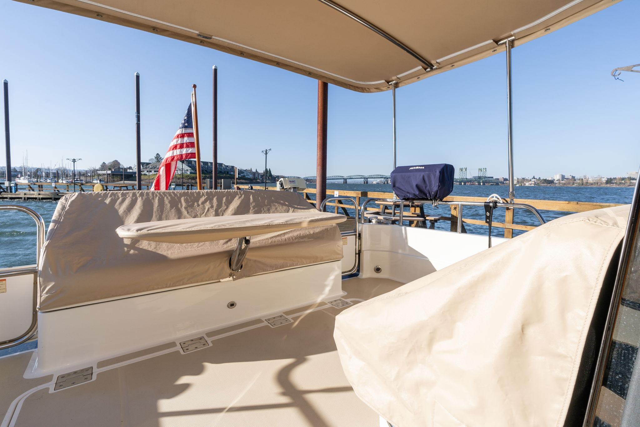 The cockpit is arranged for comfort and usability, featuring new bench cushions upholstered in Sunbrella fabric and new canvas on both bench seats. A cockpit extension bimini constructed from premium Stamoid fabric provides excellent sun and weather protection. Teak trim throughout the exterior was varnished in October 2024 with three fresh coats, and teak-style flooring adds durability and a refined appearance. A Magma stainless steel BBQ is mounted in the cockpit, making onboard grilling convenient for entertaining at anchor or dockside.