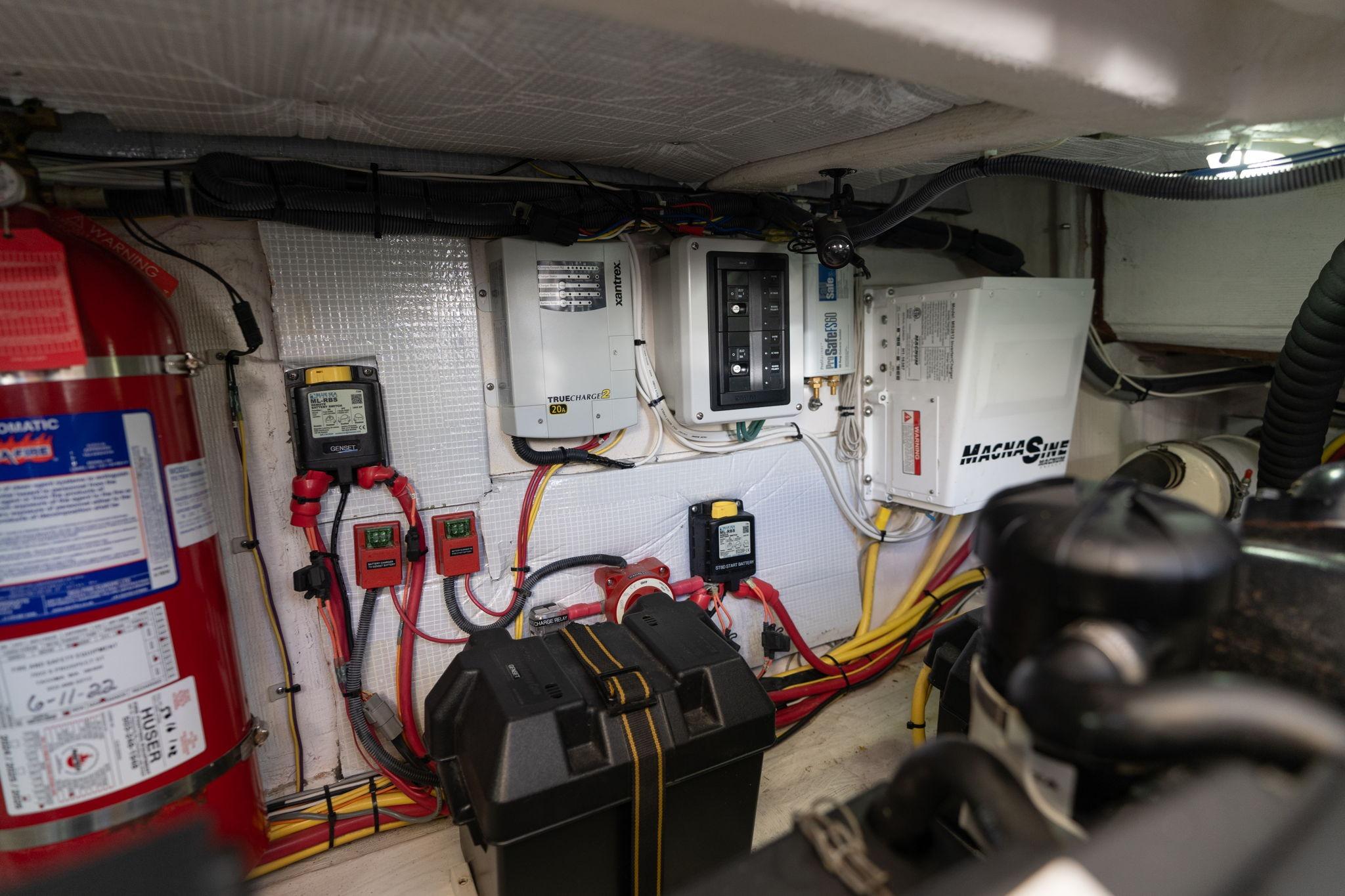 Electrical and onboard systems include a Magnum 3000W inverter, Xantrex three-bank battery charger (new August 2024), AGM Lifeline premium generator batteries (August 2024), engine start battery (June 2021), and house batteries (June 2021). A Sea Recovery Aqua Whisper Pro 450 watermaker rated at approximately 19 GPH, combined with a full-house water filtration system, supports extended time aboard. New underwater lights have been installed with an upsized breaker. Starlink provides high-speed connectivity.