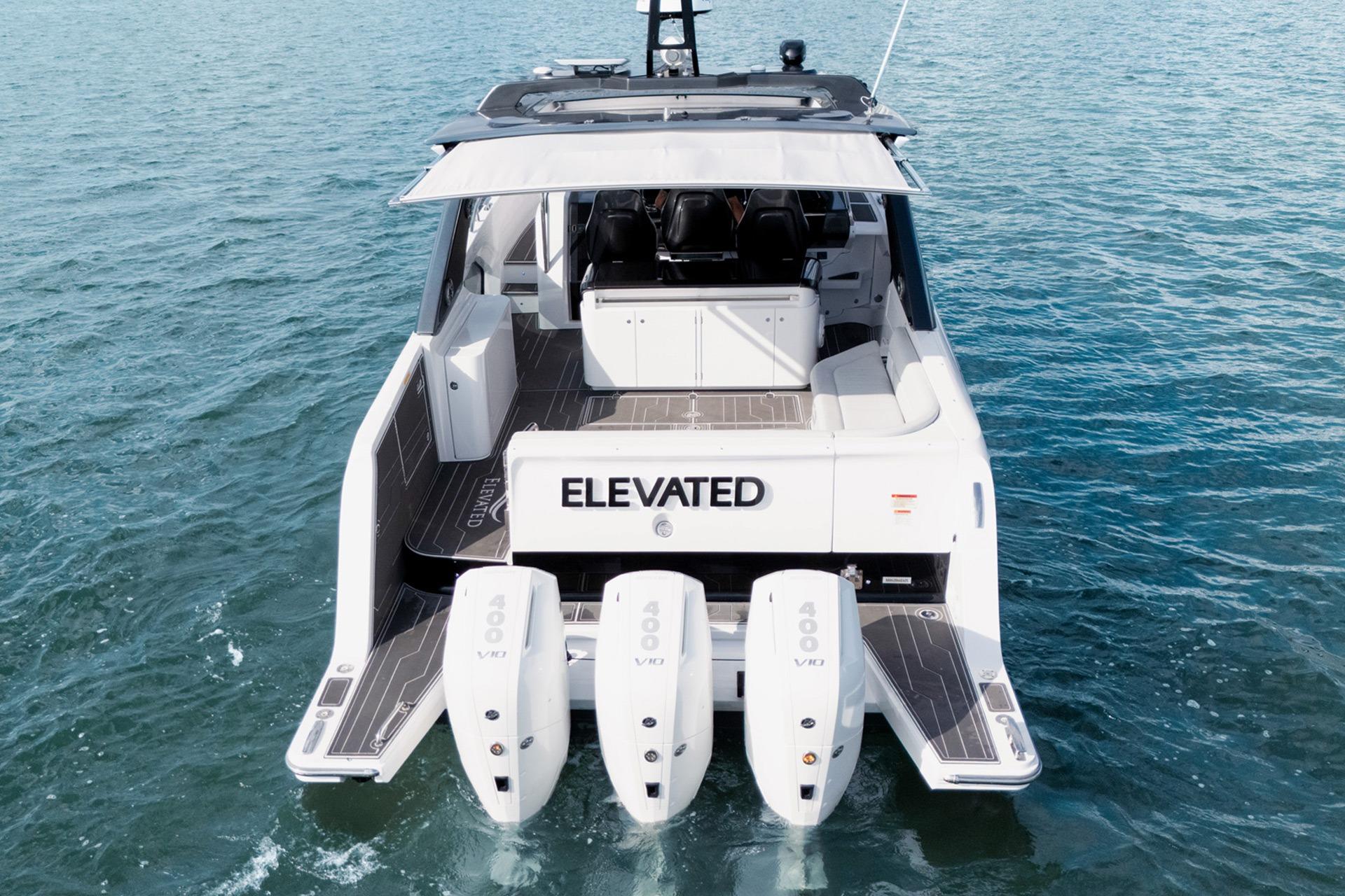 Powered by triple Mercury V10 400 HP outboards, she delivers impressive speed, responsive handling, and shallow-draft versatility. The open deck layout is ideal for entertaining, with generous bow seating, an aft cockpit dining area, and seamless flow between helm and social spaces.