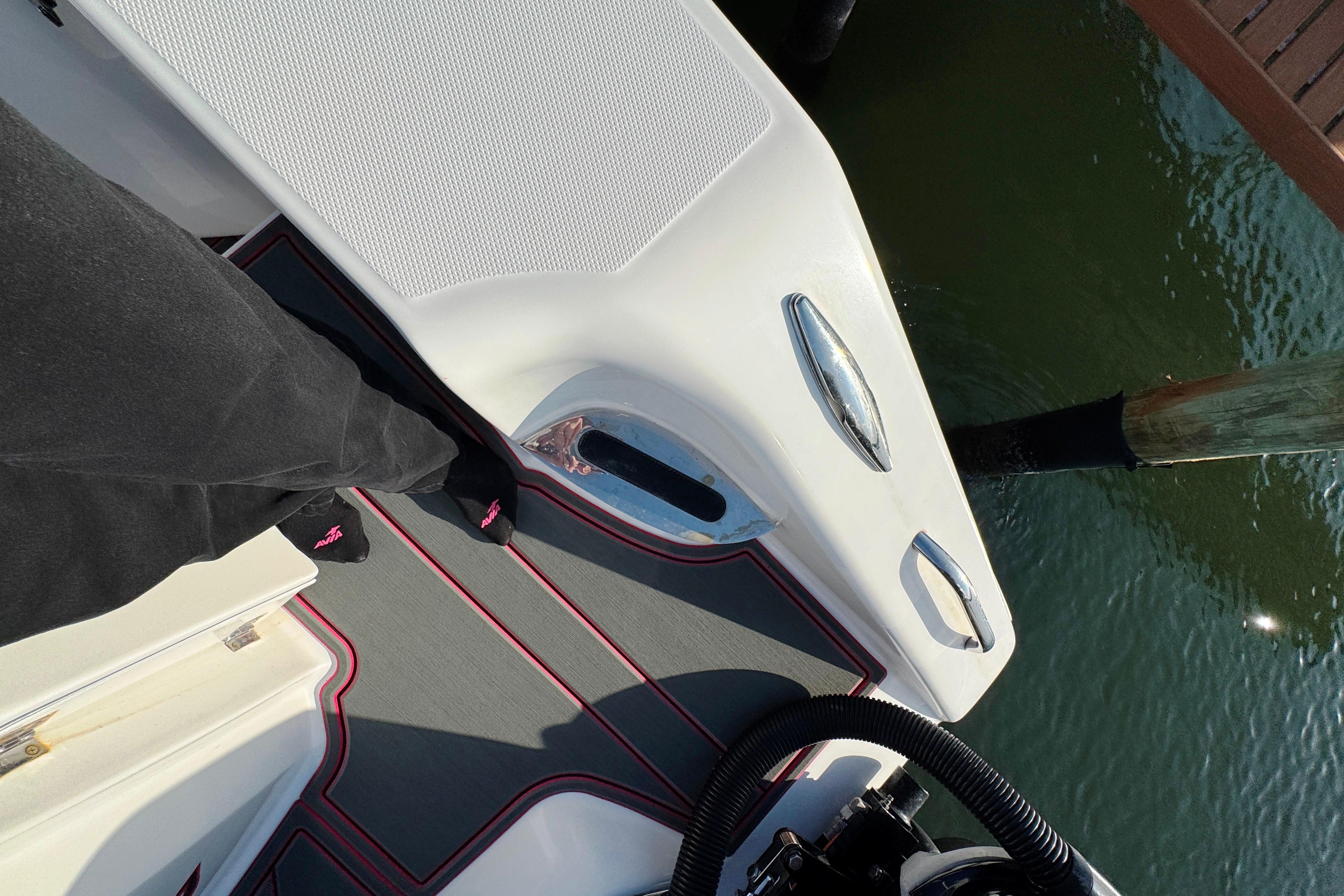 Comfort and usability upgrades include new upholstery, new Gator Step flooring, a slide out cooler under the rear facing seat, a side swim door with ladder, and a port side transom door for easy water access. The boat also features custom painted graphics by D Hunter and comes with a full cover to protect the vessel when not in use.