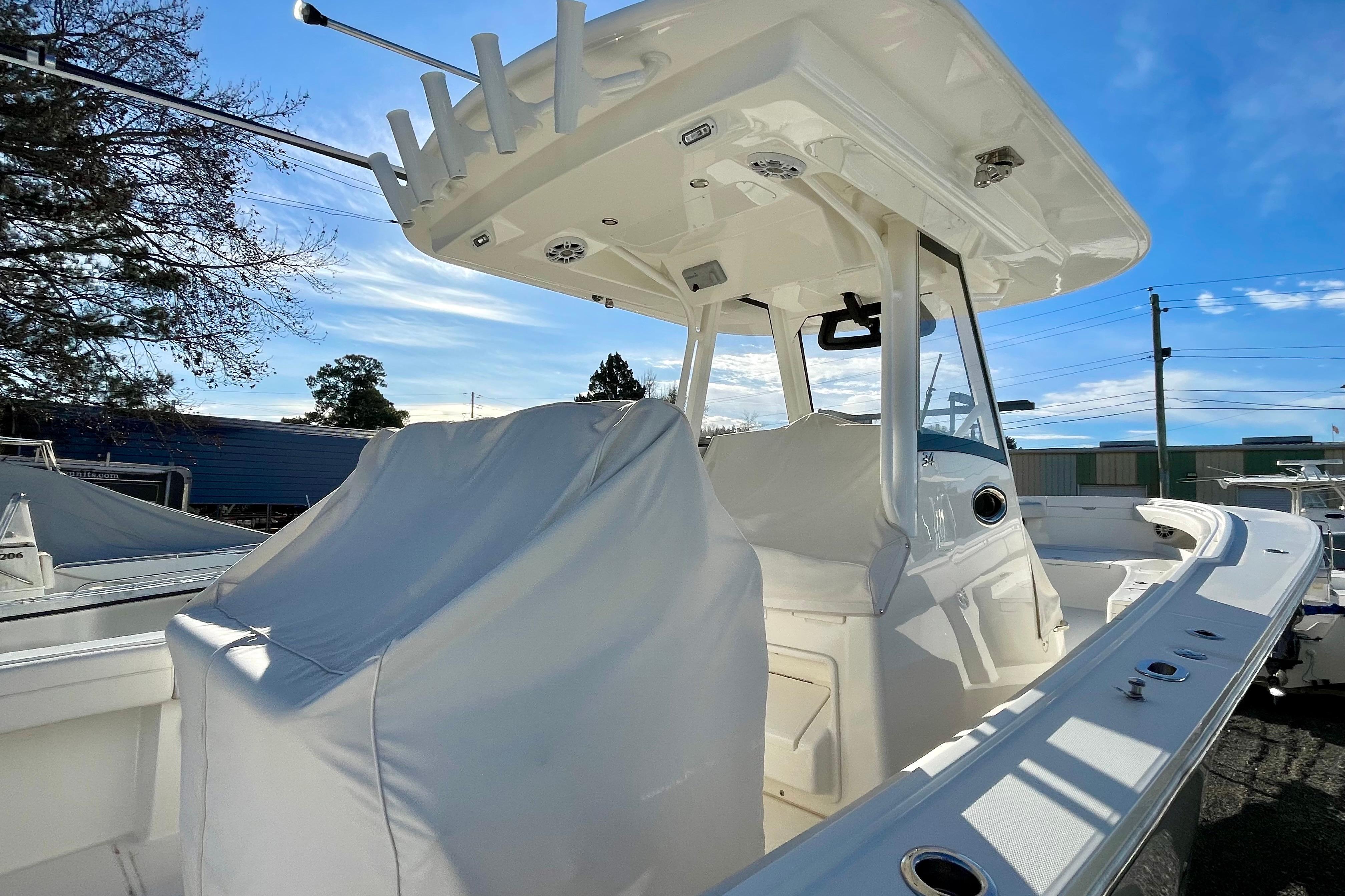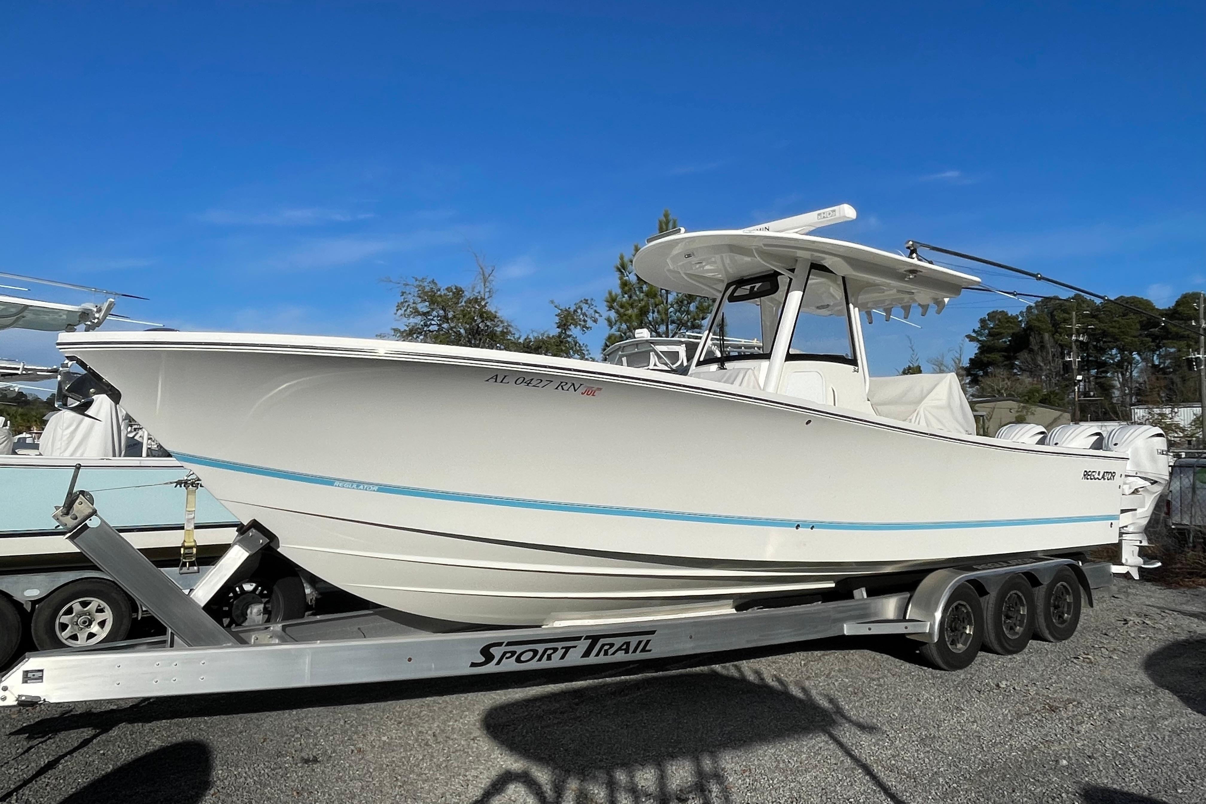 The Regulator 34 is a true center console, with a design that maximizes space to rival its 39-foot competitors. Now available with twin Yamaha 425s, the Yamaha Helm Master® EX option and Seakeeper® 2, the 34 is ready for action. Fishermen’s favorites include a huge forward deck, 42-gallon transom livewell, 220-quart transom fishbox, and 3X Deluxe Tackle Center with rigging station. Upgrade to the new 3X Deluxe Mezzanine Tackle Center for additional seating, storage, and seatside rocket launchers to keep you on the fish, then let out your lines with the optional Taco® Grand Slam 390 outrigger bases with 20’ Carbon Fiber telescoping poles. Ride in comfort with our integrated wraparound windshield and optional helm A/C, Fusion® entertainment and a new look at the helm – plus starboard boarding and dive door, optional forward sun shade and cockpit SureShade®. Below deck, the berth sleeps two and features abundant rod rack storage, among other overnight amenities, making the 34 a favorite again and again.