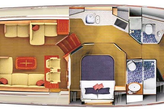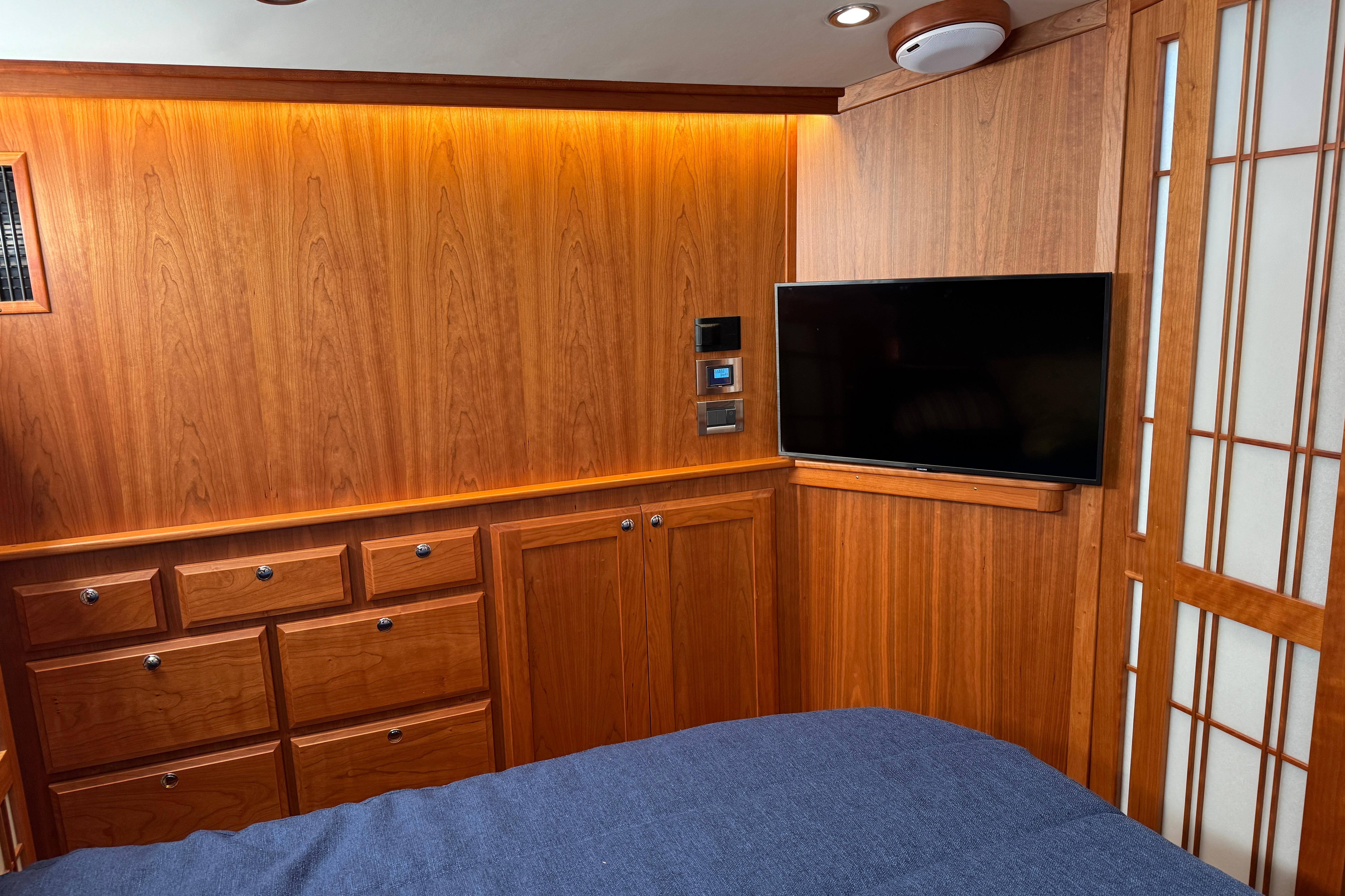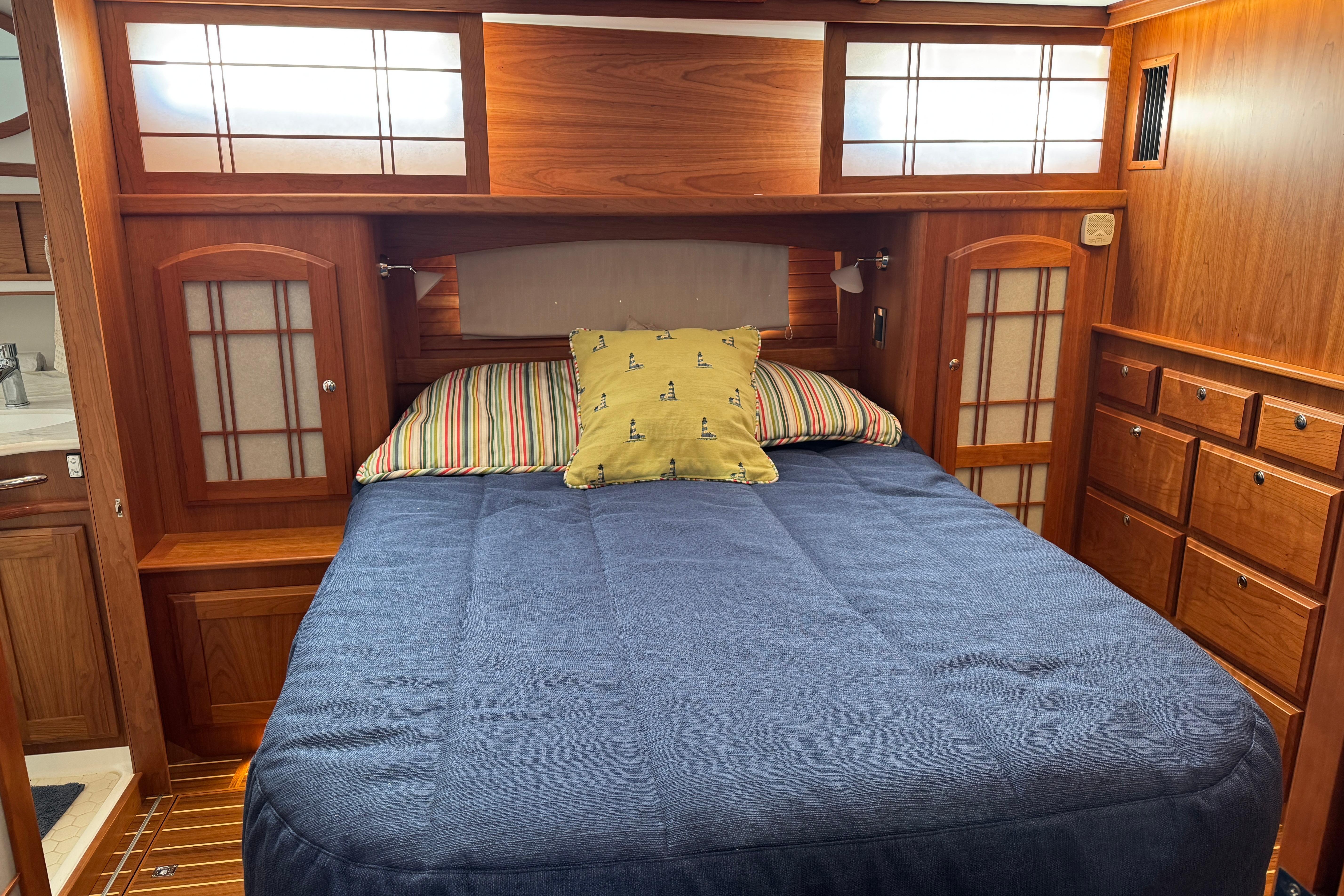 Athwartship Master Stateroom: A unique design choice where the master bed is oriented side-to-side rather than bow-to-stern. This creates a more open feel and allows for a flat floor throughout the cabin.