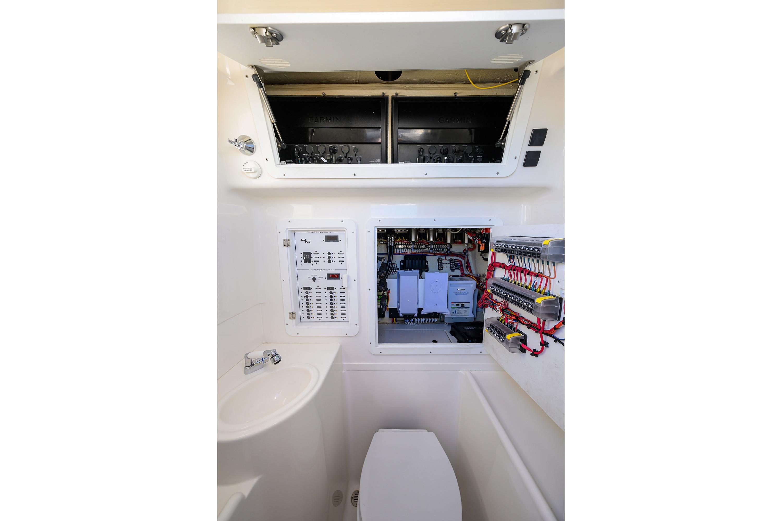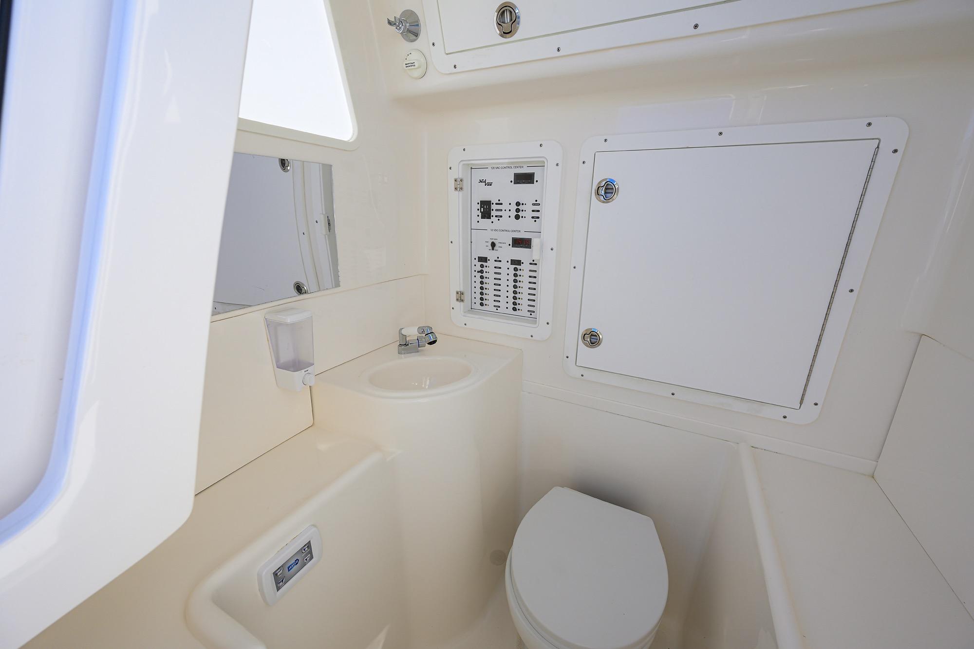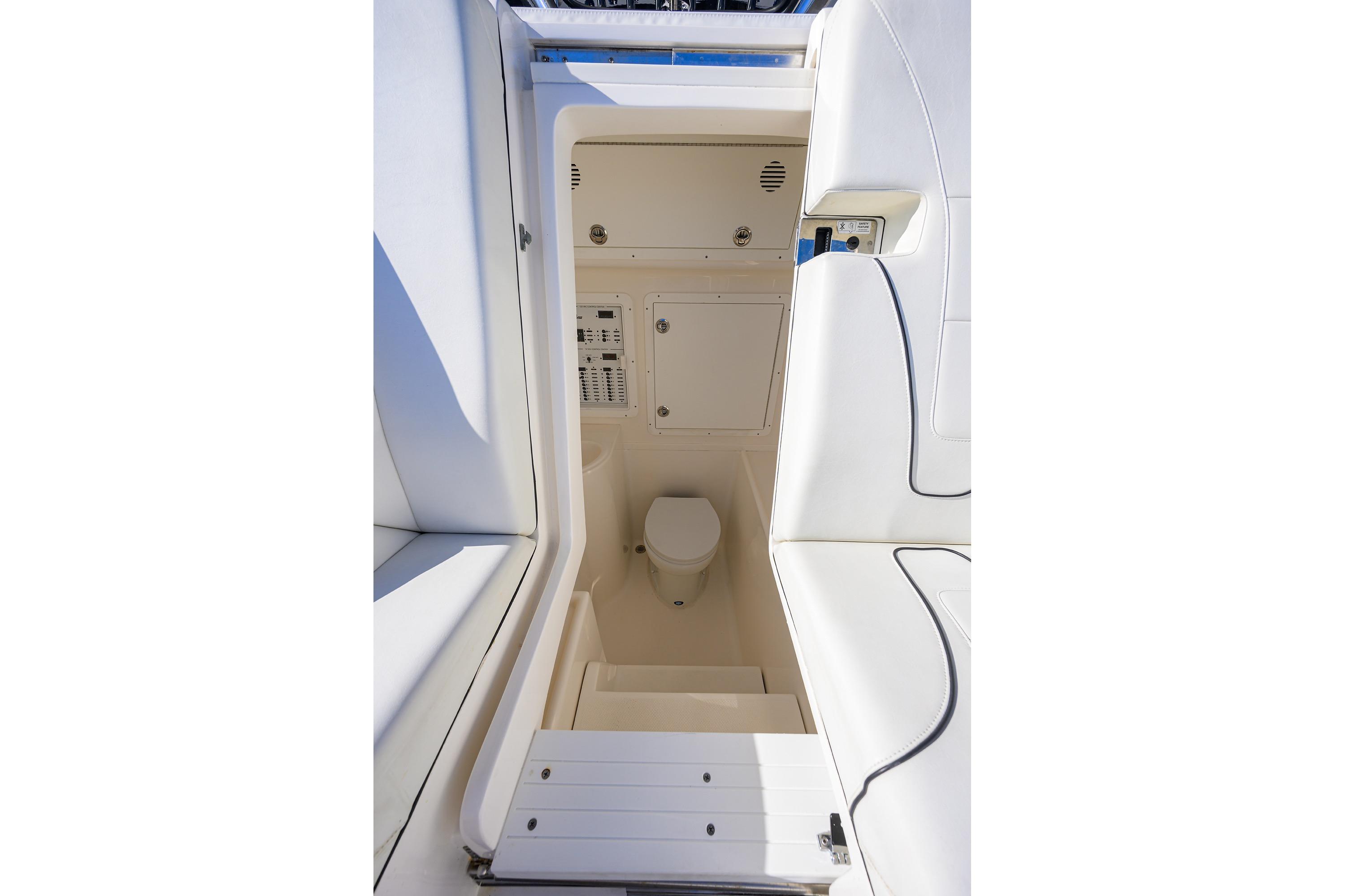 - Console and Helm: Walk-in console with side-sliding door, freshwater sink and shower, helm station with electronic battery switches, customizable for Garmin electronics (common in 2023 models).