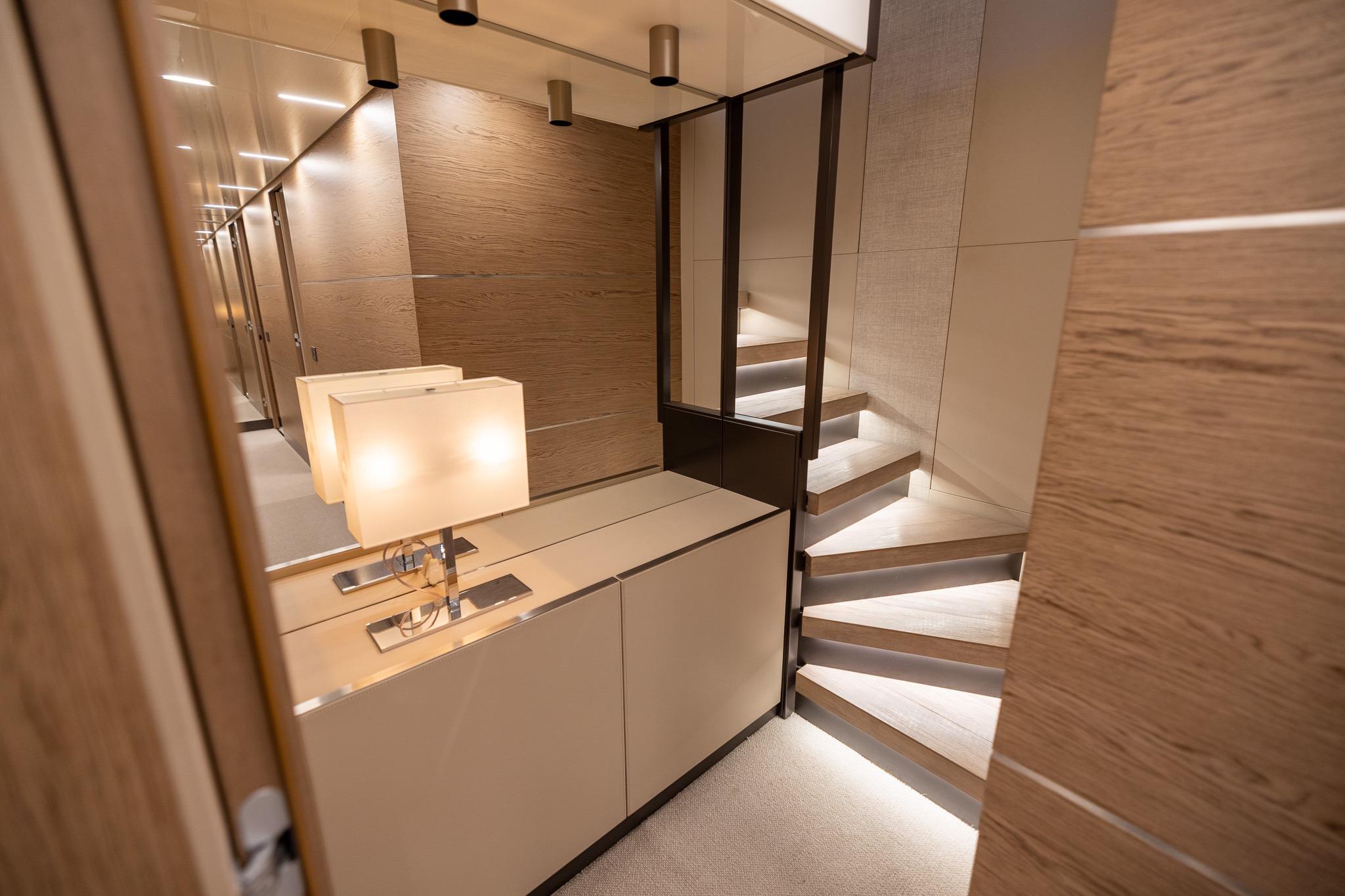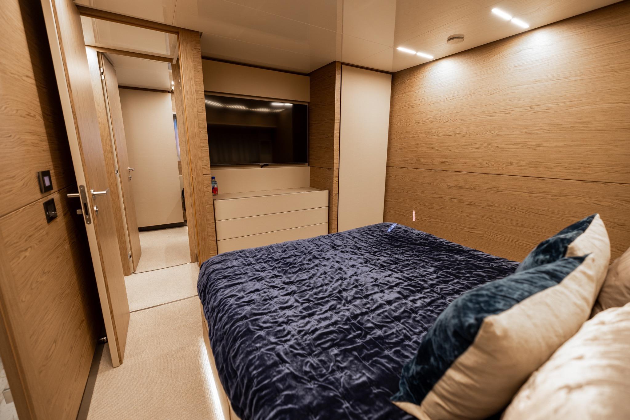 Accommodations on this 920 include the RARE 5 stateroom layout for up to 10 guests, highlighted by a full-beam master suite amidships with large hull windows, ample storage, and a private en-suite bath. Additional guest staterooms are equally well-appointed, providing comfort and privacy for all aboard. Separate crew quarters accommodate up to 5, ensuring discreet and professional service.