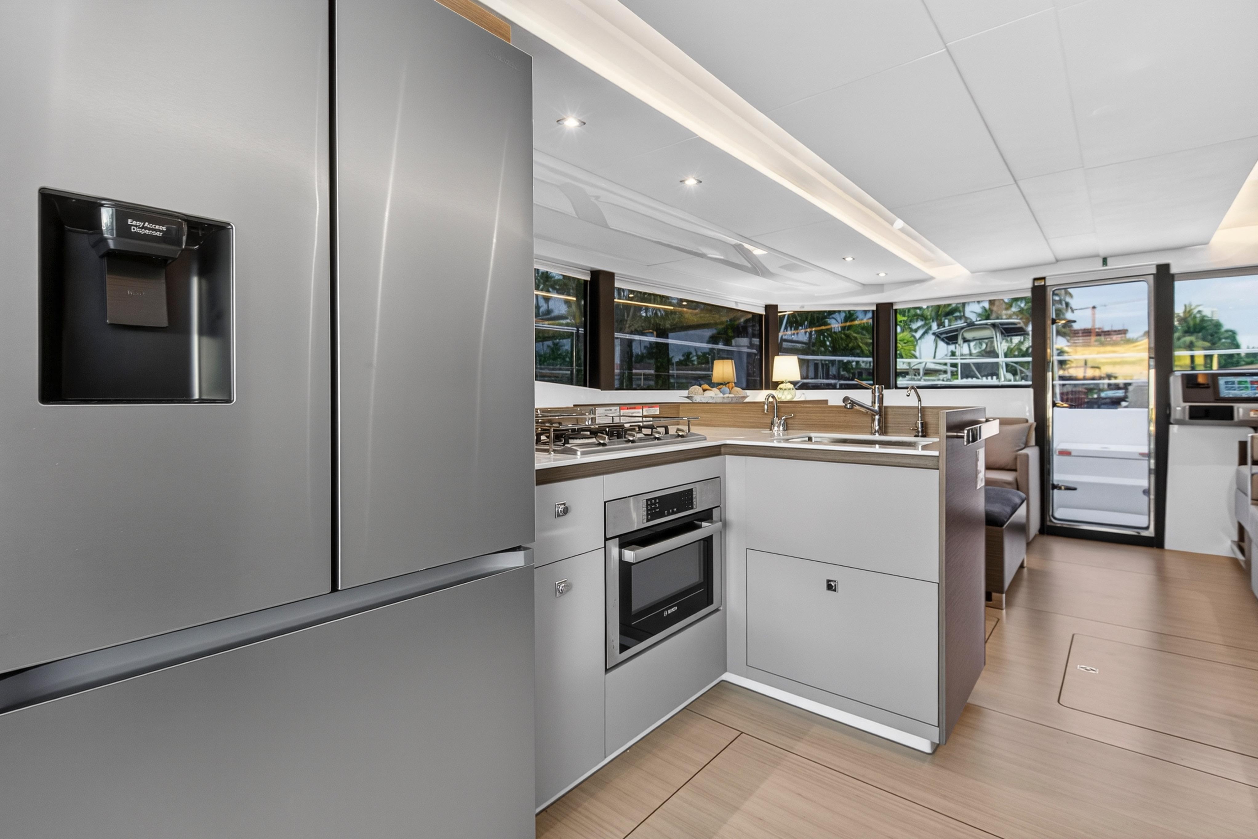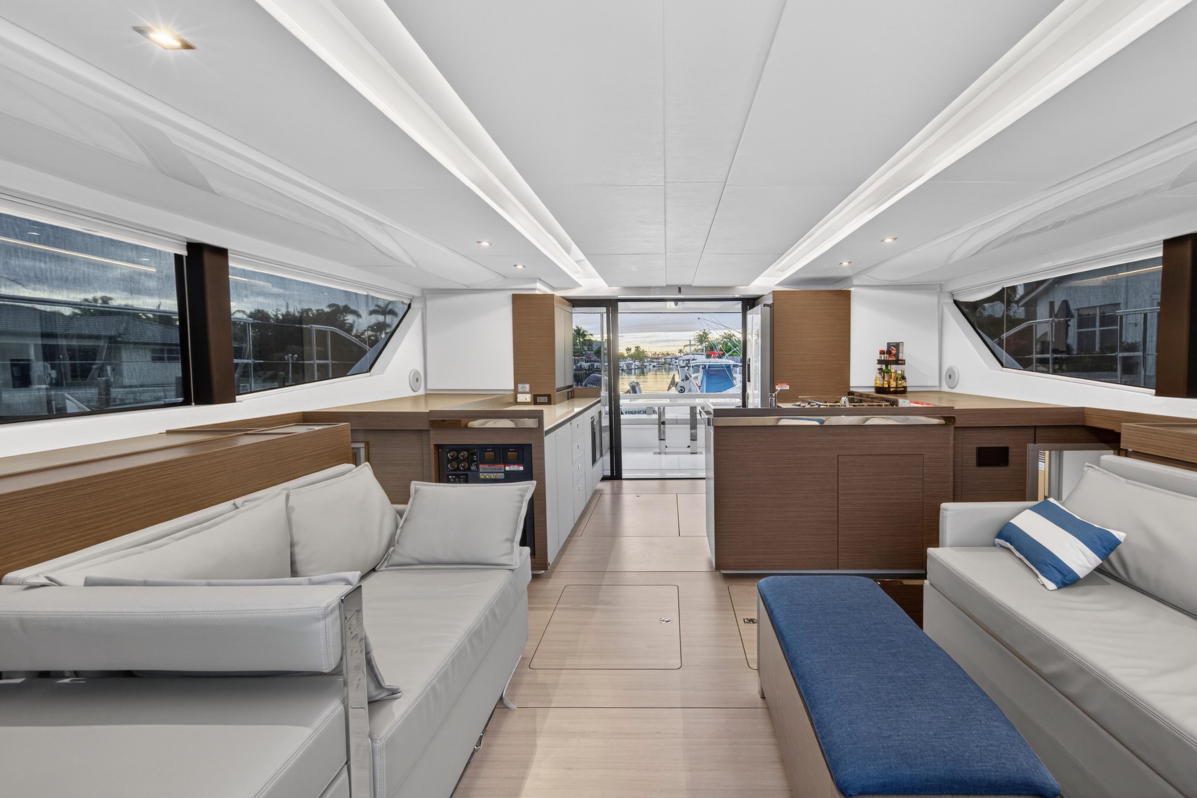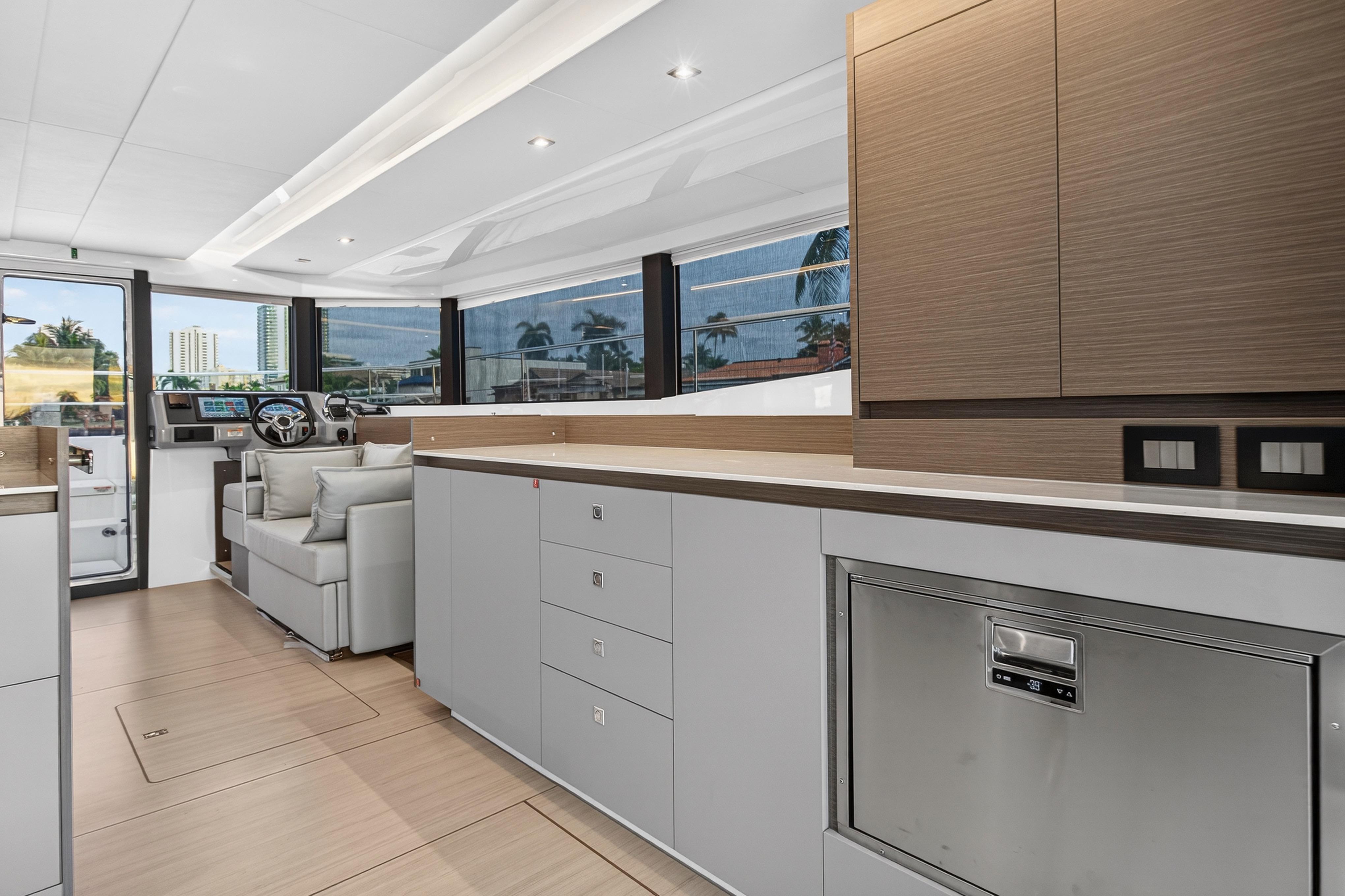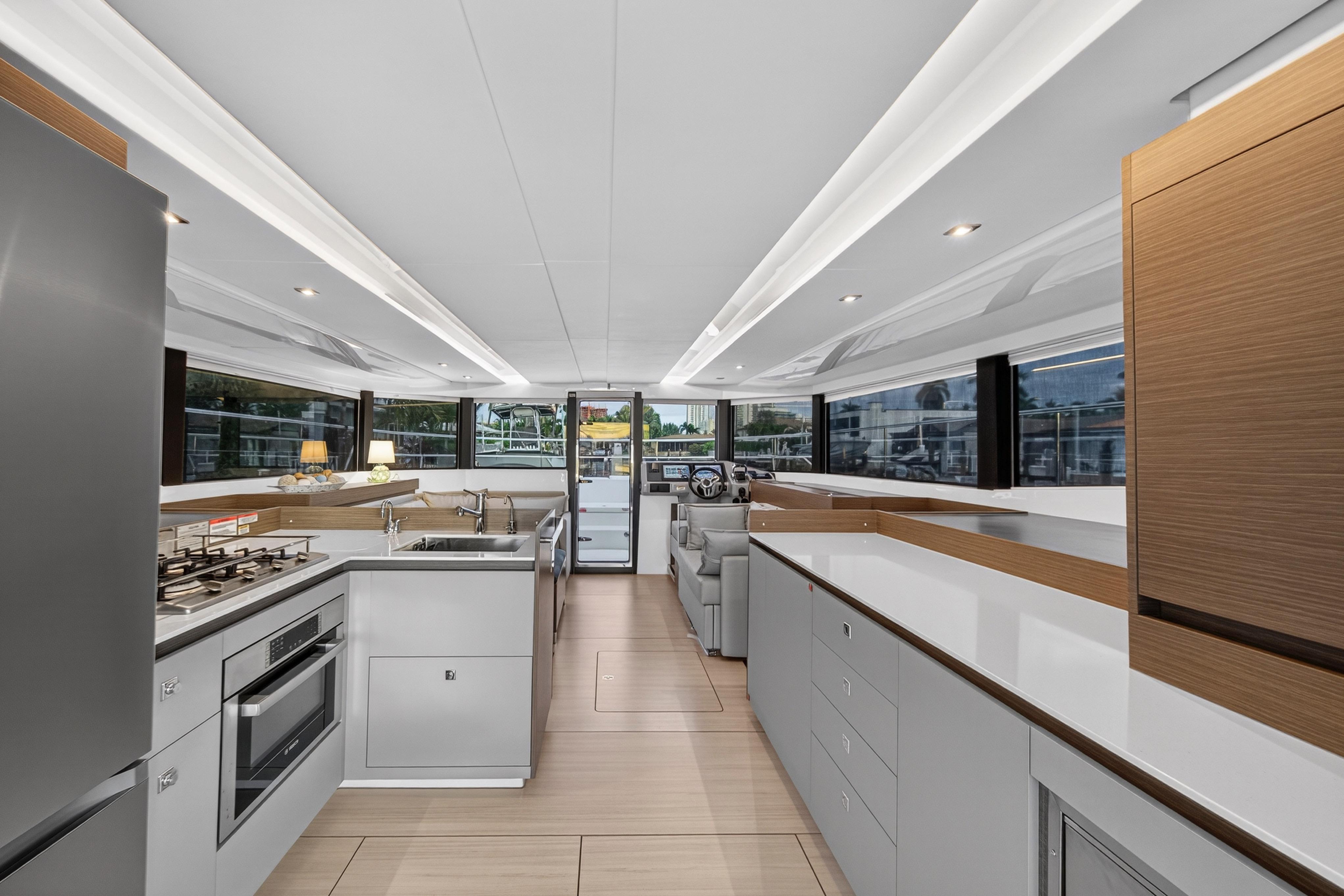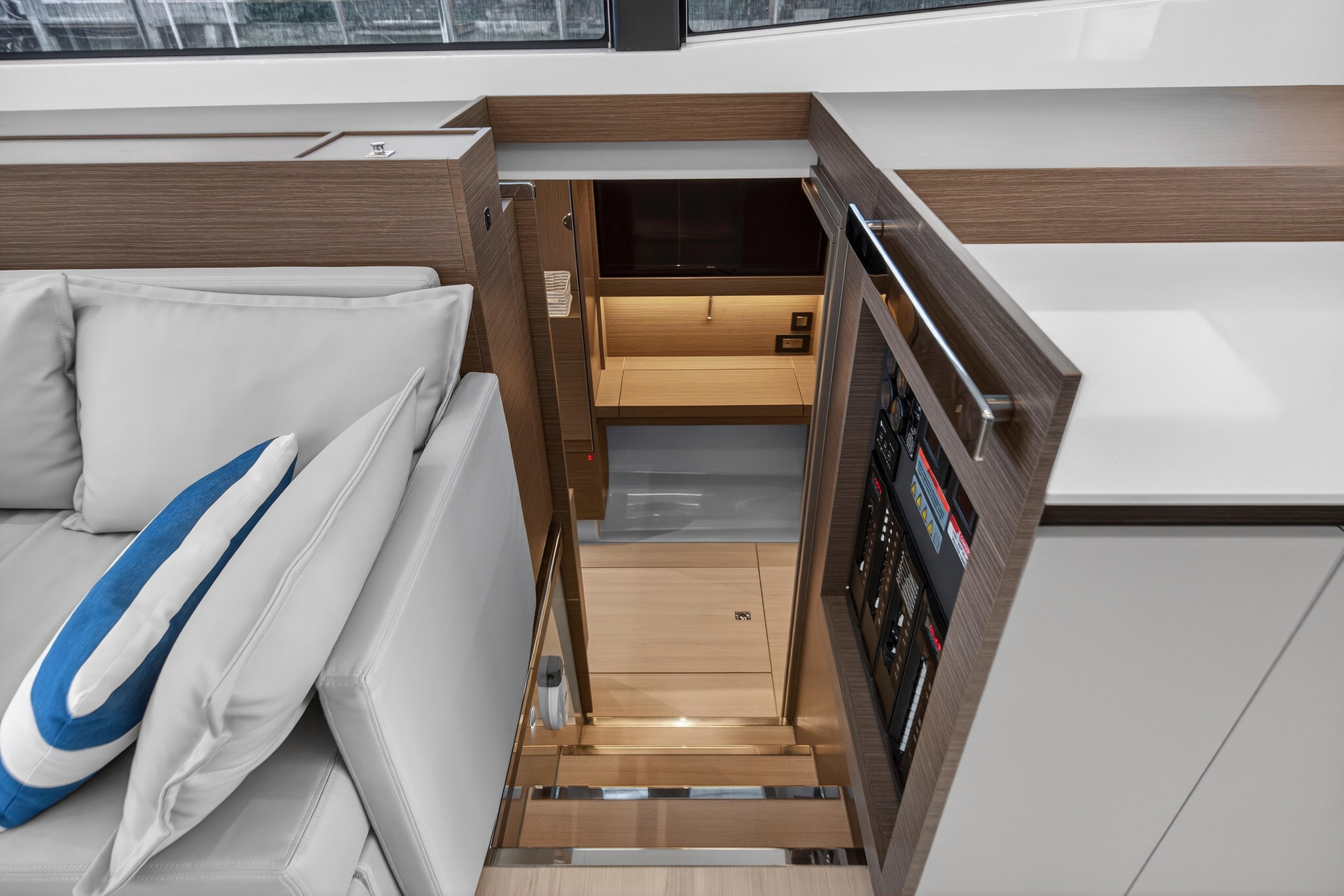 Venture inside and discover every anticipated detail, from the recessed LED task lighting to the new, soft furnishing for the settees. Gloss white galley locker doors and countertops can be upgraded to a matte beige finish. The Galley Serving Area, an additional space at the aft end of the saloon, provides an extended entertainment area complete with a large counter for food and drink preparation, ample storage lockers for crockery and food and a drinks locker.