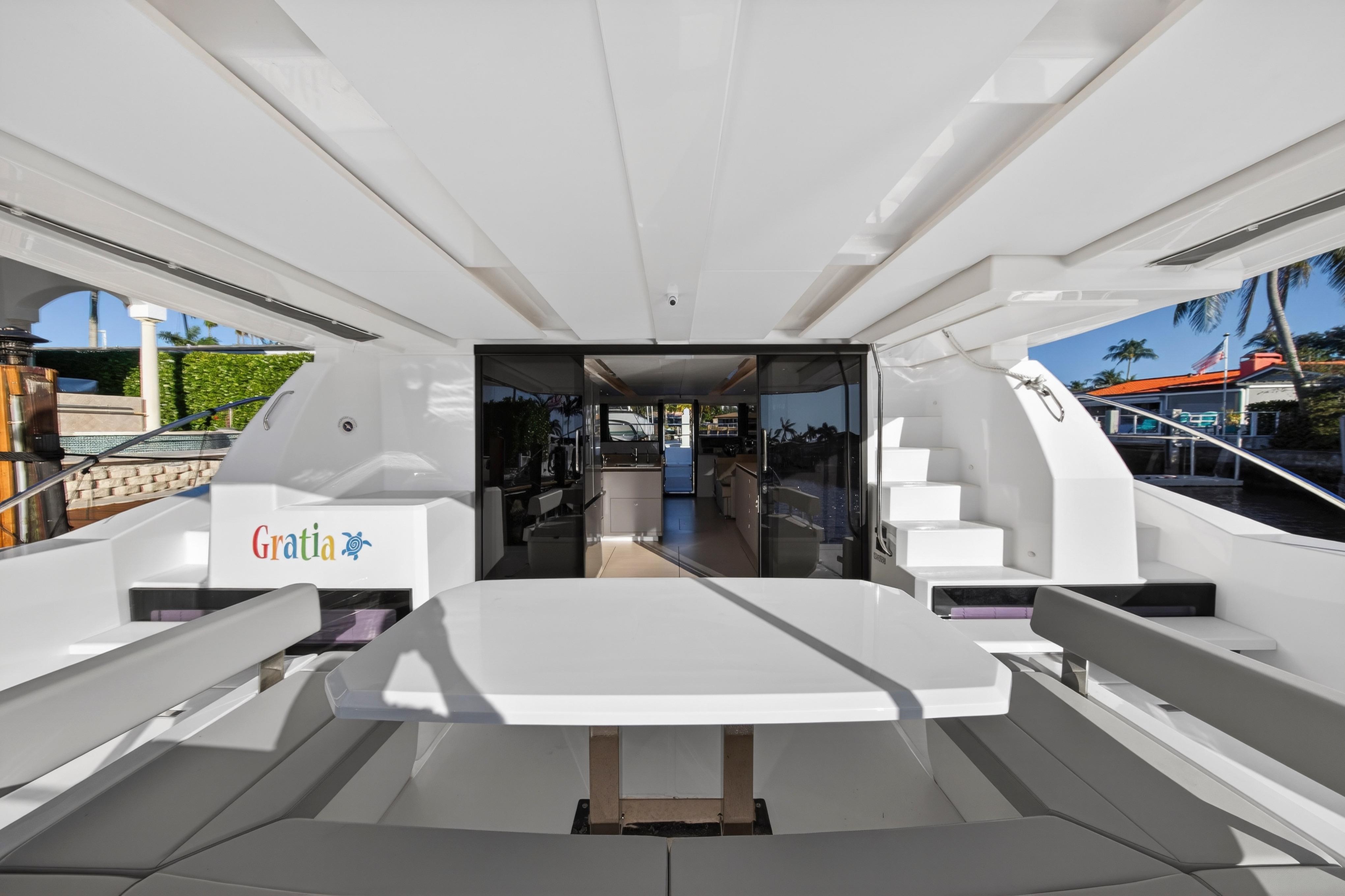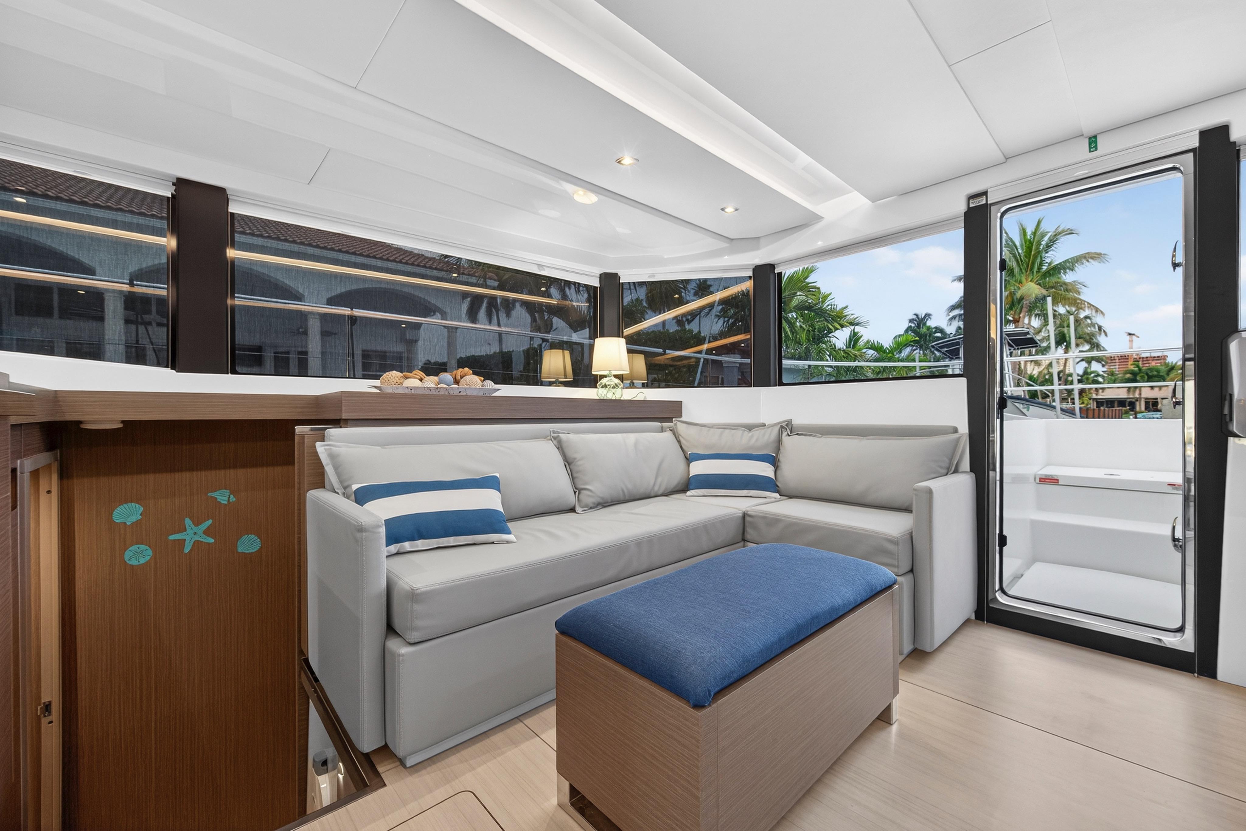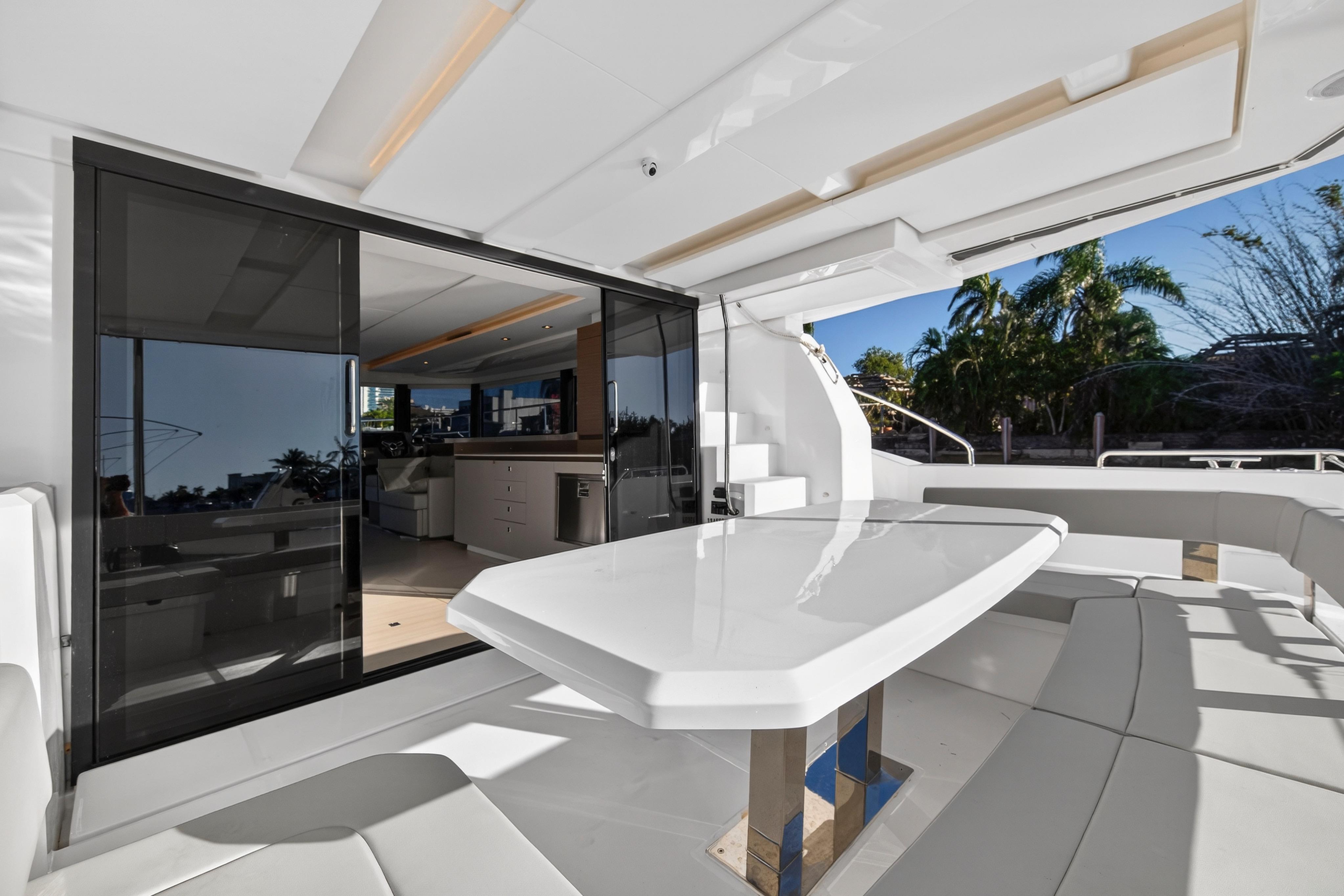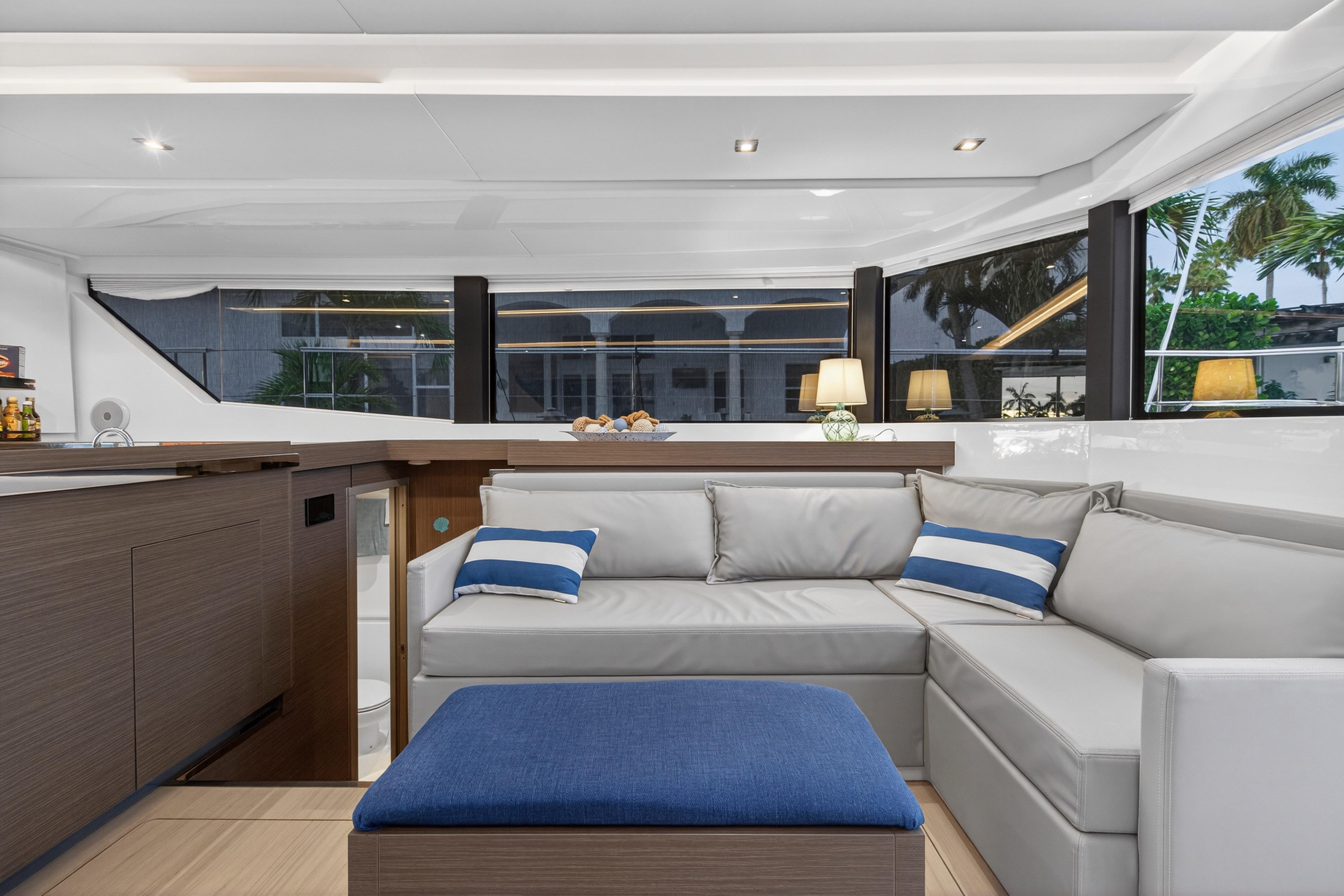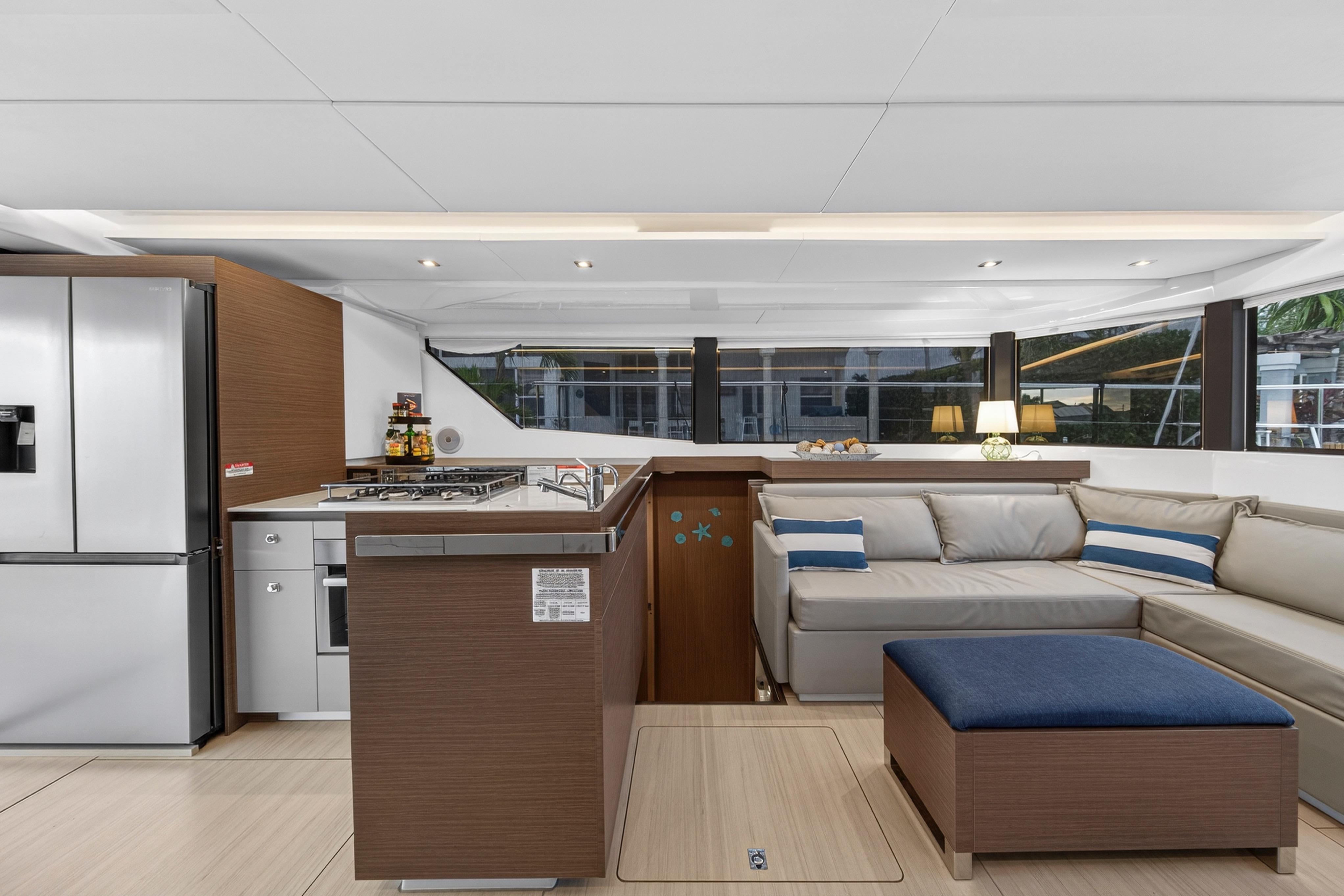 Venture inside and discover every anticipated detail, from the recessed LED task lighting to the new, soft furnishing for the settees. Gloss white galley locker doors and countertops can be upgraded to a matte beige finish. The Galley Serving Area, an additional space at the aft end of the saloon, provides an extended entertainment area complete with a large counter for food and drink preparation, ample storage lockers for crockery and food and a drinks locker.