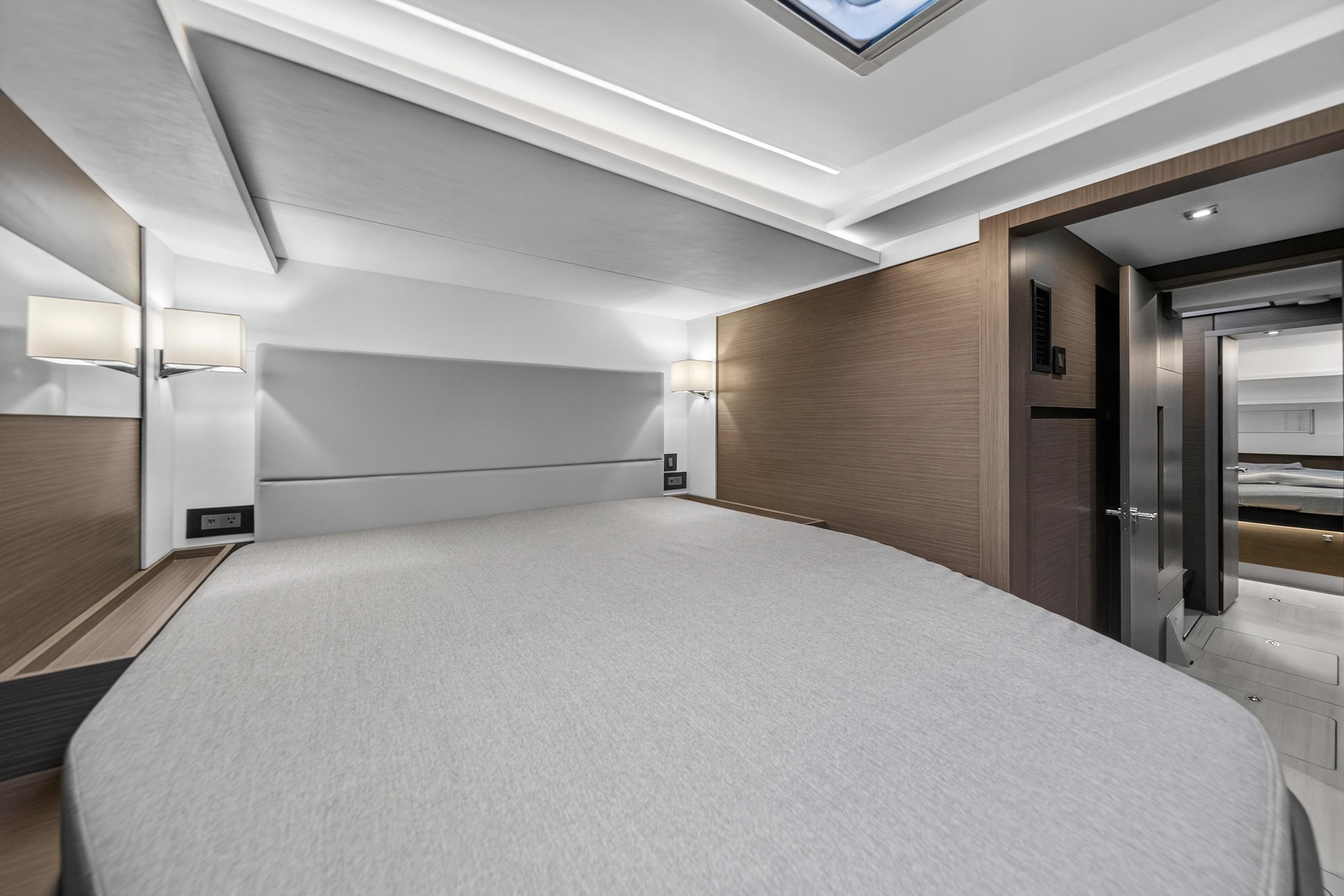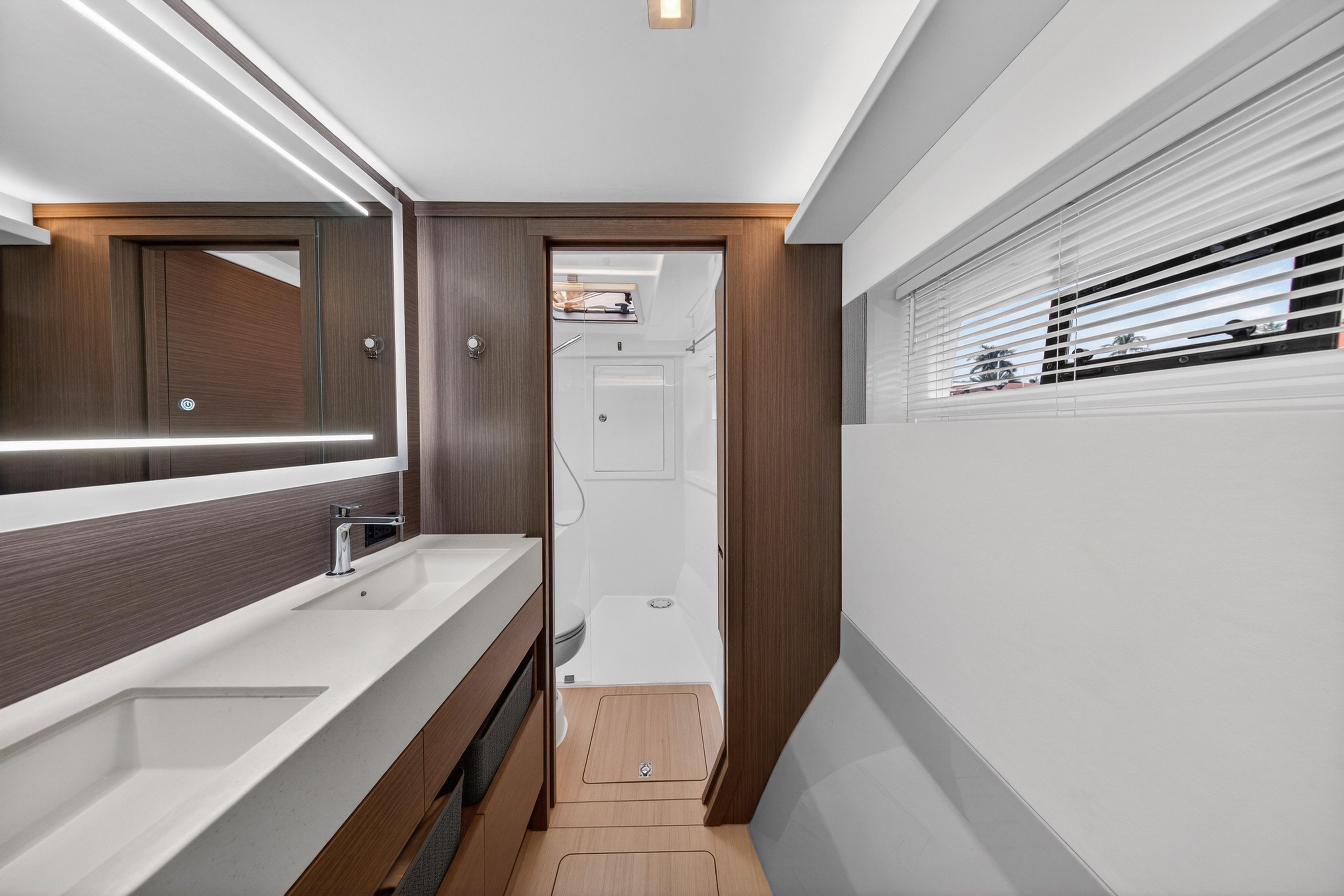 Private quarters, three-cabin layout with ensuite heads, are inviting with generous floorspace and wide bunks that are accessible from each side. Here, you can move about effortlessly and set up home with all your personal effects. Most notably, cabins feel like true private quarters, with comfortable beds, soft furnishings and smart lighting that avoids glare and dark spots and instead casts warm, consistent lighting throughout the room. All cabins include their own private ensuite heads, with the primary suite head featuring a vanity mirror with a semi-translucent perimeter strip and concealed lighting. The three-cabin owner's suite boasts a large walk-in closet, desk, and double vanity.