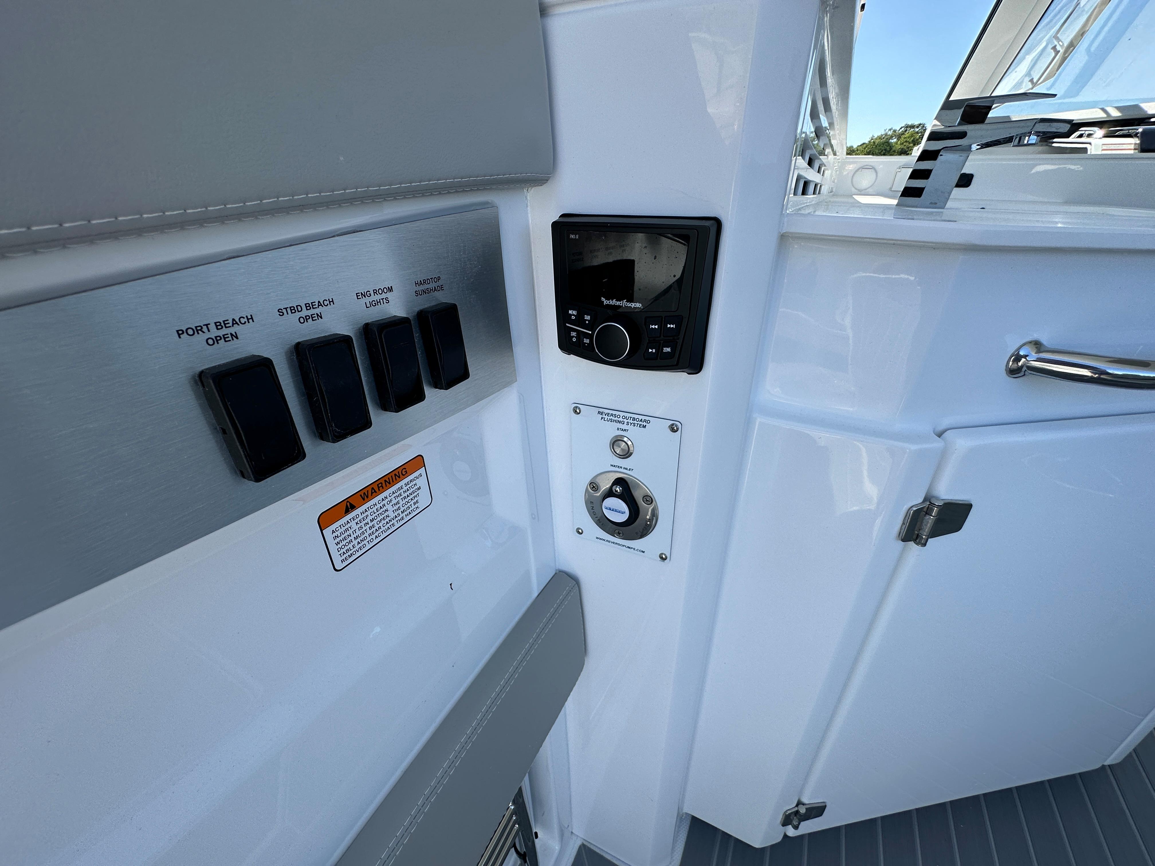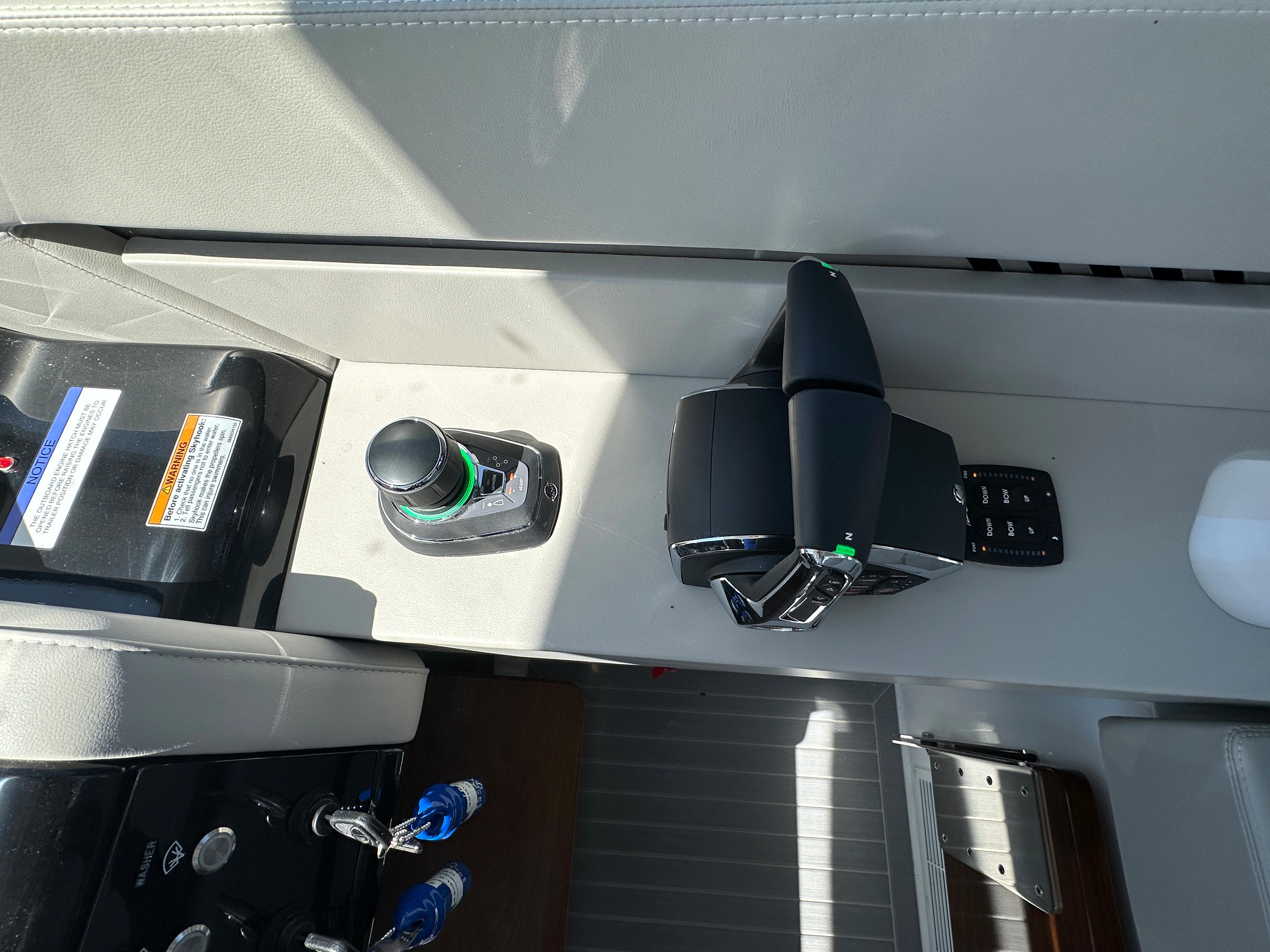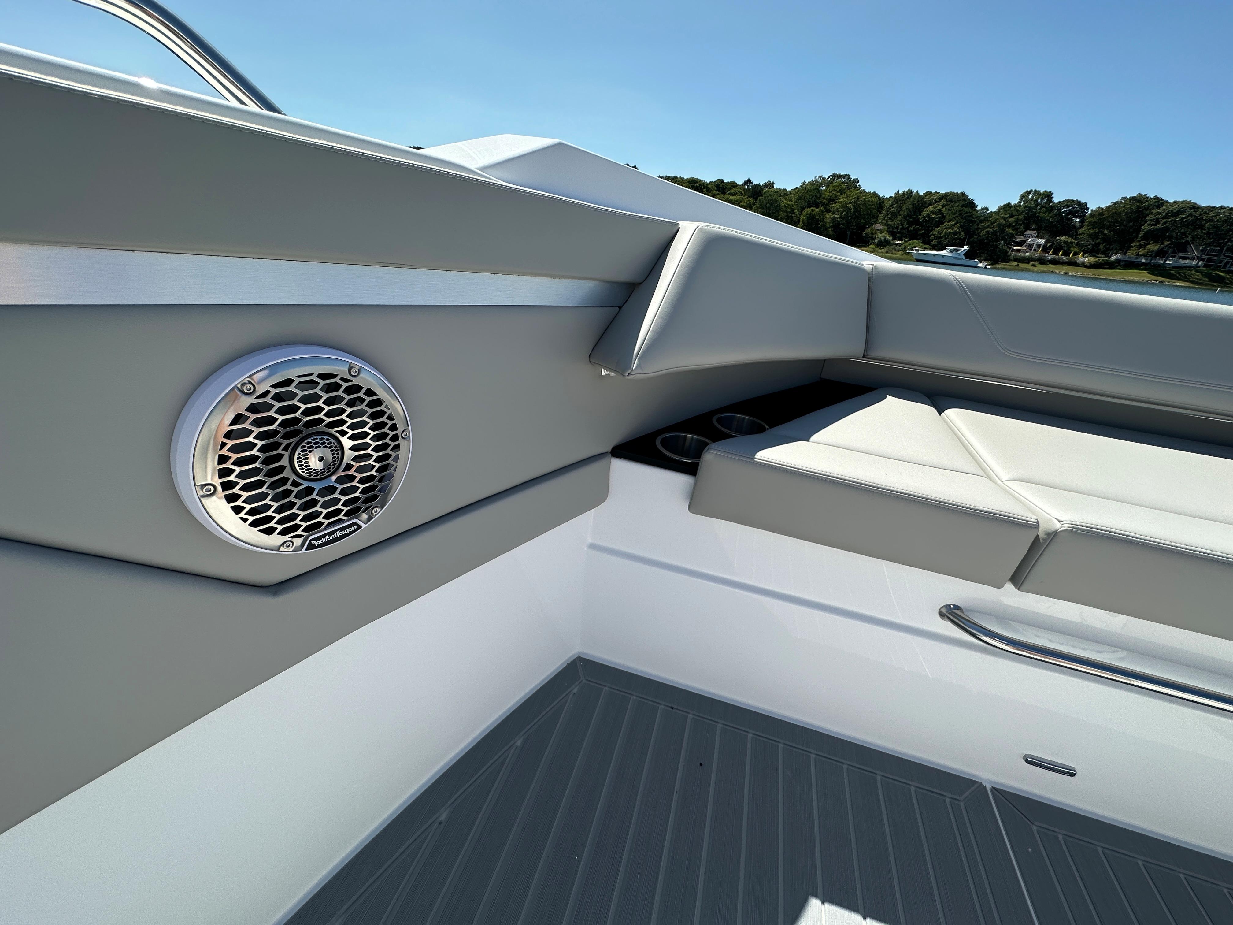 Finished in a clean white hull with Kingston Gray hull band, the cockpit is appointed in Dolphin Gray Ultraleather, complemented by a white hardtop with black and Dolphin Gray accents. Power is provided by twin Mercury White 600hp outboards with joystick control, paired with upgraded dual 16" displays for confident handling and performance.