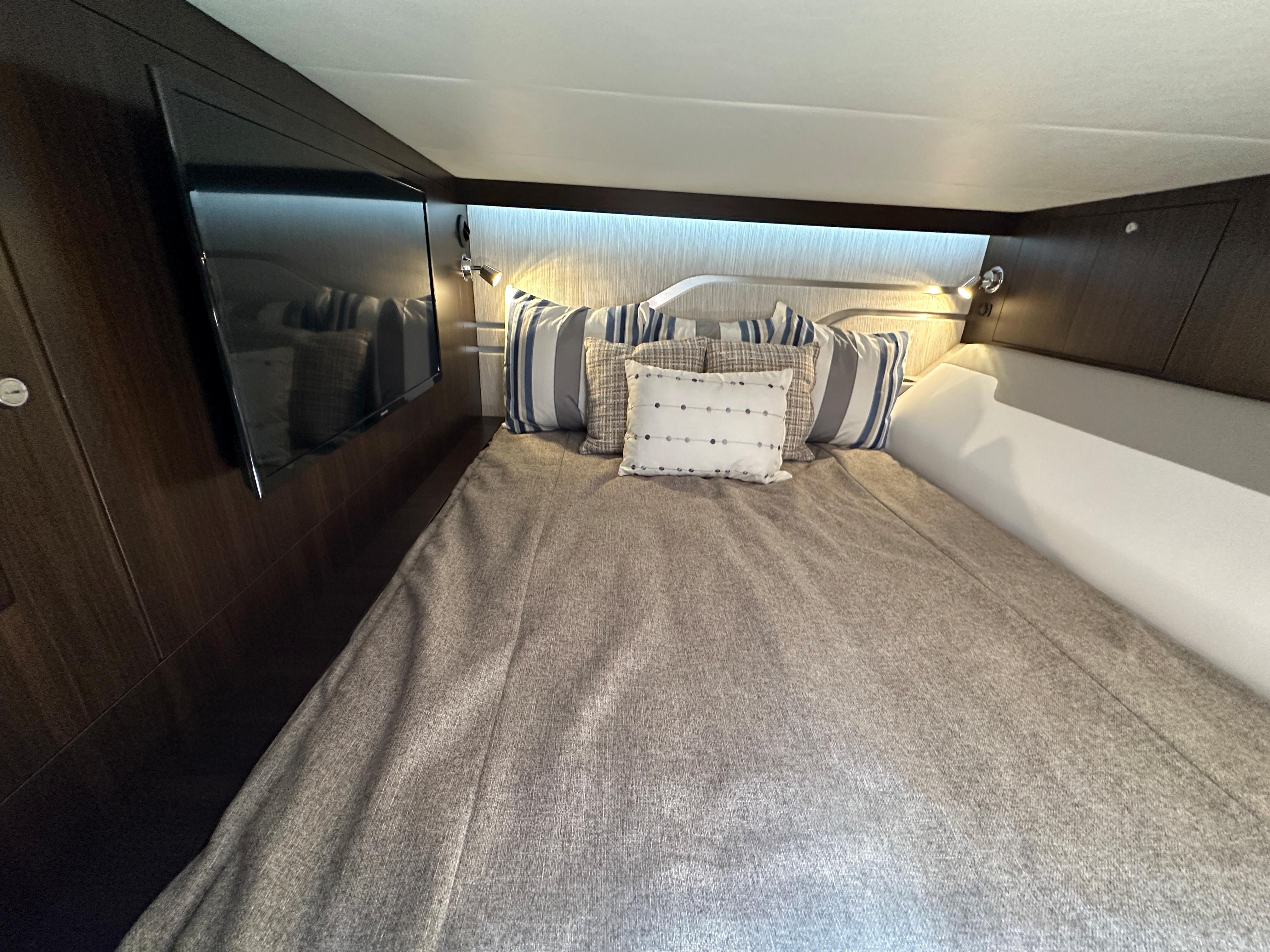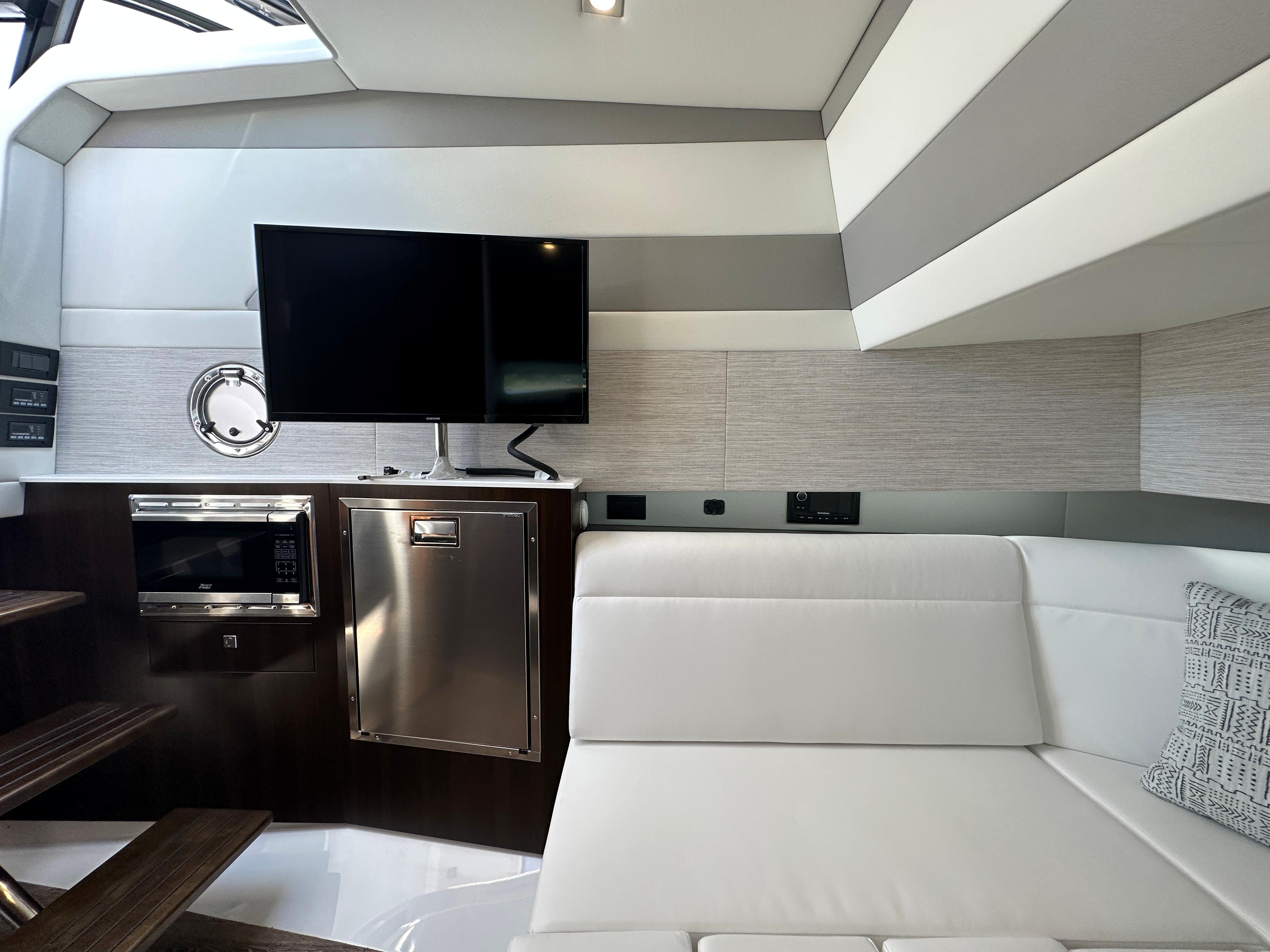 Below deck, the yacht is equally impressive with an aft stateroom, a U-shaped dinette that converts into an additional berth, a full galley, and a standing head with shower, delivering comfort well beyond its class.