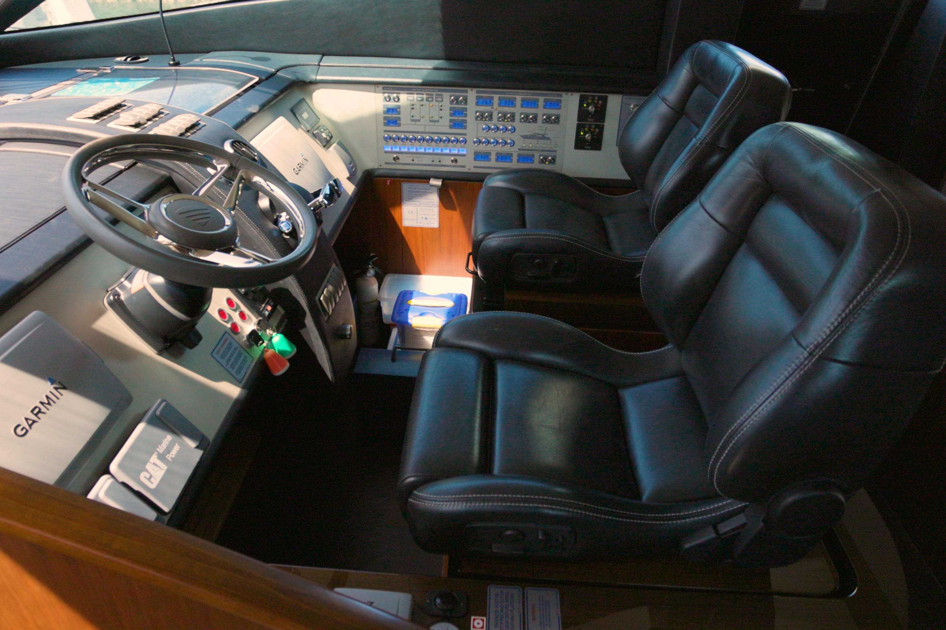 Powered by twin 2014 Caterpillar diesel engines, this vessel delivers impressive performance with sophisticated refinement. The direct-drive propulsion system, featuring propeller shafts with side-power fin zero-speed stabilizers, ensures smooth, efficient cruising and exceptional maneuverability.