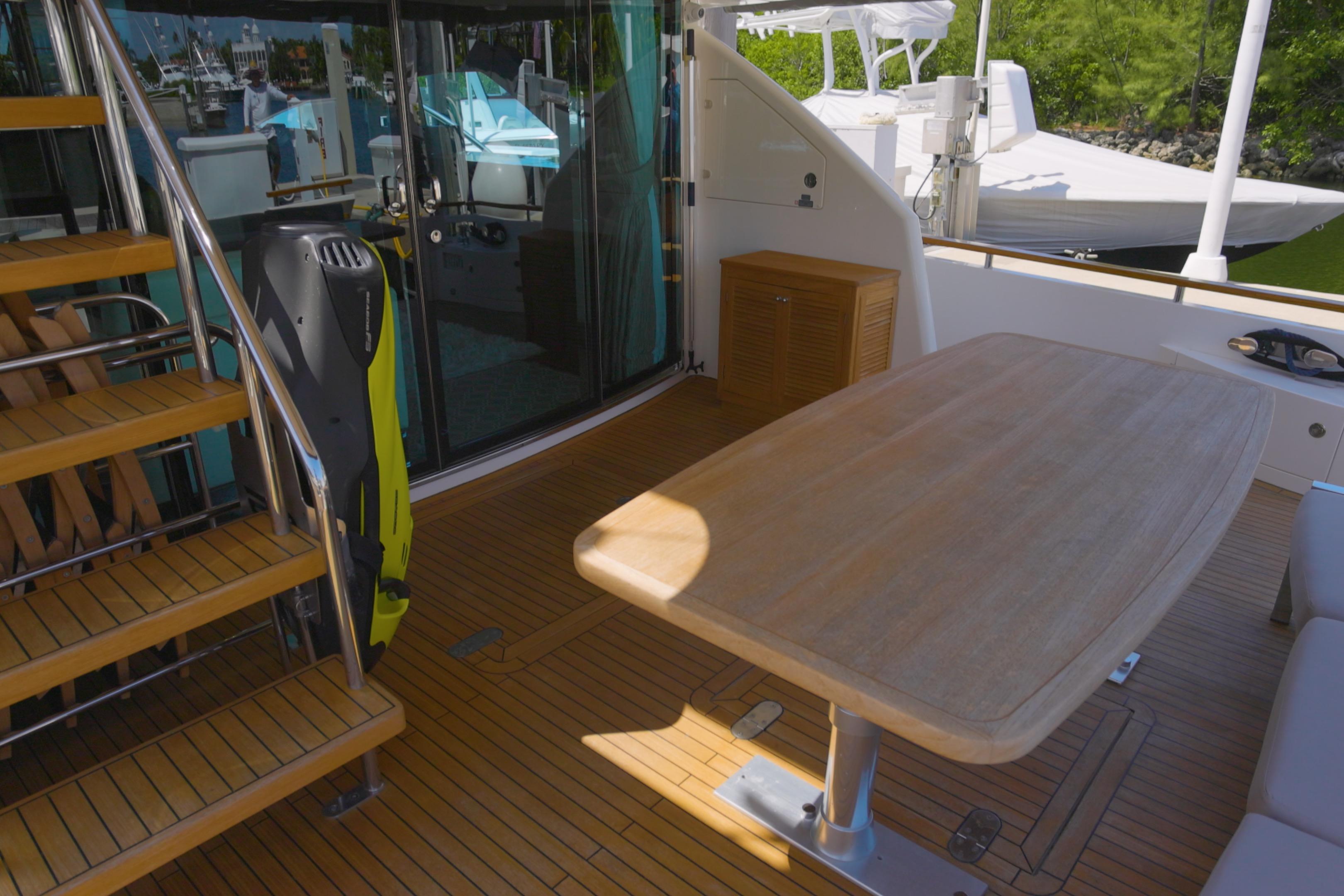 • Ample hard-top flybridge with two tables and generous seating areas