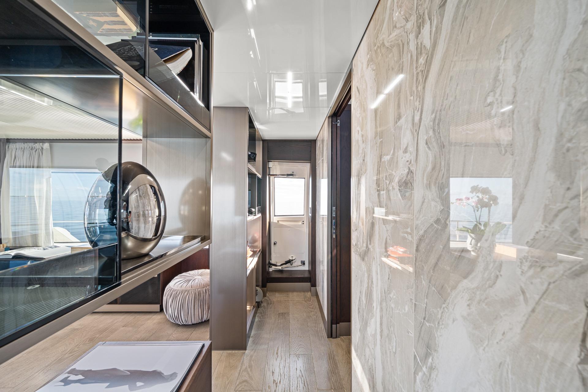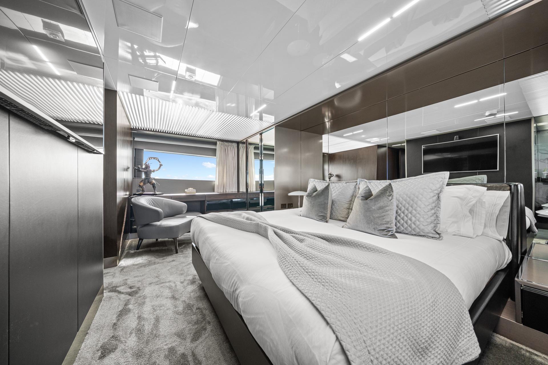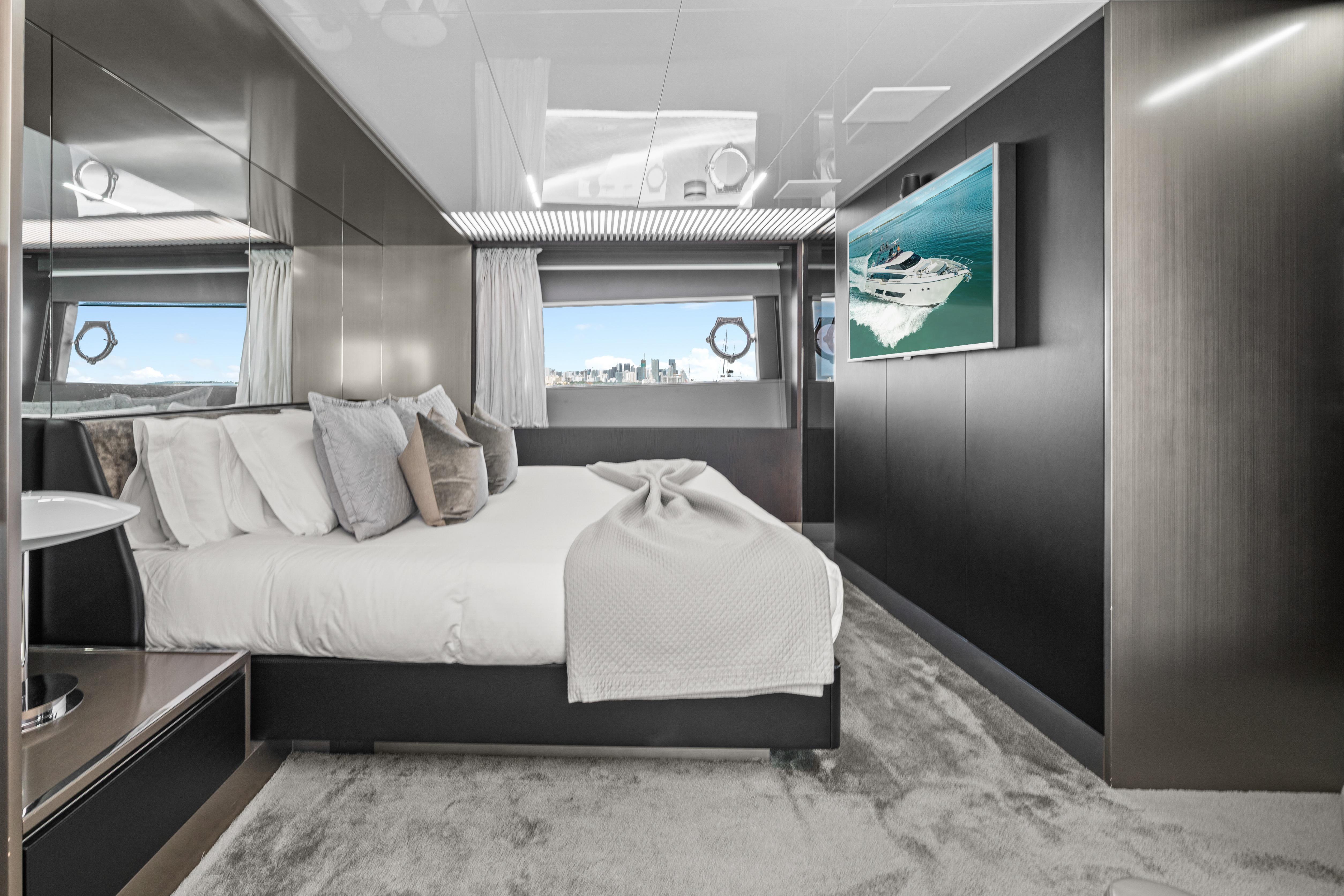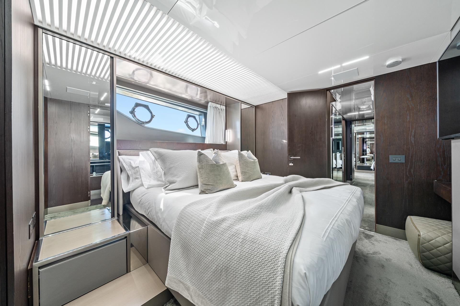 Below deck, the yacht accommodates guests in luxurious staterooms, including a spacious full-beam master suite, all designed to maximize comfort, privacy, and natural light. Each cabin reflects Ferretti’s attention to detail and high standards of build quality.