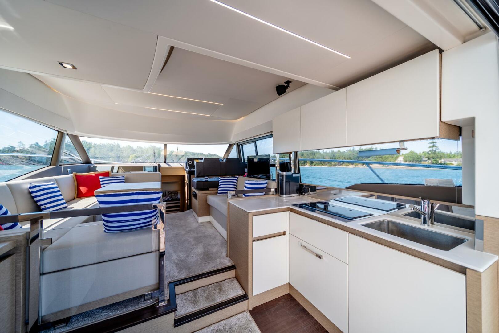 - Raised up U-shaped seating for 5 on the port side which surrounds an expandable dining table plus opposing lounge seating for 2 to starboard