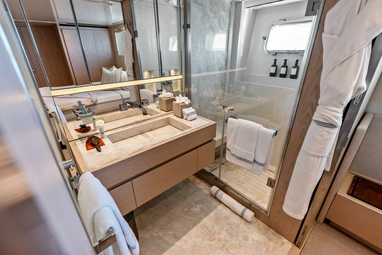 Located on the main deck forward is the on deck owner’s suite. Access to this stateroom is on the starboard side with private entry from the side deck or the salon. Features a study area with a privacy door, leading to a full beam stateroom, with all the features one would expect on a world class yacht. Further forward is a full beam ensuite with private his and hers WCs, divided by an expansive 2-person marble lined shower, complete with a rain shower “bed”.