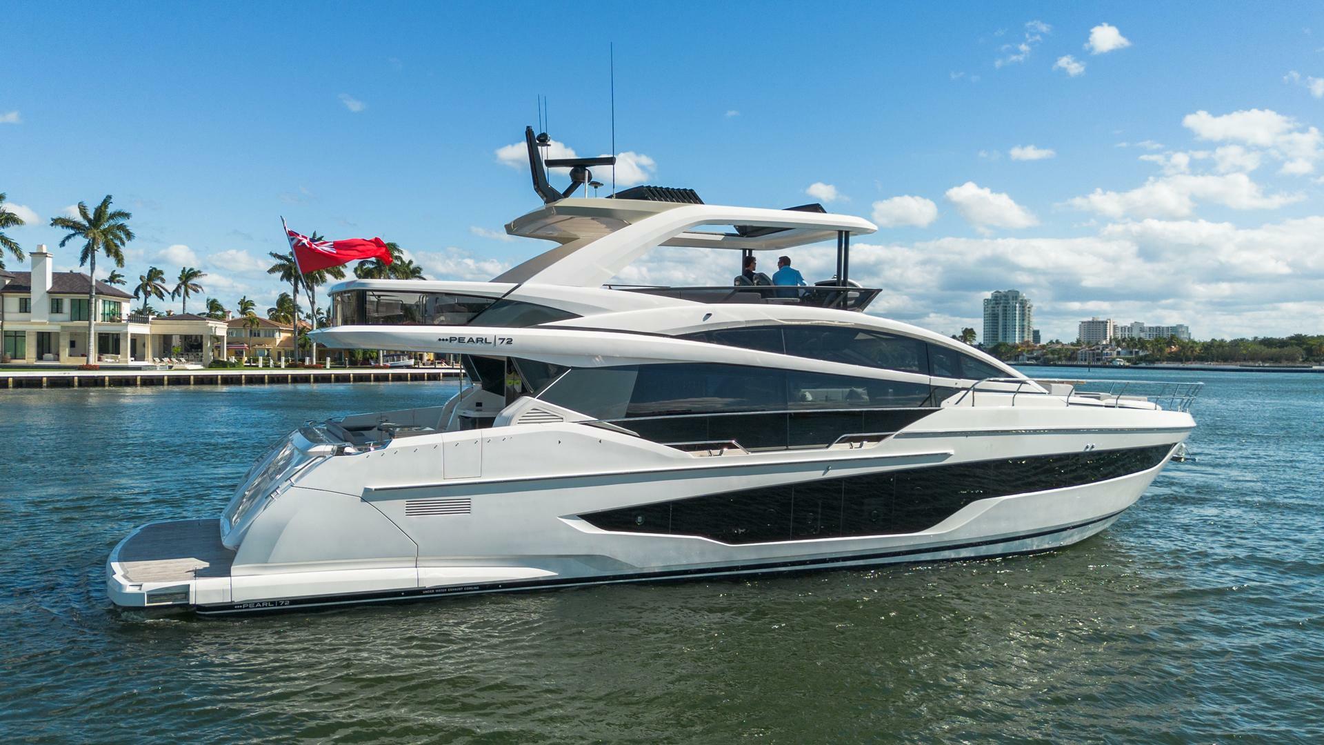 Introducing the Pearl 72—a luxurious yacht with 4 guest cabins, 4 heads, crew cabin, & space for a rib and Seadoo spark. Enjoy ocean views from the hydraulic swim platform, fold-down wings, and Kelly Hoppen interior. Powered by MAN engines & Seakeeper Stabilization.