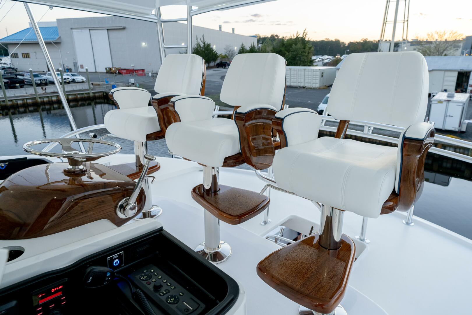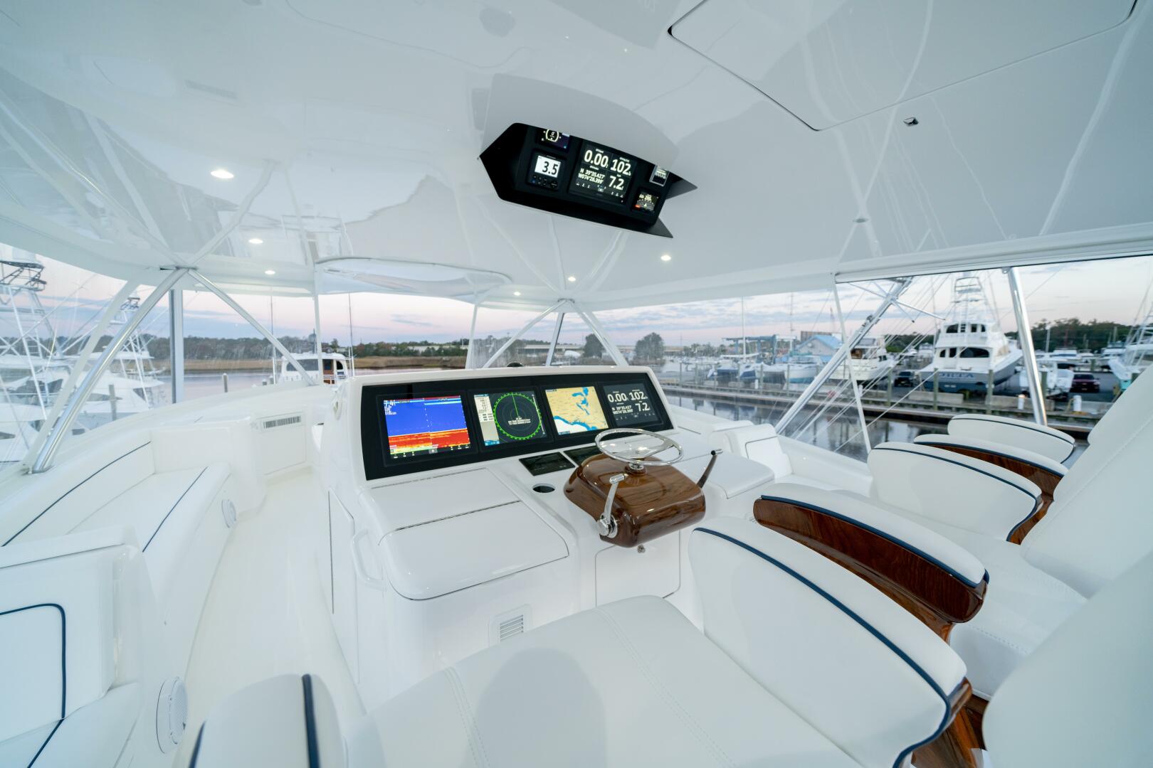 The cockpit measures 224 square feet, with a 203-gallon transom fishbox/live well and a pair of full-length 103-gallon insulated in-deck fishboxes. Access to the Seakeeper 35 is provided by a single powered hatch on the centerline, a watertight design introduced with recent Viking 80 demonstrator boats, and the cockpit sole is built with reinforcement for a fighting chair, rocket launcher, or table.