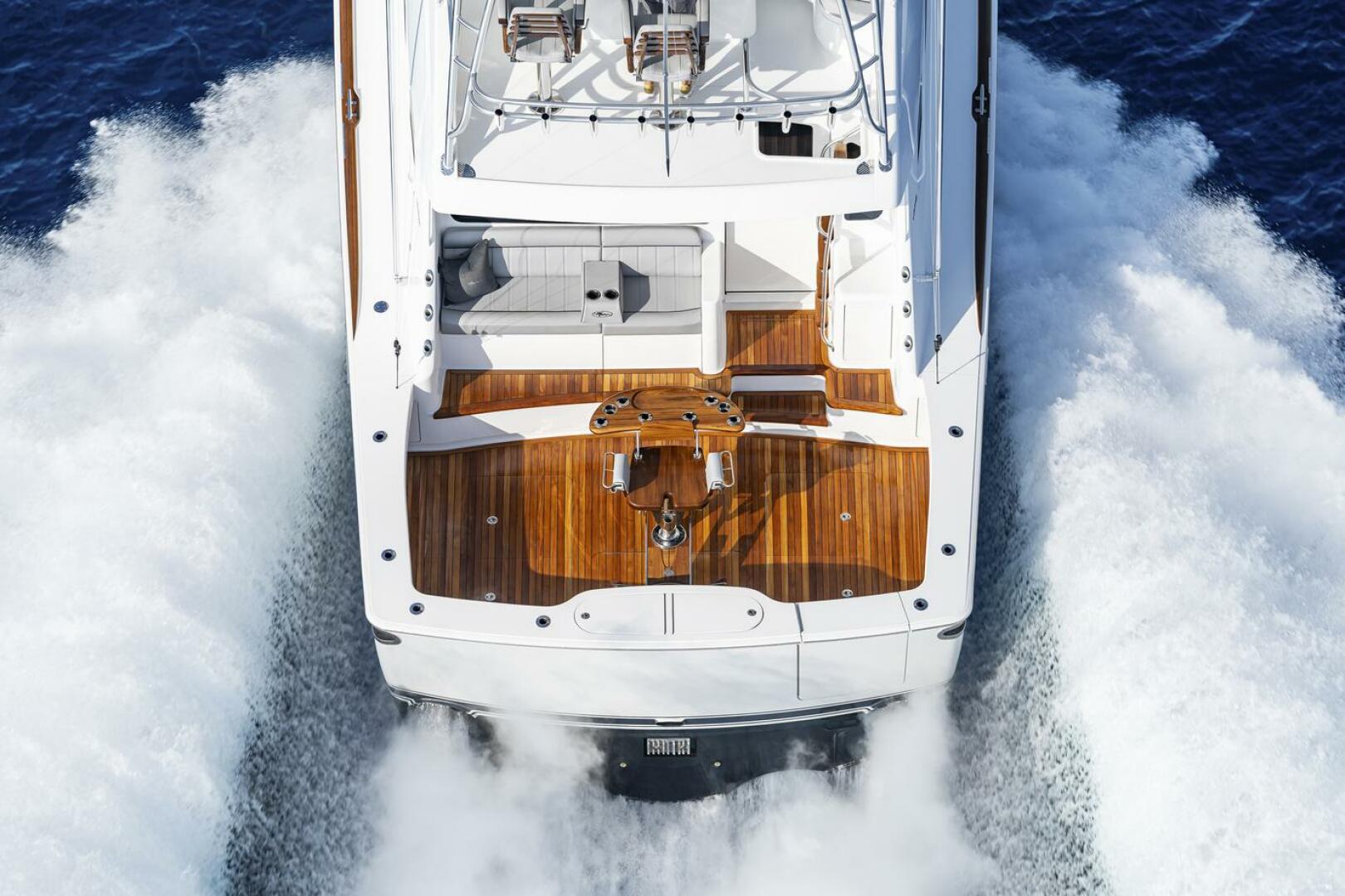 The flybridge features a streamlined walk-around center console with a recessed black acrylic dash holding two 22-inch touchscreen Multifunction Displays (MFDs). The captain has excellent sightlines to the cockpit, and a dropdown electronics box can be integrated into the fiberglass hardtop, just forward of another space dedicated for teaser reels. A lounge – with armrests and drink holders – is integrated into the forward section of the console, with storage beneath. Additional padded bench seating is to port and starboard. Immediately to starboard of the helm is a refrigerated drink box. And the 50's length-to-beam ratio has been optimized for maximum speed and a soft, dry ride.