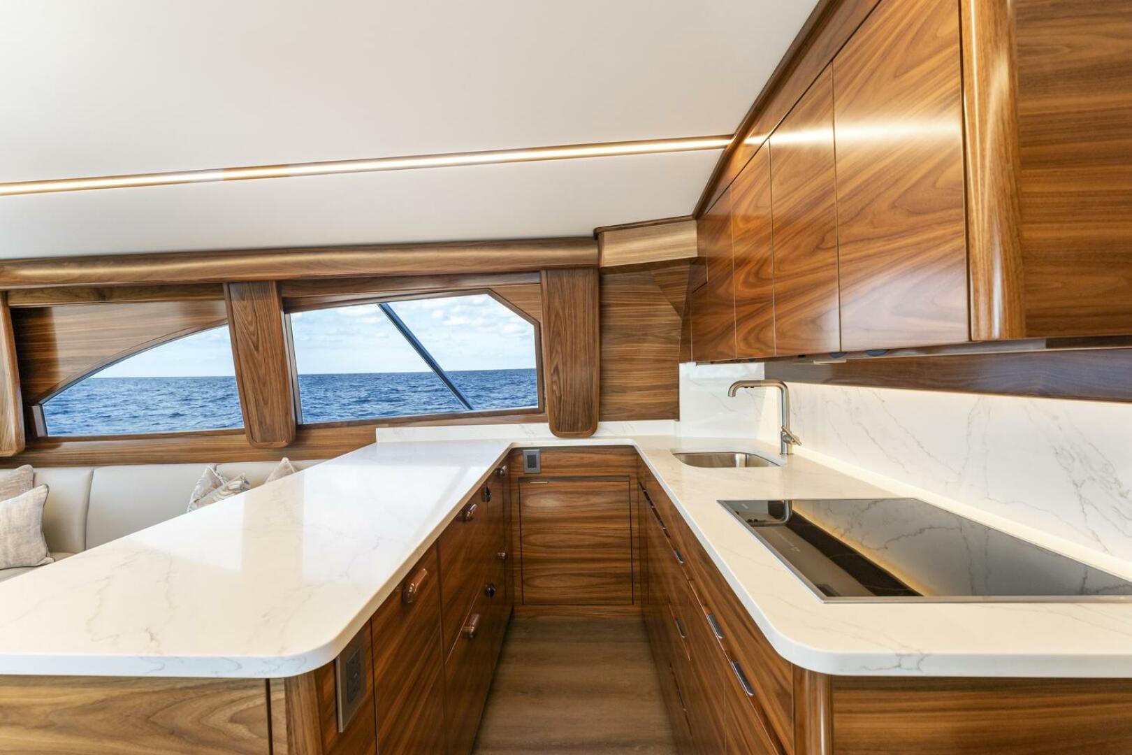 The business end centers around the 131-square-foot cockpit, which is equipped with large, insulated in-deck fish boxes that can be refrigerated. The transom holds a live well that doubles as a fish box or a place to store gear. Anglers have toe-kick space in every direction and rounded coamings for comfort. The boat is engineered for the installation of a Seakeeper 10 or 14, with the unit mounted in a dedicated space on centerline.Call a Viking Specialist today.