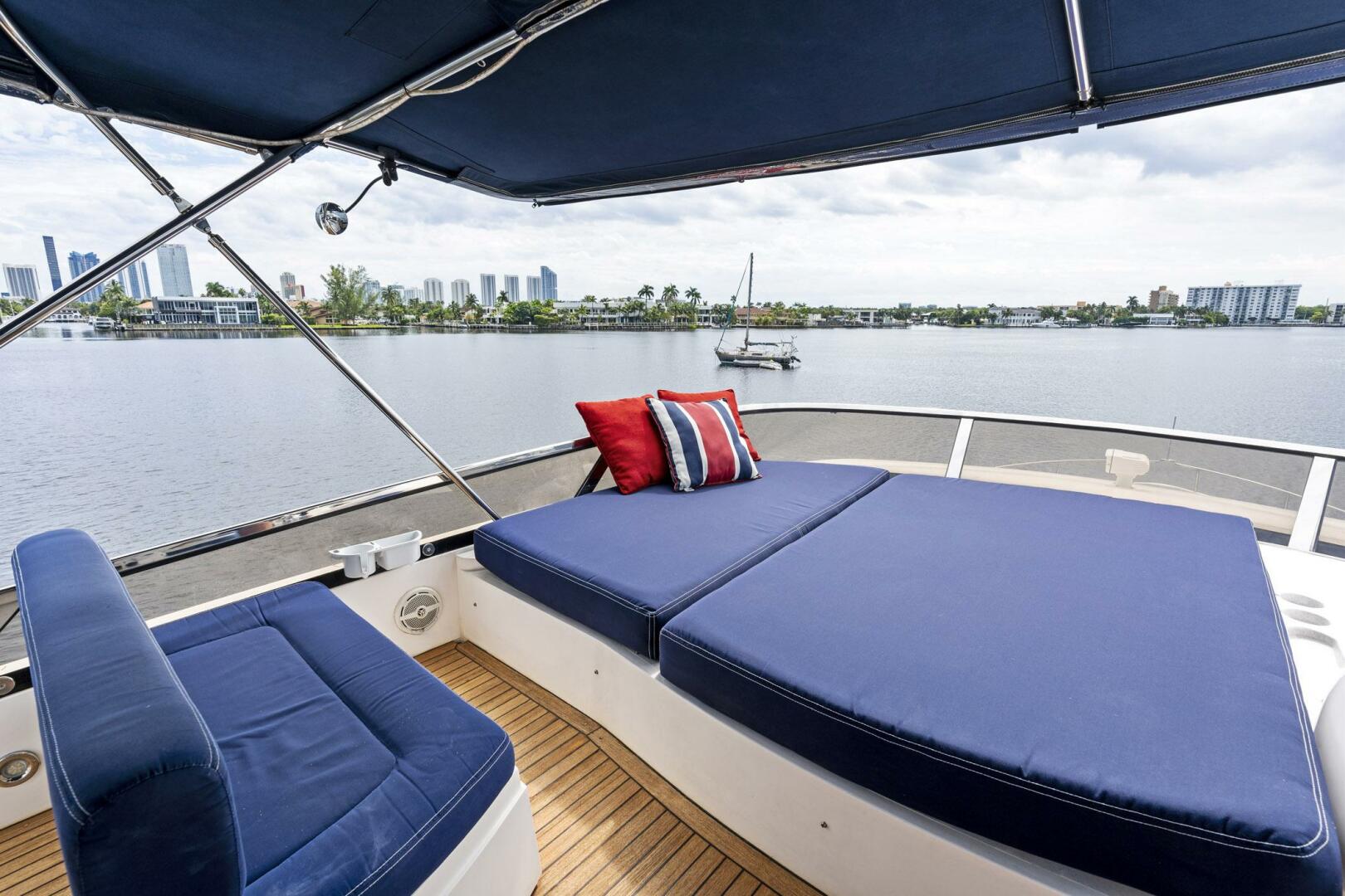 Her layout features a full-beam master suite, forward VIP cabin, two twin guest cabins, and crew quarters, comfortably accommodating up to eight guests. The salon is bright and inviting, with generous seating and seamless flow to the aft deck. Expansive lounging and dining areas on the bow, cockpit, and oversized flybridge make her ideal for family cruising or entertaining.