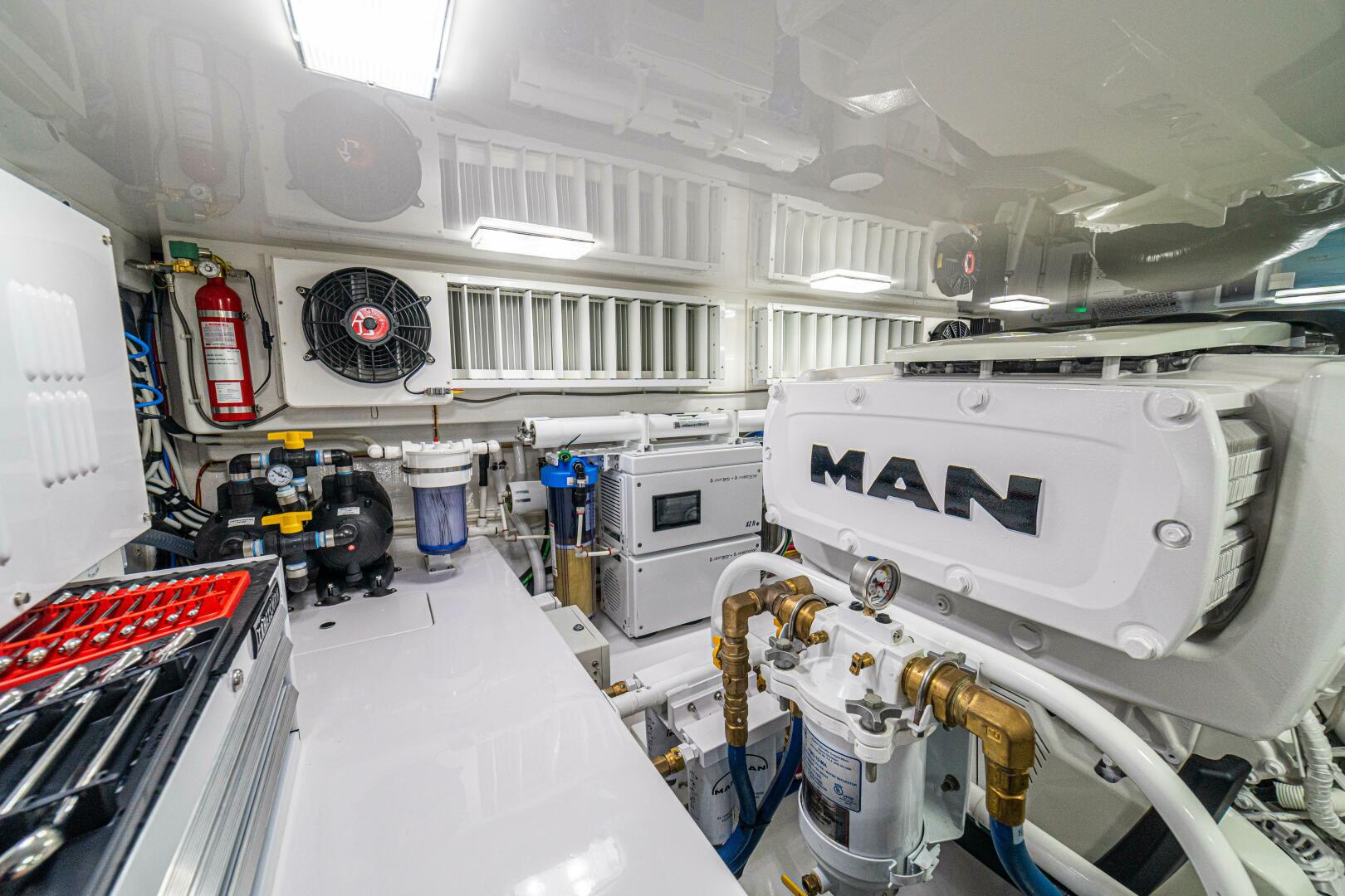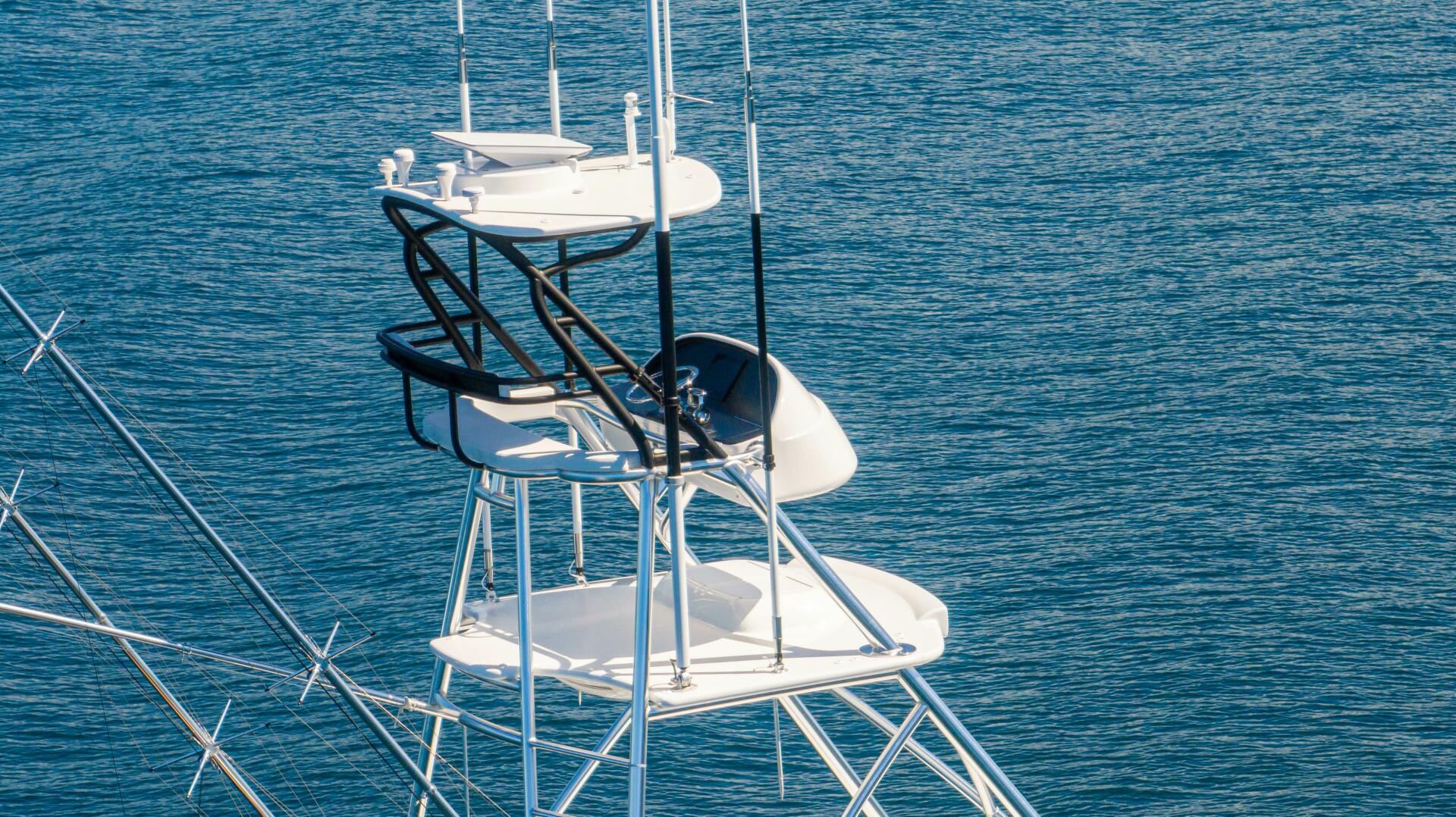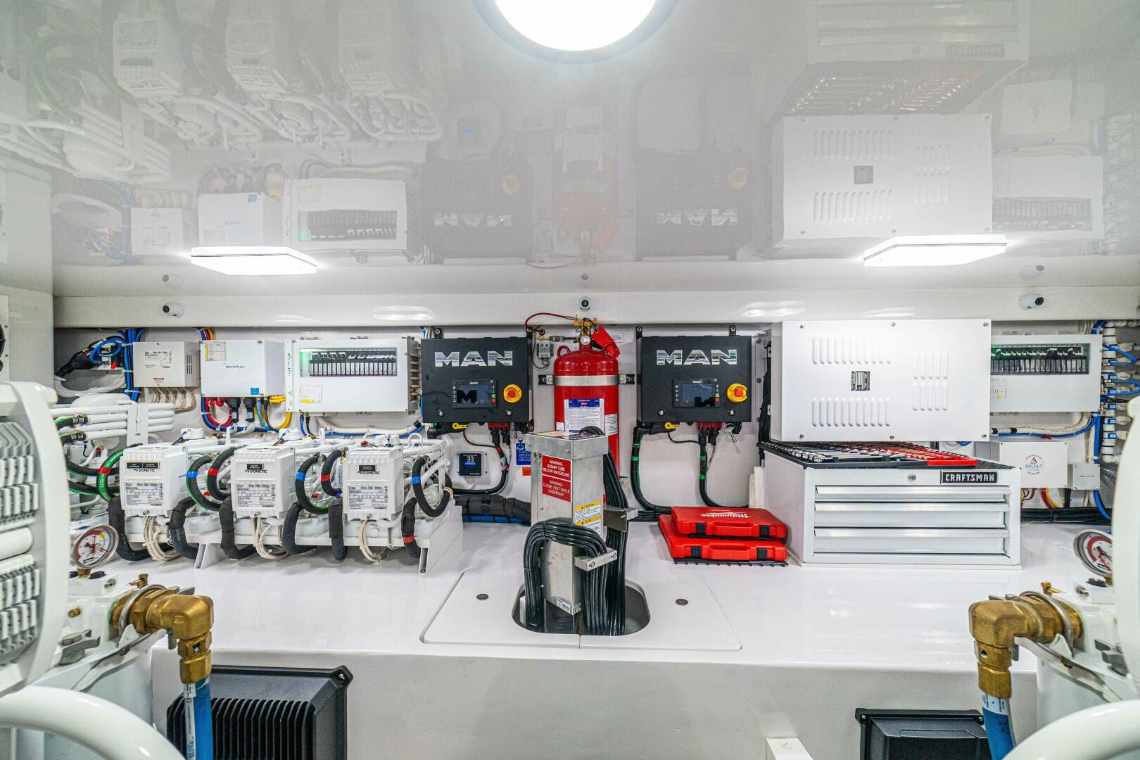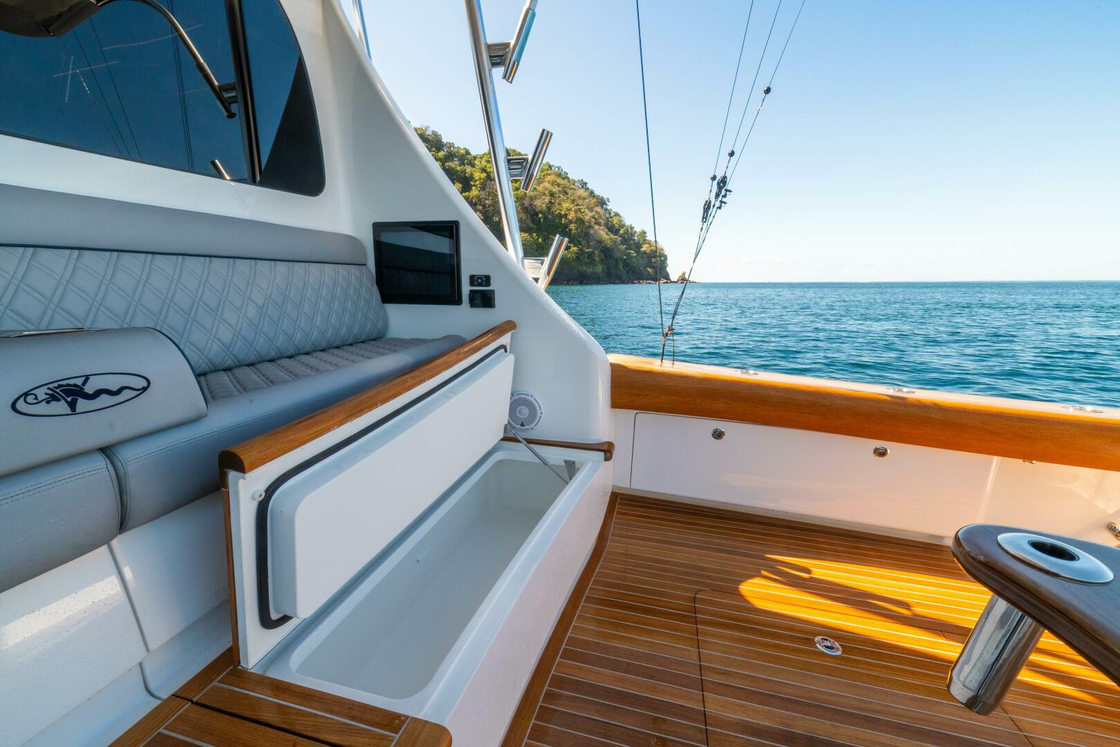The observation mezzanine is designed to keep guests cool and dry thanks to the flybridge overhang, as well as clear of the crew working in the cockpit. For those in warm climates, mezzanine air conditioning is an option. To starboard, freezer and cooler space is provided under the mezzanine seating. A centerline hatch opens with stainless steel gas pistons for excellent access to the engine room. The port side holds more cooler storage and a tackle cabinet with drawers.