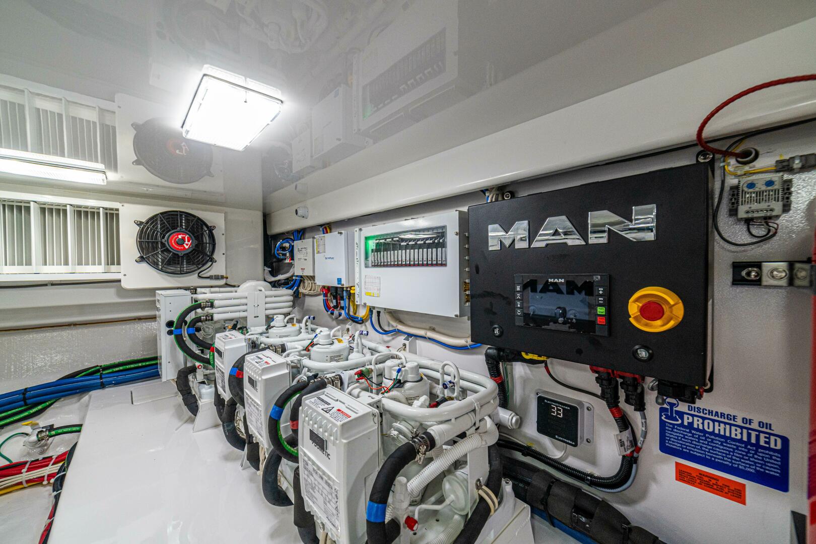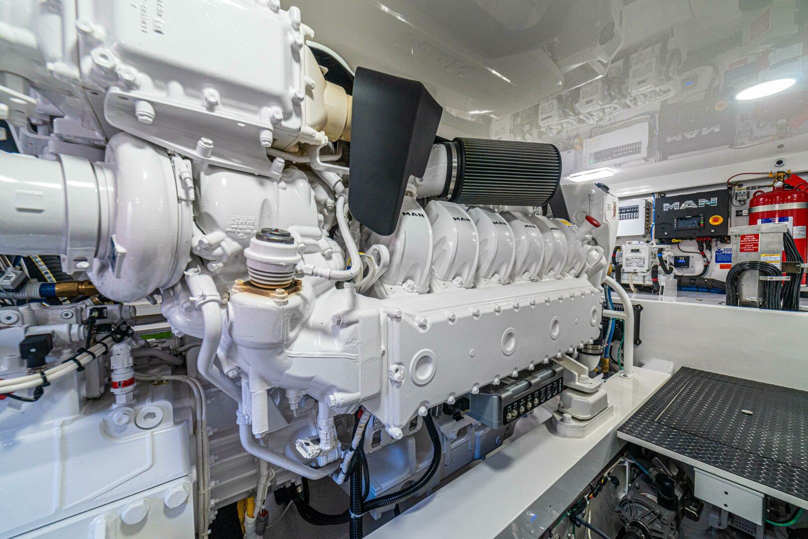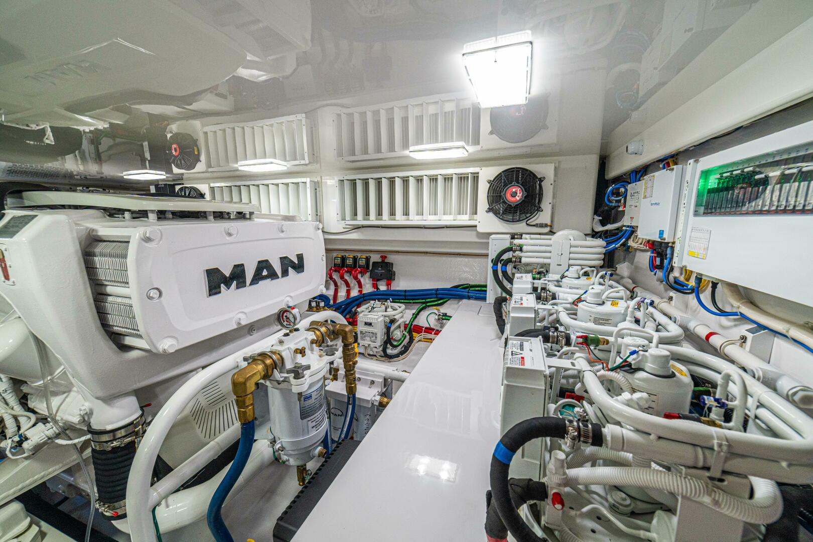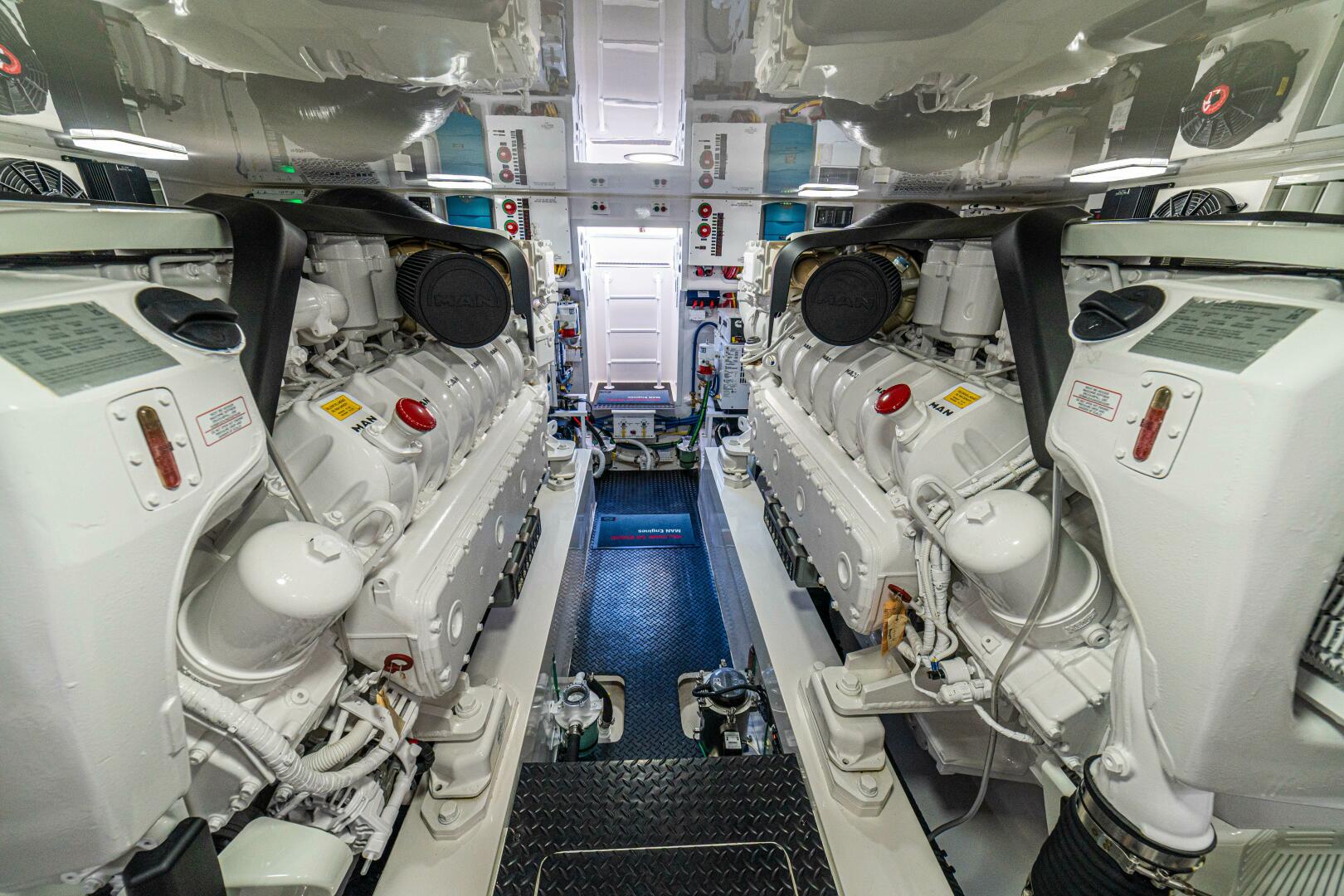 The observation mezzanine is designed to keep guests cool and dry thanks to the flybridge overhang, as well as clear of the crew working in the cockpit. For those in warm climates, mezzanine air conditioning is an option. To starboard, freezer and cooler space is provided under the mezzanine seating. A centerline hatch opens with stainless steel gas pistons for excellent access to the engine room. The port side holds more cooler storage and a tackle cabinet with drawers.