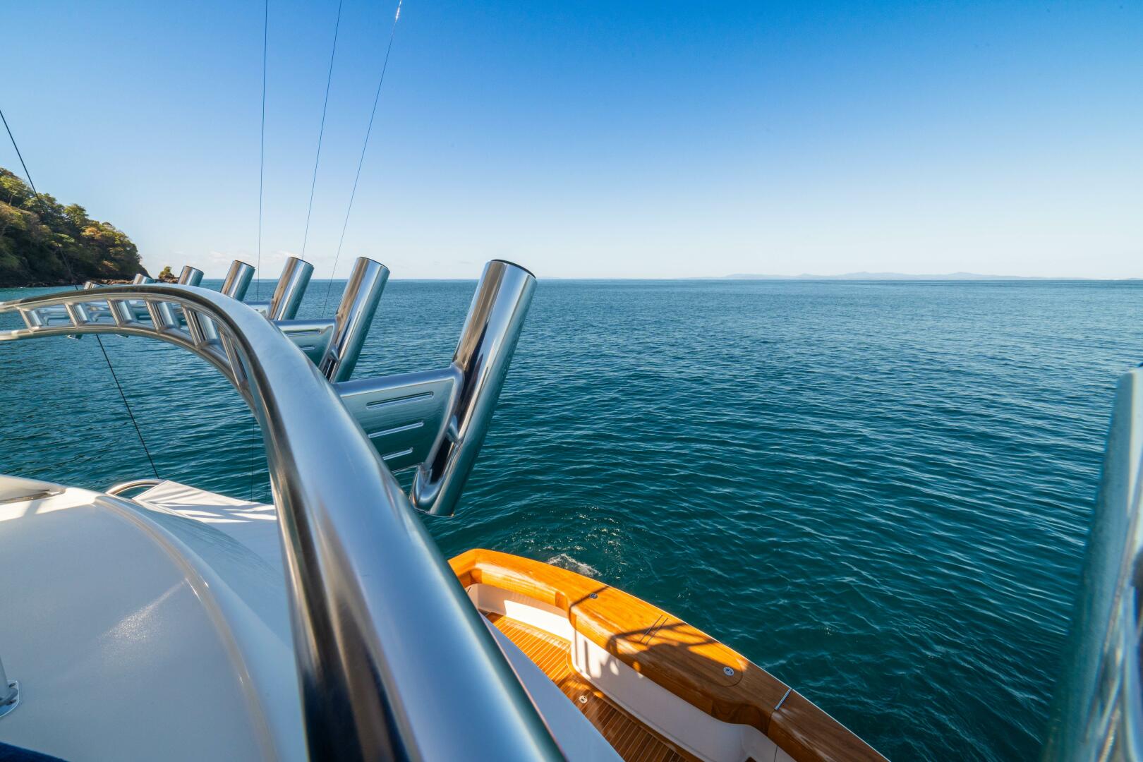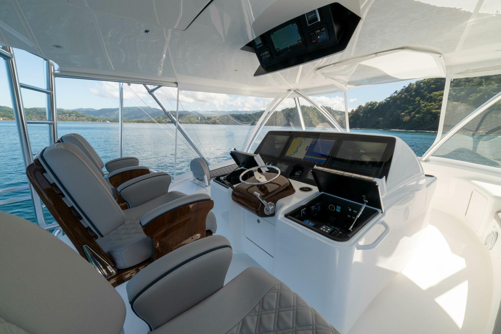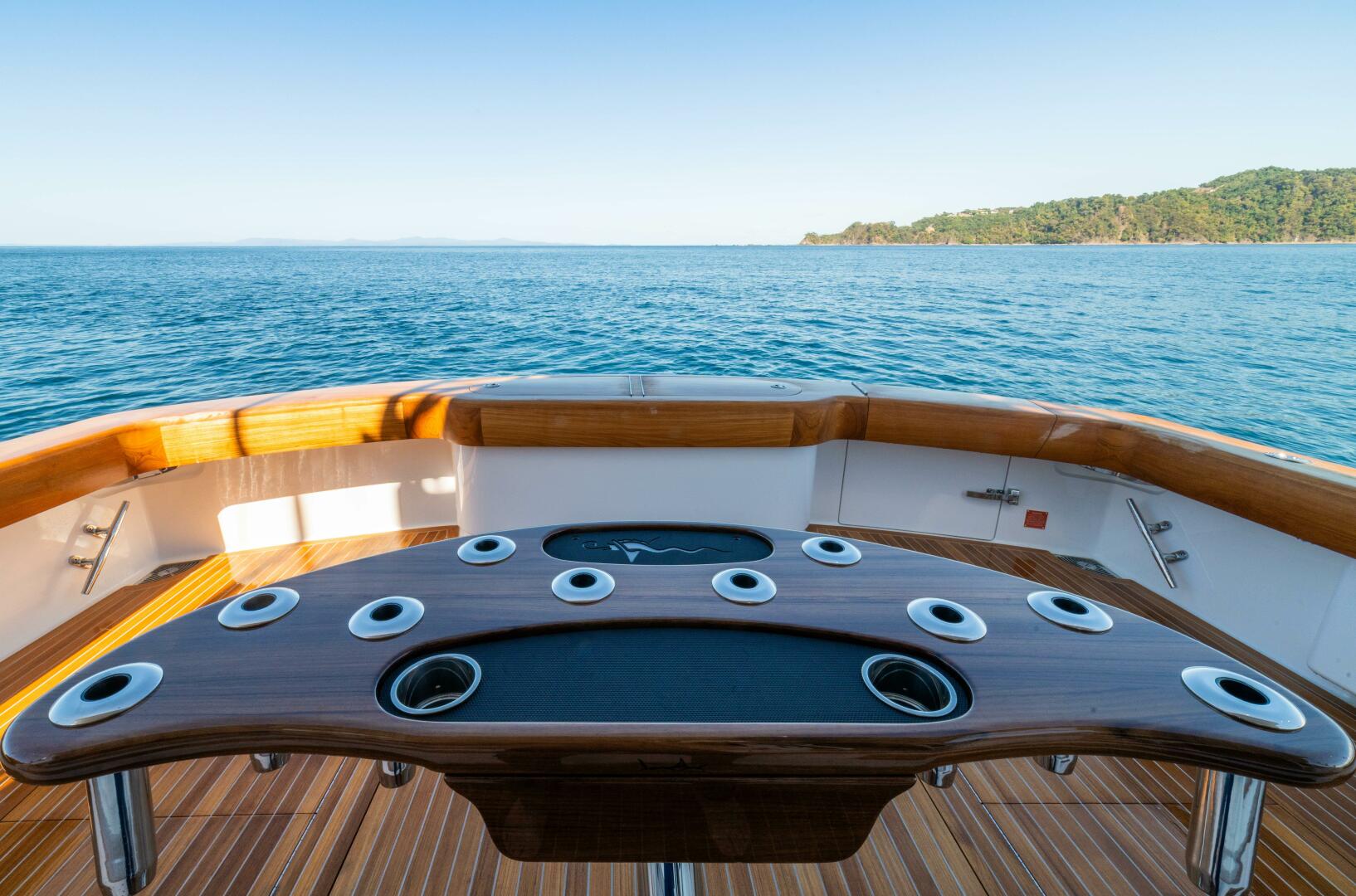 The 180-square-foot cockpit is clean, streamlined and maximizes freedom of movement, with easy access to storage and service areas. Standard equipment is substantial. Flush rod holders; fresh and raw-water wash down systems; transom fish box with live well, rounded coamings with indirect rope lighting below; side lockers for tag stick and gaff storage; quick disconnect fitting for oil changes for the engines, transmissions and generator; port and starboard in-deck insulated fish and stowage boxes and optional in-deck live well; and stereo speakers are all part of the package.
