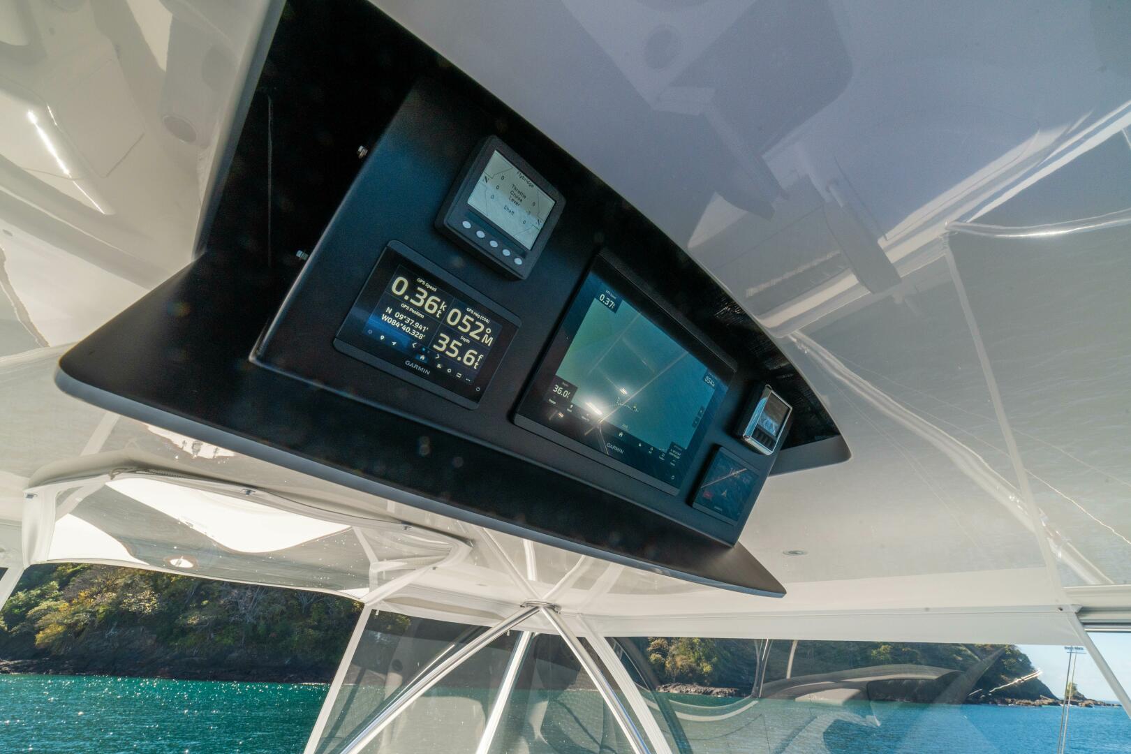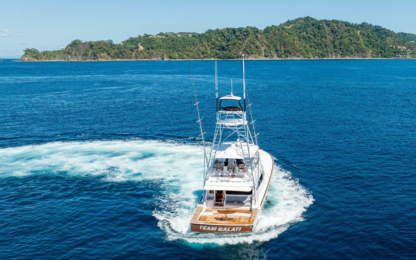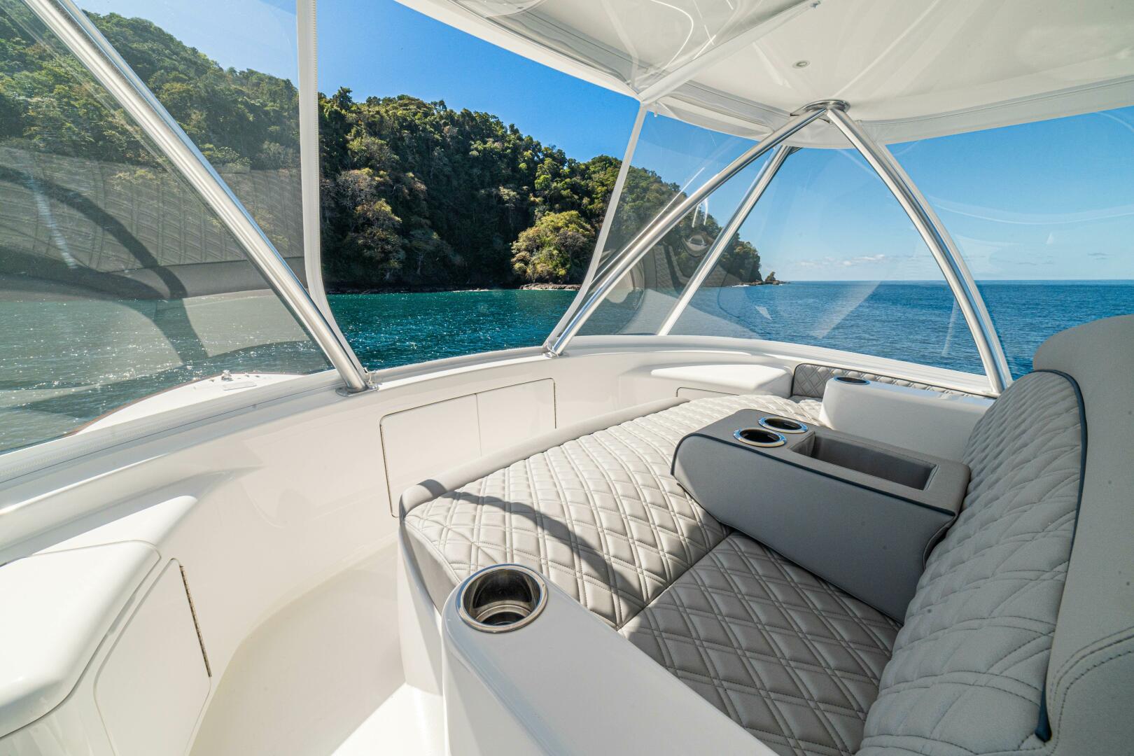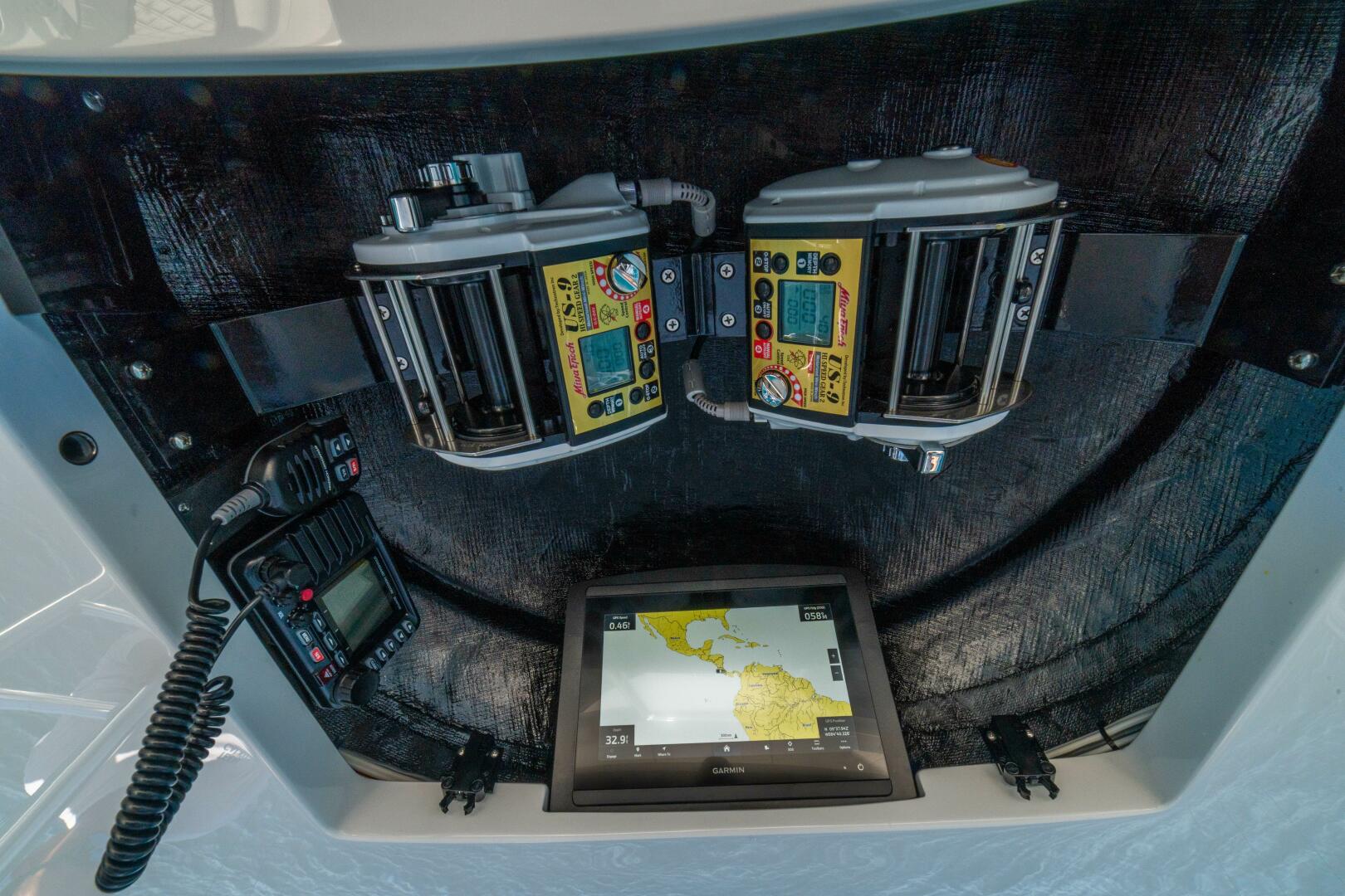 The 180-square-foot cockpit is clean, streamlined and maximizes freedom of movement, with easy access to storage and service areas. Standard equipment is substantial. Flush rod holders; fresh and raw-water wash down systems; transom fish box with live well, rounded coamings with indirect rope lighting below; side lockers for tag stick and gaff storage; quick disconnect fitting for oil changes for the engines, transmissions and generator; port and starboard in-deck insulated fish and stowage boxes and optional in-deck live well; and stereo speakers are all part of the package.