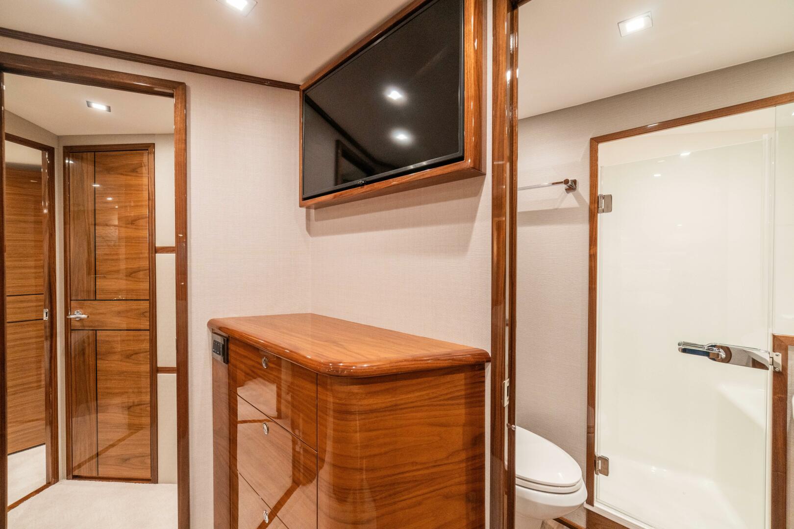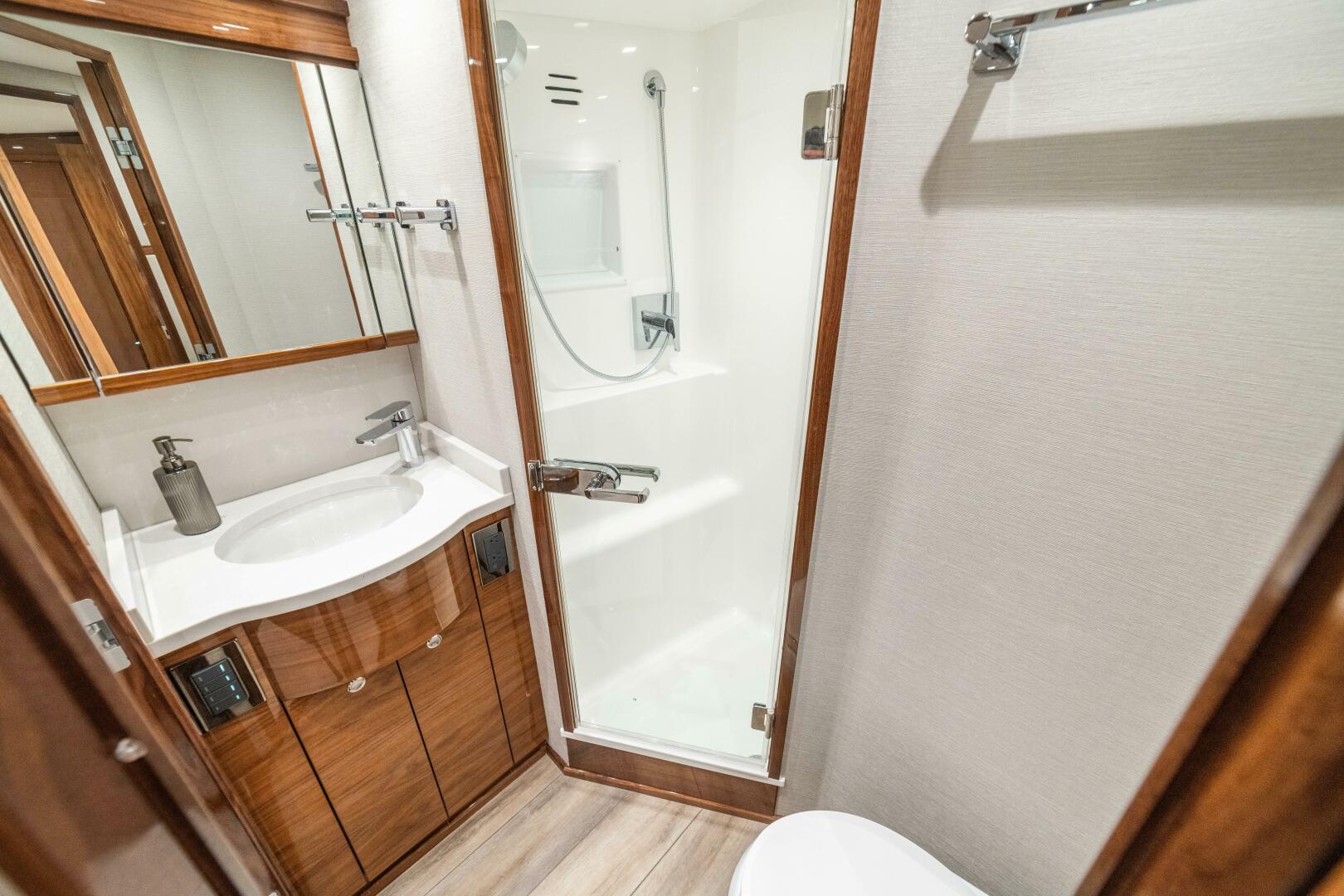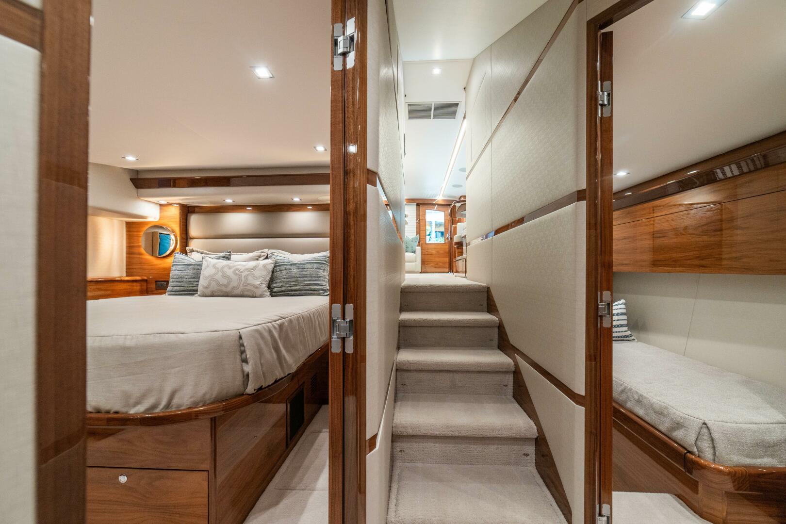 Like the salon, the port-side companionway and four staterooms feature premium carpeting, air conditioning and LED lighting. The companionway is home to a convenient washer and dryer behind a walnut door. The master and forward staterooms each feature queen-size walk-around berths with custom inner-spring mattresses with ample storage underneath, HD TVs and ensuite heads. A crossover berth arrangement is also available in the forward cabin as an option. To starboard you’ll find the spacious midship master, appointed with his-and-hers maple-lined hanging lockers, a credenza, end tables on each side of the bed and an HD TV. The forward guest stateroom forward also provides hanging locker storage, as well as cabinets on the port and starboard sides of the bed and a Bomar foredeck hatch.