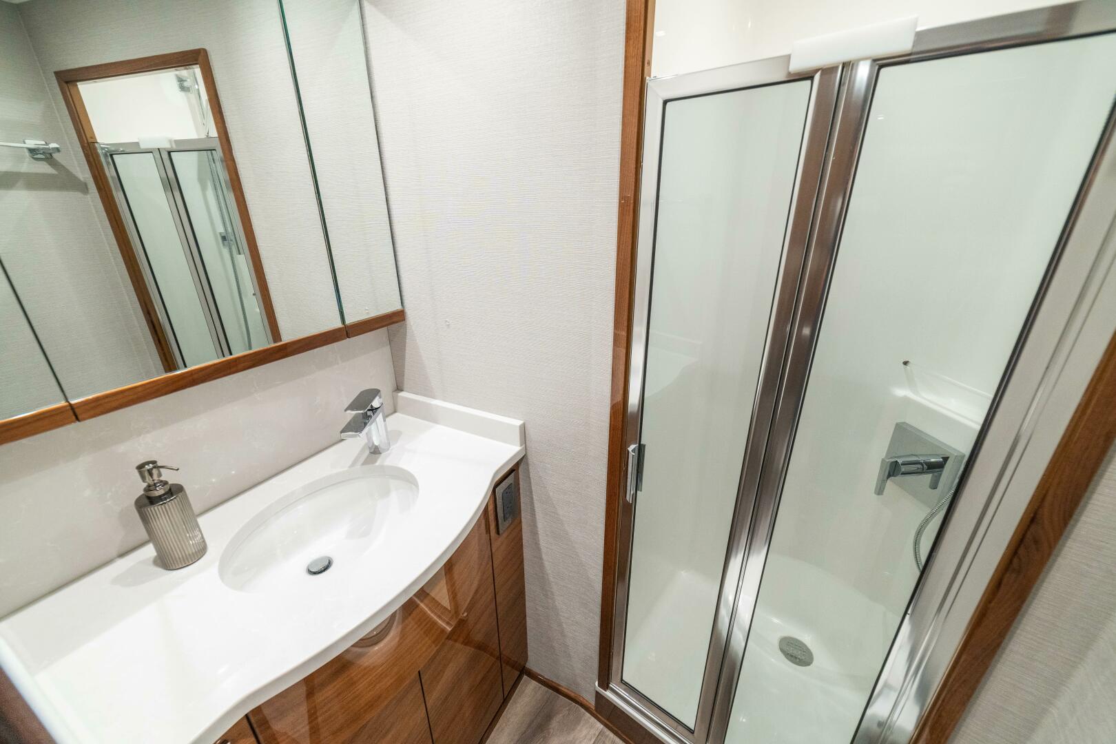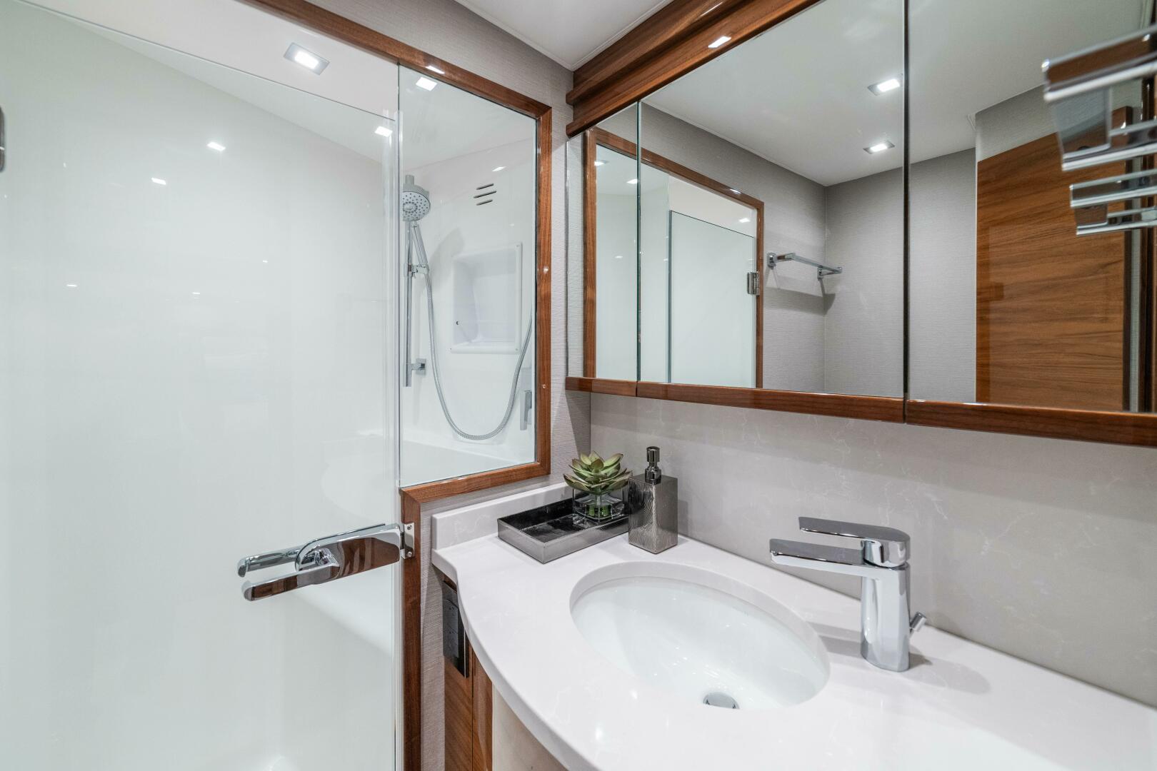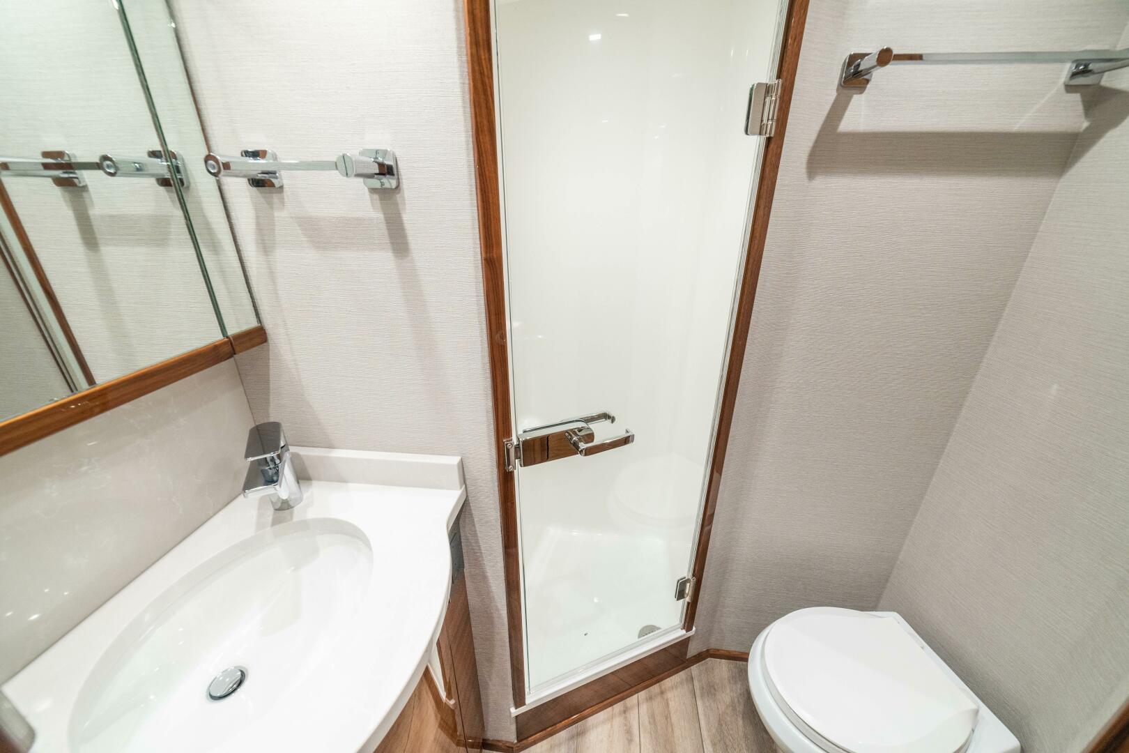 Like the salon, the port-side companionway and four staterooms feature premium carpeting, air conditioning and LED lighting. The companionway is home to a convenient washer and dryer behind a walnut door. The master and forward staterooms each feature queen-size walk-around berths with custom inner-spring mattresses with ample storage underneath, HD TVs and ensuite heads. A crossover berth arrangement is also available in the forward cabin as an option. To starboard you’ll find the spacious midship master, appointed with his-and-hers maple-lined hanging lockers, a credenza, end tables on each side of the bed and an HD TV. The forward guest stateroom forward also provides hanging locker storage, as well as cabinets on the port and starboard sides of the bed and a Bomar foredeck hatch.