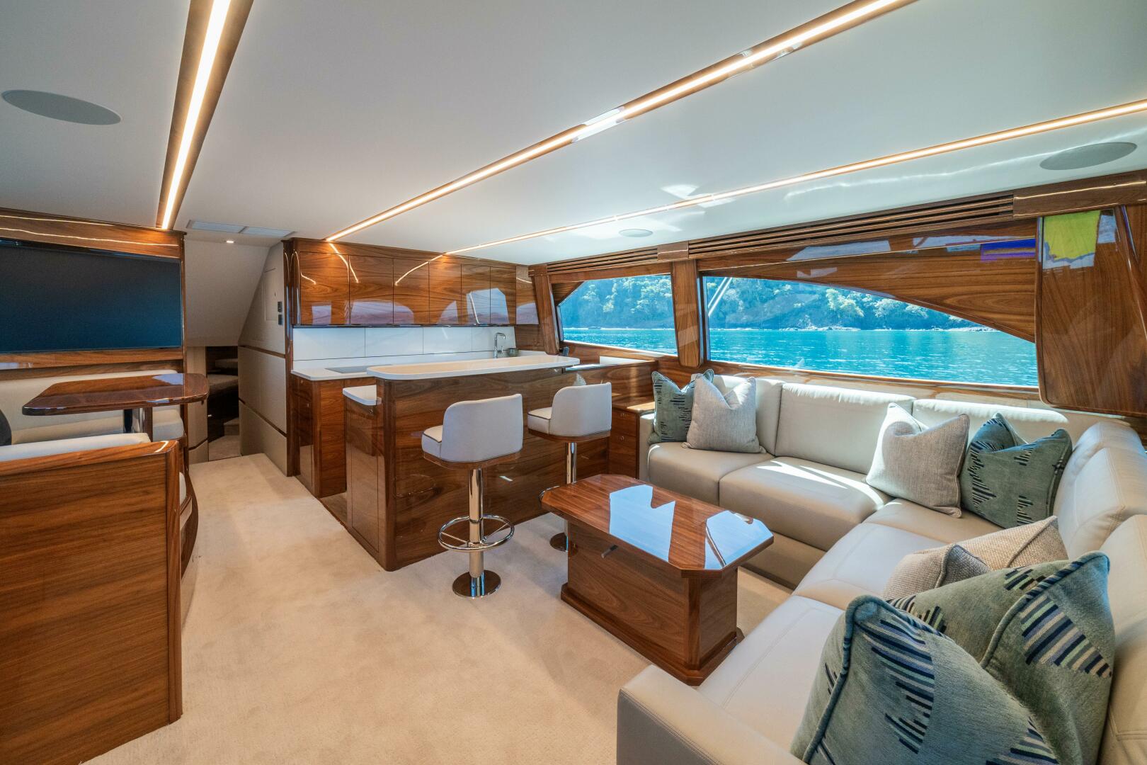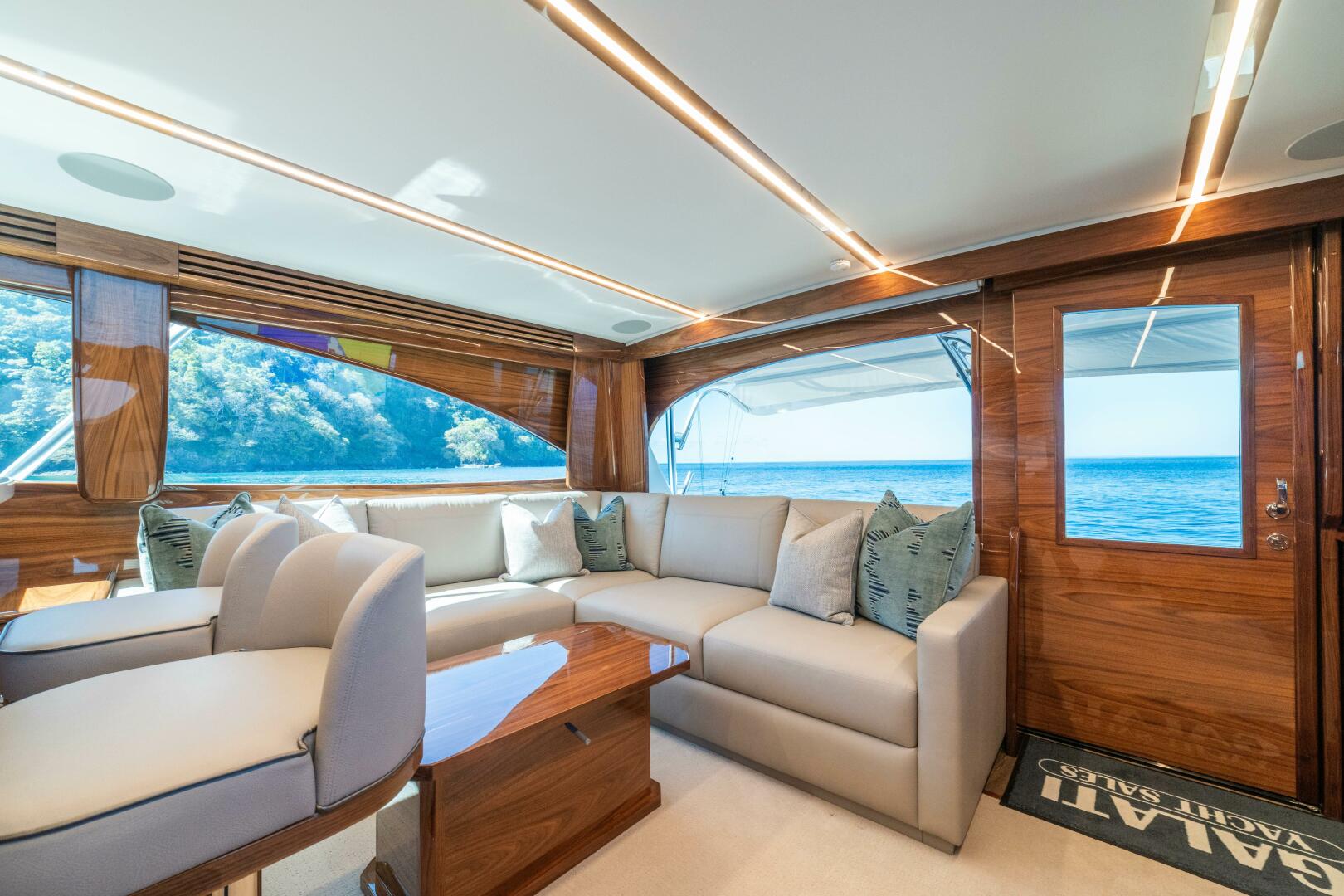 With a push of a button, the electric-powered salon door slides open, revealing the 64’s spacious salon. Like its two most recent predecessors, the Viking 54 and 58, the 64 convertible features an open layout with a walkway that extends in a straight line from the salon all the way to the forepeak, heightening the sense of depth and space.