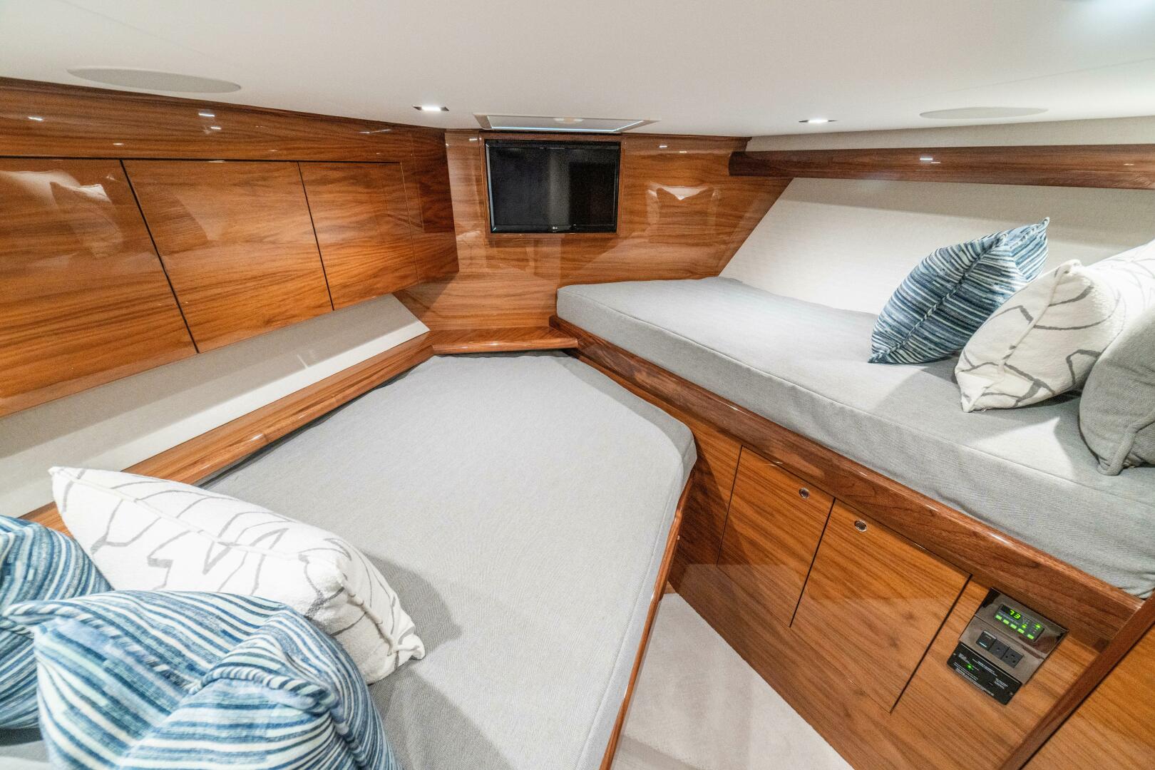 The port side is dedicated to a guest (aft) and crew stateroom (forward). Both are appointed with the same high level of luxury and are uniquely designed to maximize comfort and function. The guest stateroom features side-by-side bunks, while the crew quarters have upper and lower bunks. Maple-lined hanging lockers, speakers recessed in the headliner and decorative indirect rope lighting round out the conveniences.