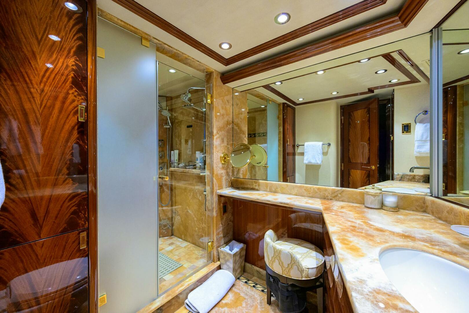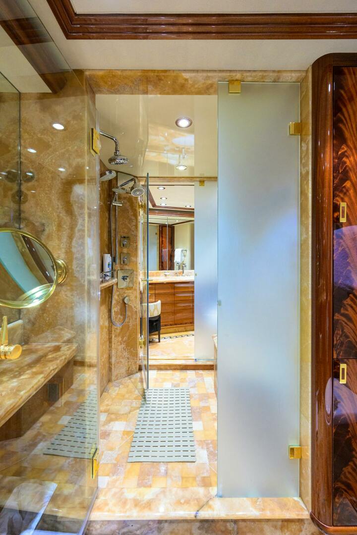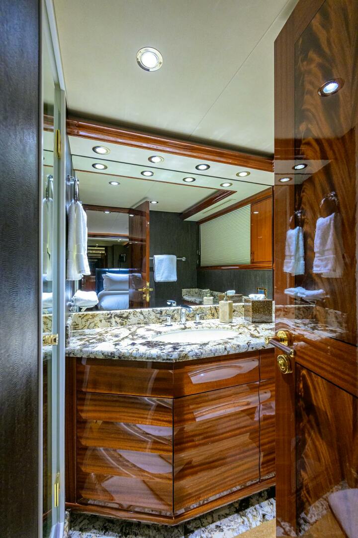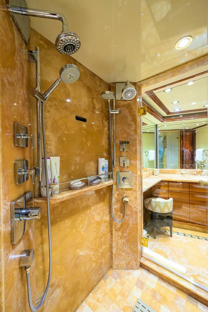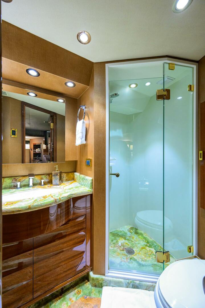 MASTER and Guest Staterooms are located amid ship and accessed via a curved staircase to the lower Foyer. The Master is full beam and features a centerline king berth with gas shock assisted lift and abundant storage underneath Mahogany wood accents, overhead wood detailing and trays, and carpeted sole. The Master has a LED TV, enlarged portlights, abundant chest drawers, a companion seat, walk-in closet, and blinds, lighting, and audio/visual entertainment control are all accessed via the Crestron I-Pad tablet. The Master Stateroom has entrances port and starboard, to the his & hers full beam head. This head has dual vanities with overhead lighting, upgraded faucets on the vanities, storage cabinets, upgraded dual shower heads, custom upgraded stones on the vanity tops, sole and in the centerline shower, Headhunter heads, and linen closets.
