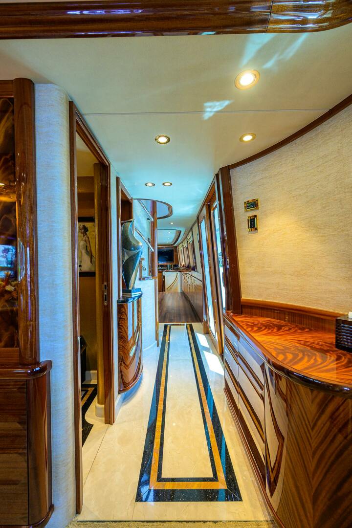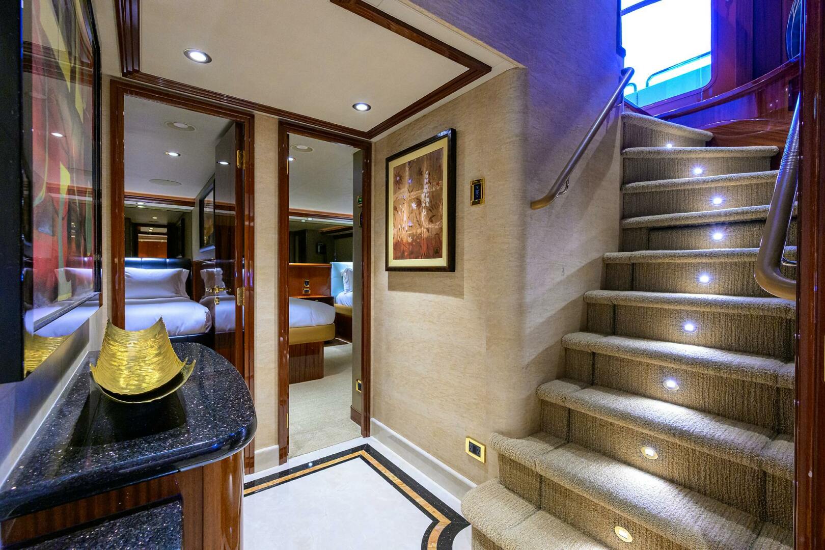 Master and Guest accommodations are accessed from the port side of the main salon, thru a foyer. The Foyer features a large entrance door with companion picture window, a large closet with the laundry washer and dryer stack unit for the owner and guest staterooms, additional freezer drawer storage and access underneath the Pilothouse where various ship’s electrical, equipment, and audio/visual central bases are located. This entrance area has a stone sole to the staircase leading to the lower Foyer landing. There is abundant hard luggage storage underneath this staircase.