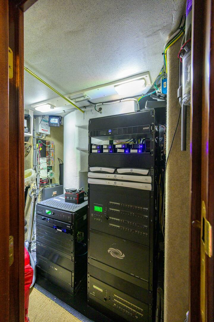 The redesigned CAPTAIN AND CREW quarters and engine room are accessed from either the aft deck to starboard, or the swim platform. This area has a laundry center with washer and dryer, sink and refrigerator, cabinets, and a large icemaker and 2 freezers. The Captain's Stateroom is located to port with a queen berth, cabinets, a hanging locker, ensuite head with shower, entertainment, and desk. The 2 CREW Staterooms are to starboard, and both have double over/under bunks, the crew staterooms share an ensuite head with showers, and entertainment. The Engine Room is accessed forward of the Crew Quarters.