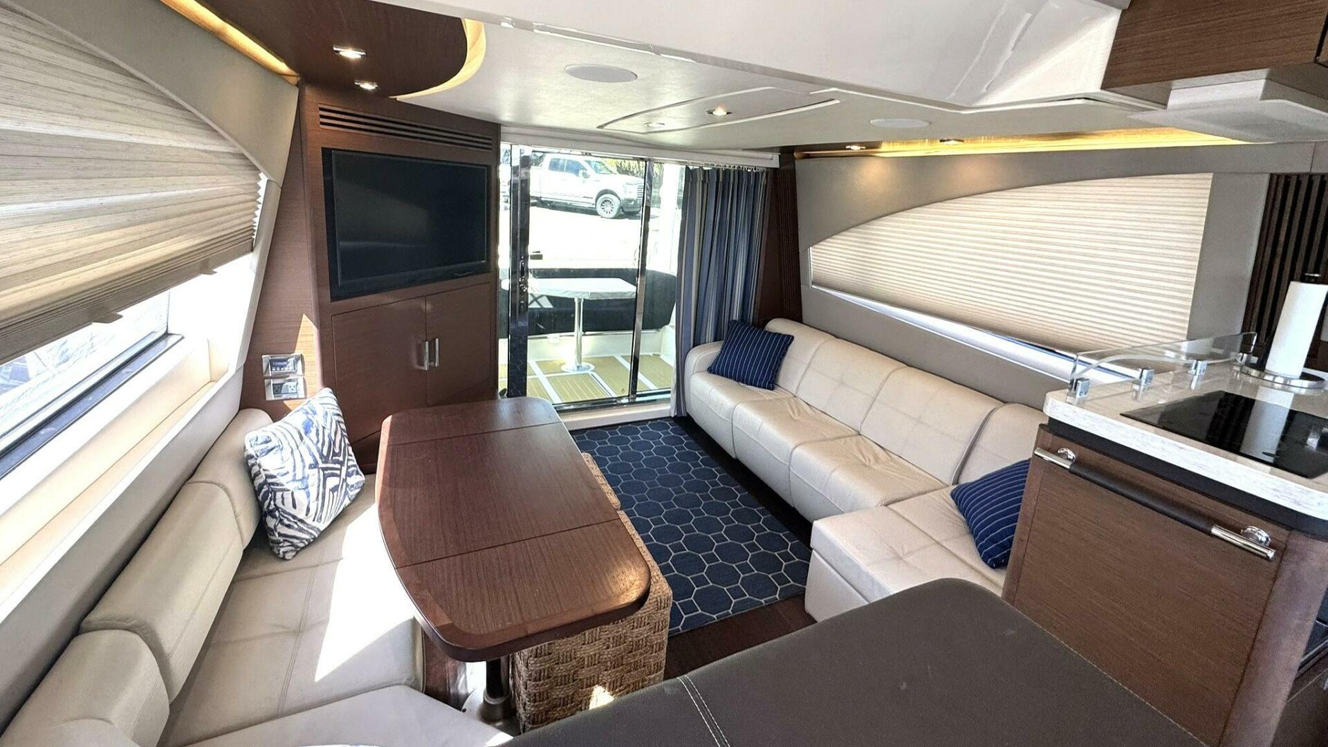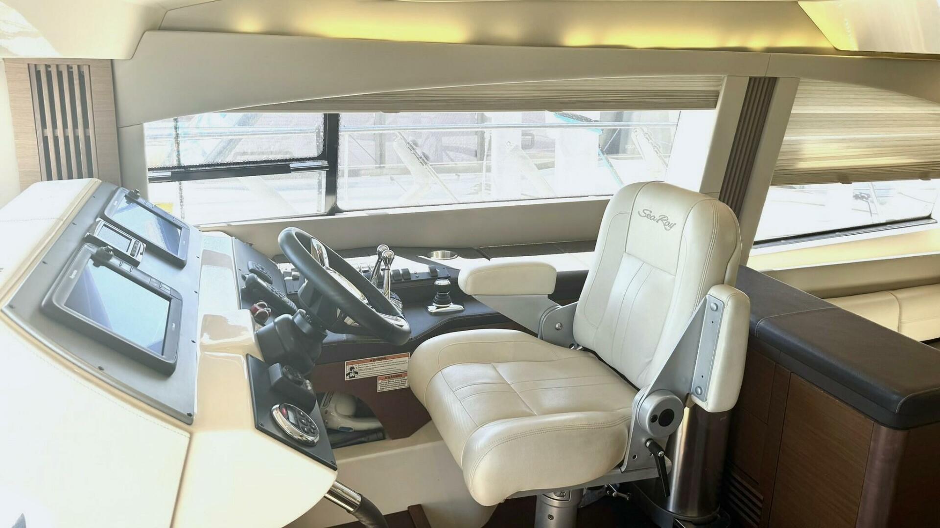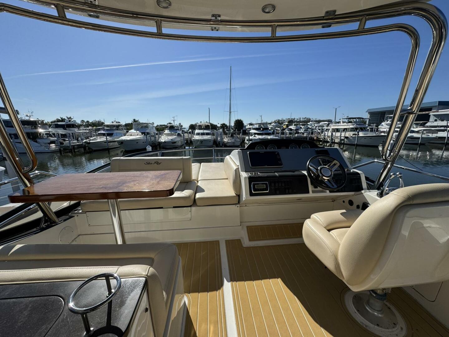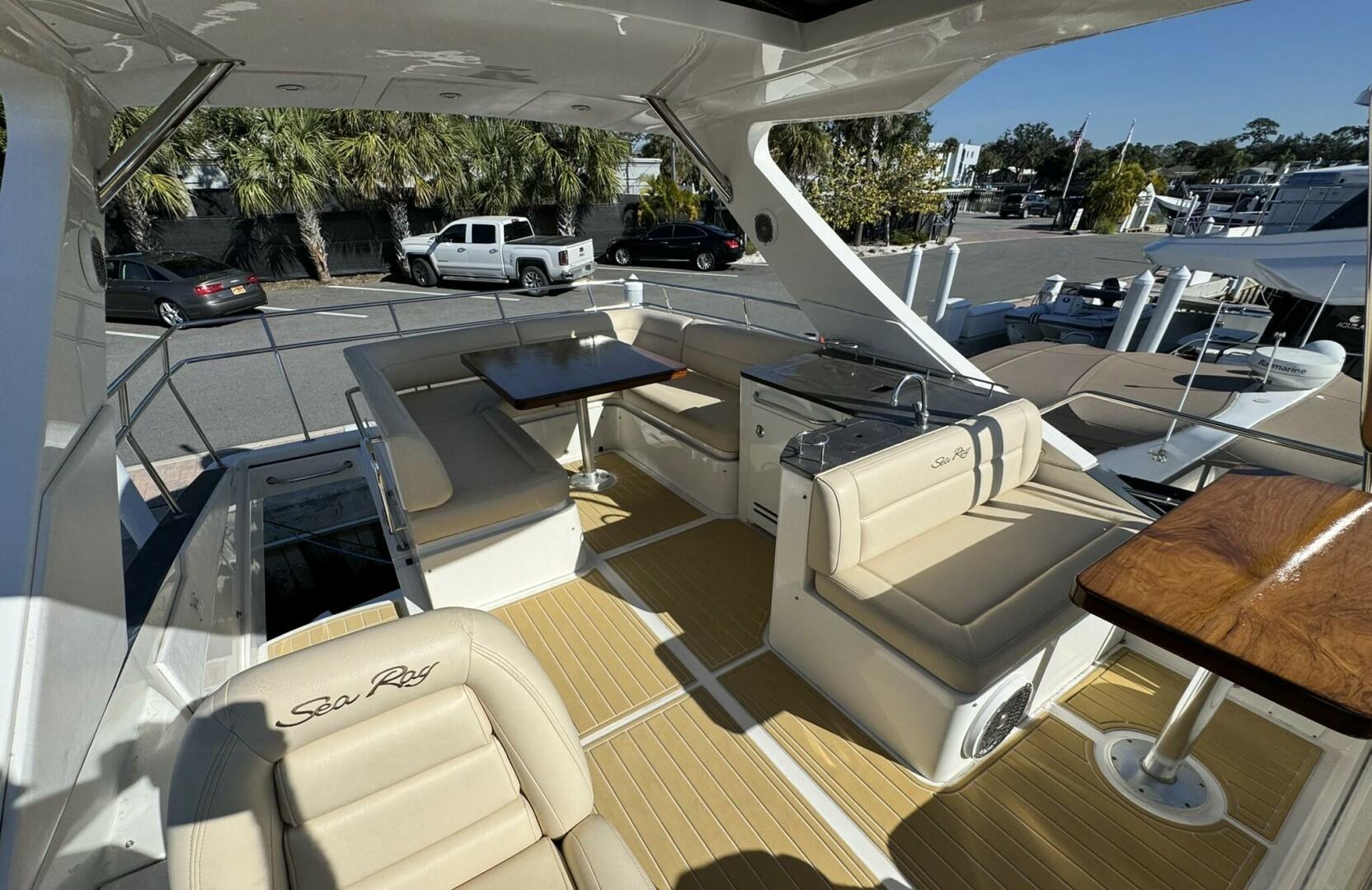 Powered by twin Cummins QSC 600 engines with Zeus pod drives and joystick control at both the upper and lower helm stations, she shows approximately 640 hours. The vessel features Sea Ray’s standard flybridge layout with dedicated entertainment spaces, a hydraulic swim platform, and integrated Raymarine electronics. Additional equipment includes updated salon leather interior and exterior soft goods, custom Prana mattresses, upgraded appliances, underwater lights, SeaDek flooring, KVH TracVision DirecTV, an aft swim ladder, and a Sea Recovery water maker mounted in the engine room.