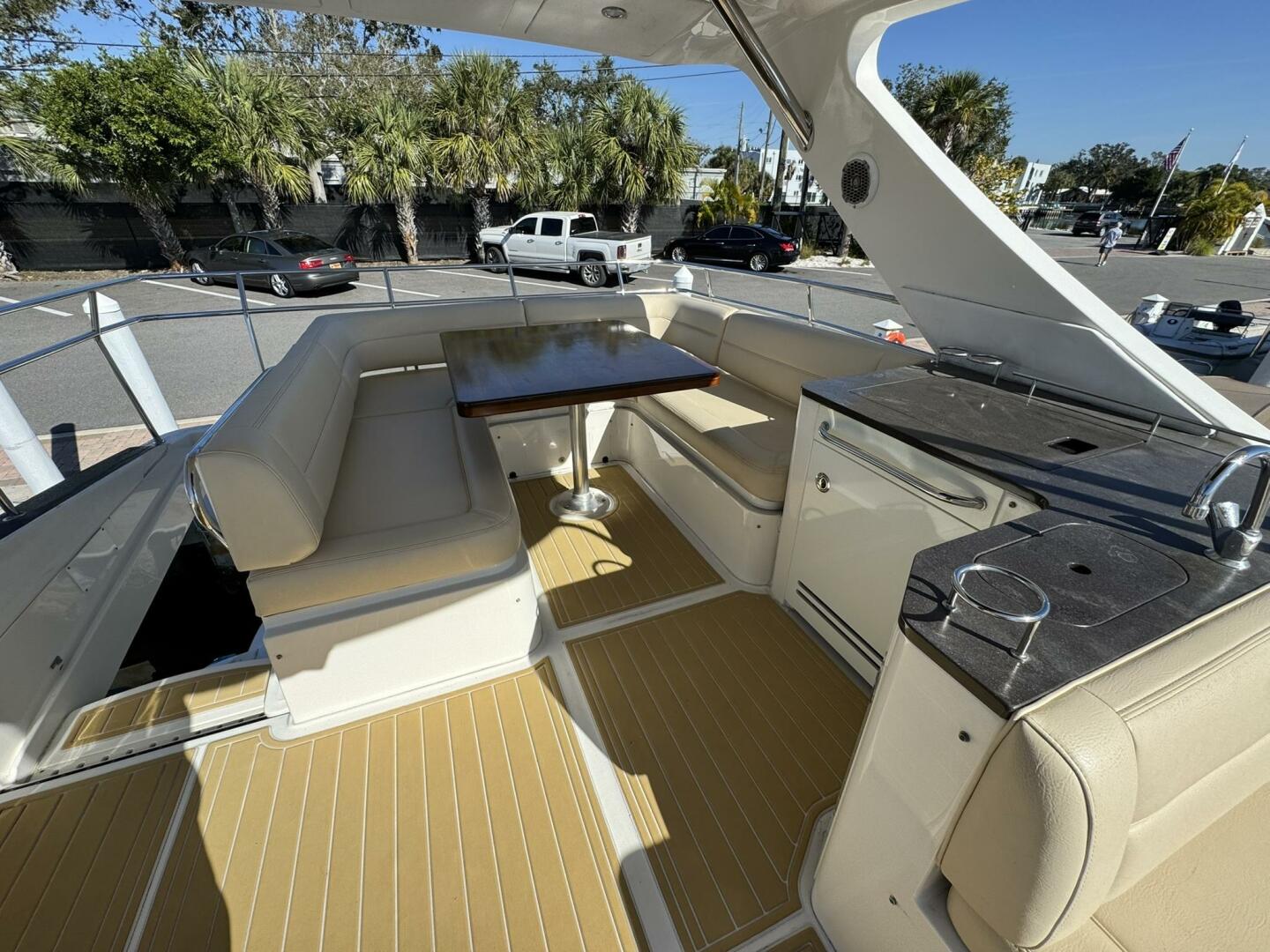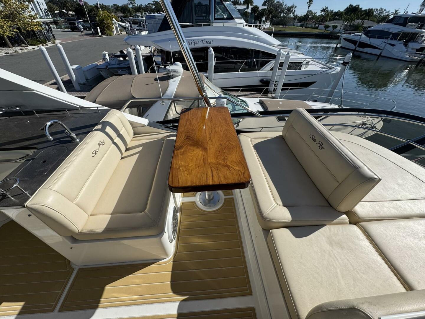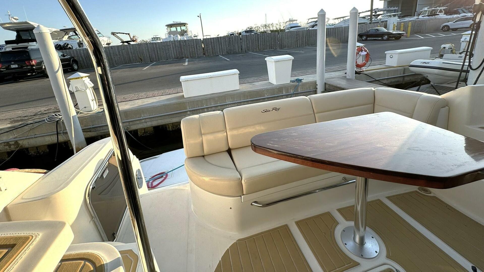 Powered by twin Cummins QSC 600 engines with Zeus pod drives and joystick control at both the upper and lower helm stations, she shows approximately 640 hours. The vessel features Sea Ray’s standard flybridge layout with dedicated entertainment spaces, a hydraulic swim platform, and integrated Raymarine electronics. Additional equipment includes updated salon leather interior and exterior soft goods, custom Prana mattresses, upgraded appliances, underwater lights, SeaDek flooring, KVH TracVision DirecTV, an aft swim ladder, and a Sea Recovery water maker mounted in the engine room.