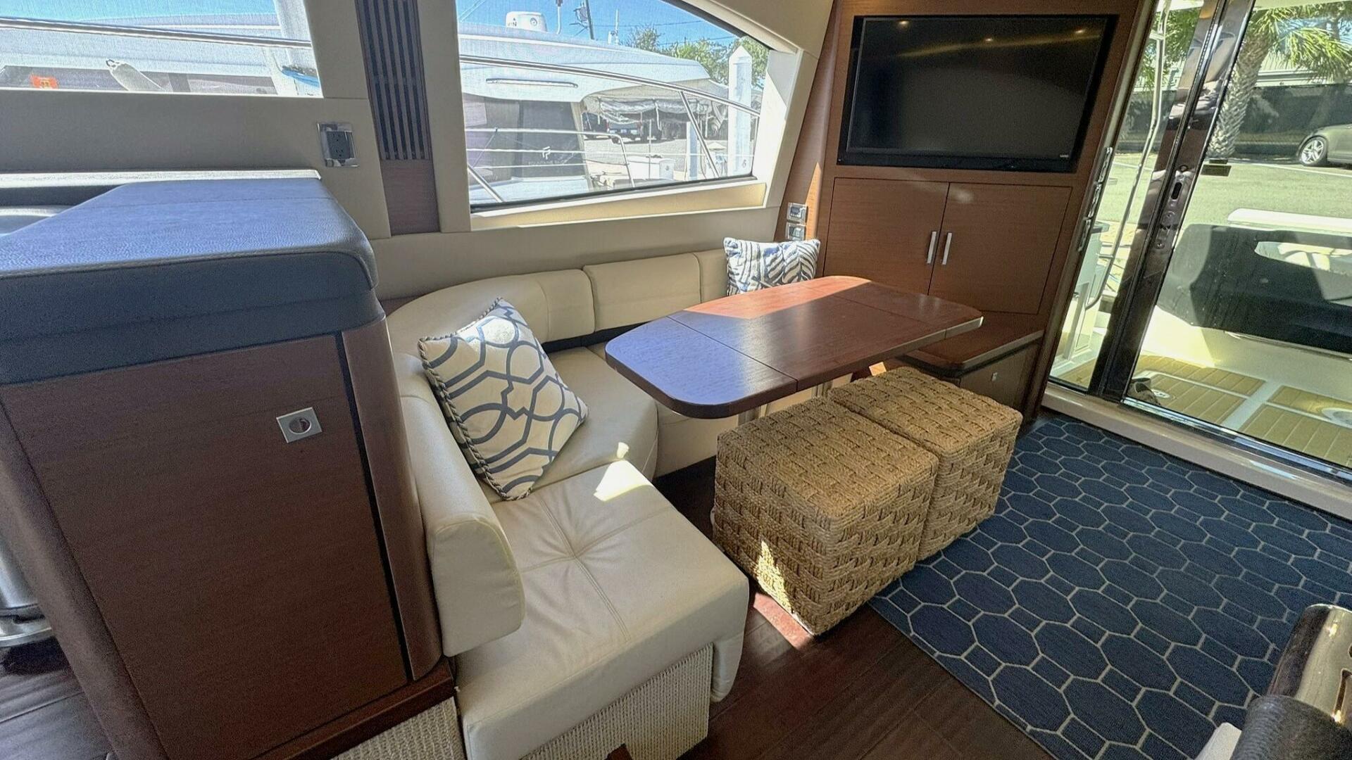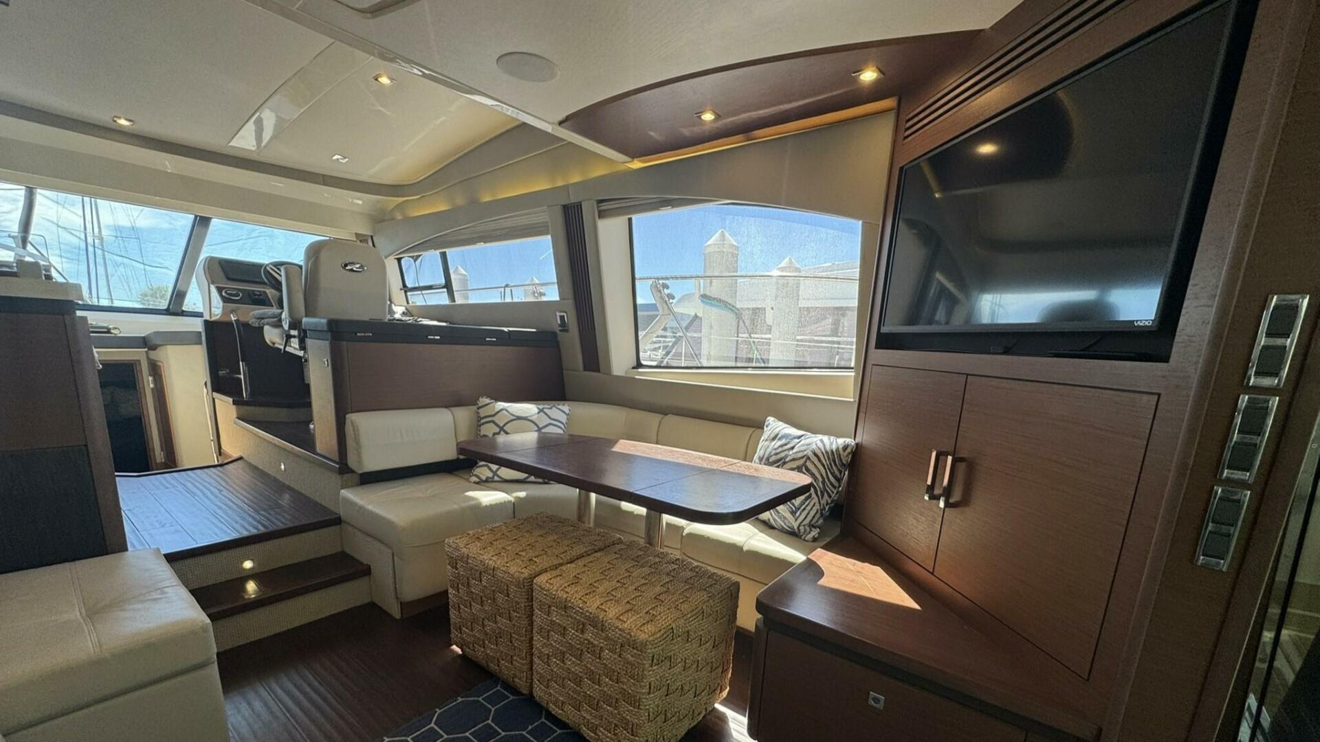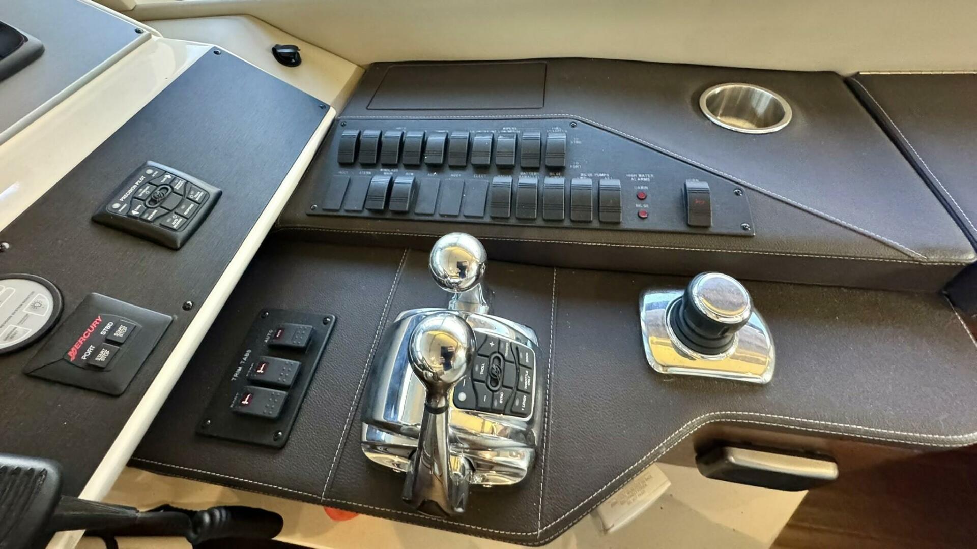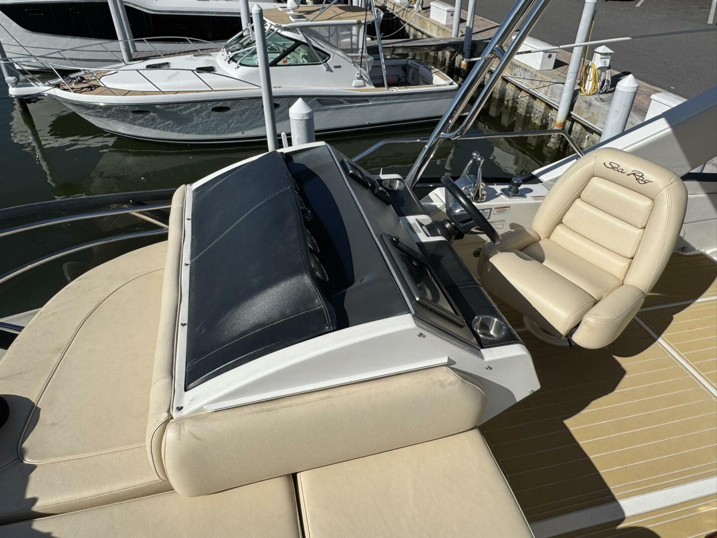 Powered by twin Cummins QSC 600 engines with Zeus pod drives and joystick control at both the upper and lower helm stations, she shows approximately 640 hours. The vessel features Sea Ray’s standard flybridge layout with dedicated entertainment spaces, a hydraulic swim platform, and integrated Raymarine electronics. Additional equipment includes updated salon leather interior and exterior soft goods, custom Prana mattresses, upgraded appliances, underwater lights, SeaDek flooring, KVH TracVision DirecTV, an aft swim ladder, and a Sea Recovery water maker mounted in the engine room.