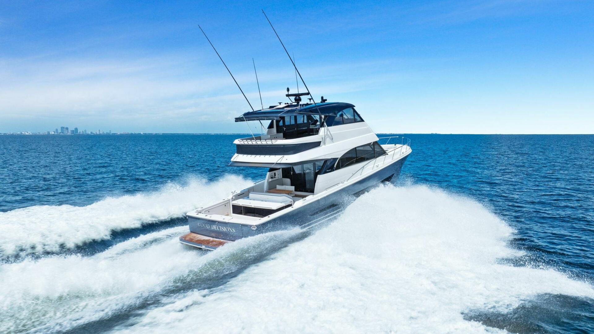 “Good Decisions” began life as a highly customized vessel for an avid boat owner who carefully selected every option, including a distinctive custom painted color scheme. Fitted with the largest engines available for this model — Scania DI 16 1,150 HP — she delivers commanding performance with effortless ease.