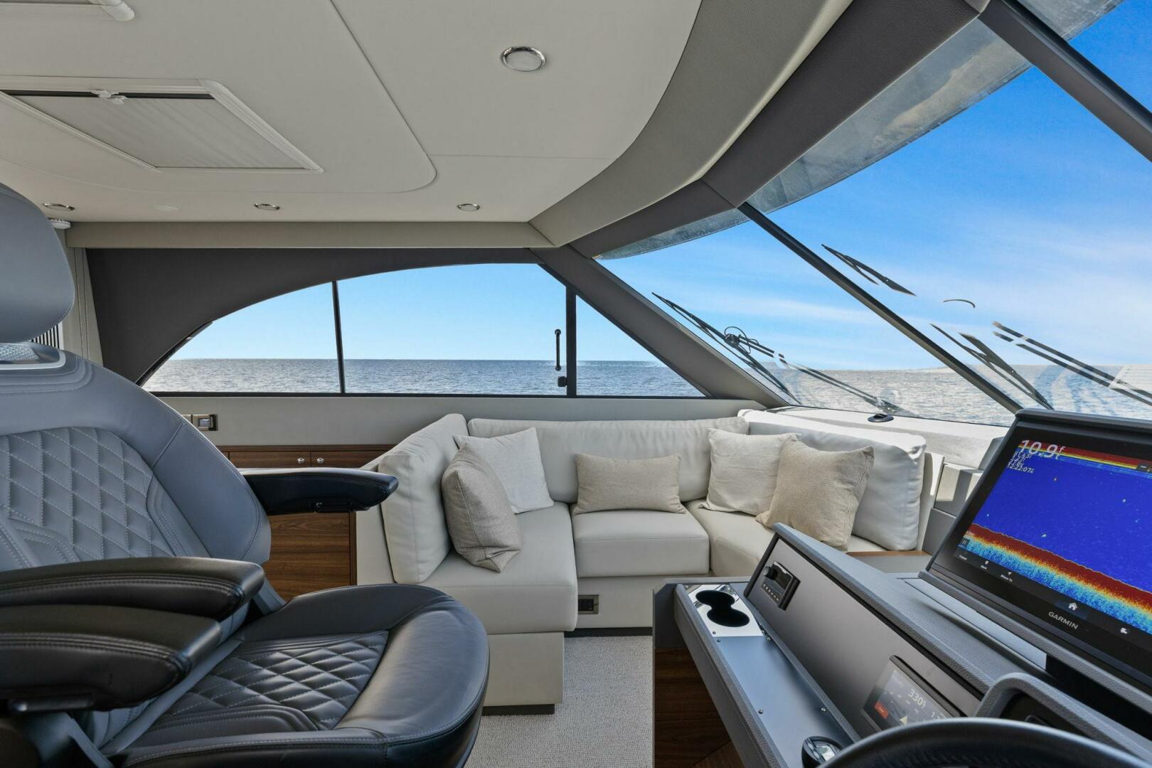 - Cockpit: Extended, Custom U-shaped seating with table, chaise lounge ottomans, side boarding gates, thruster and engine controls, aft drop cover