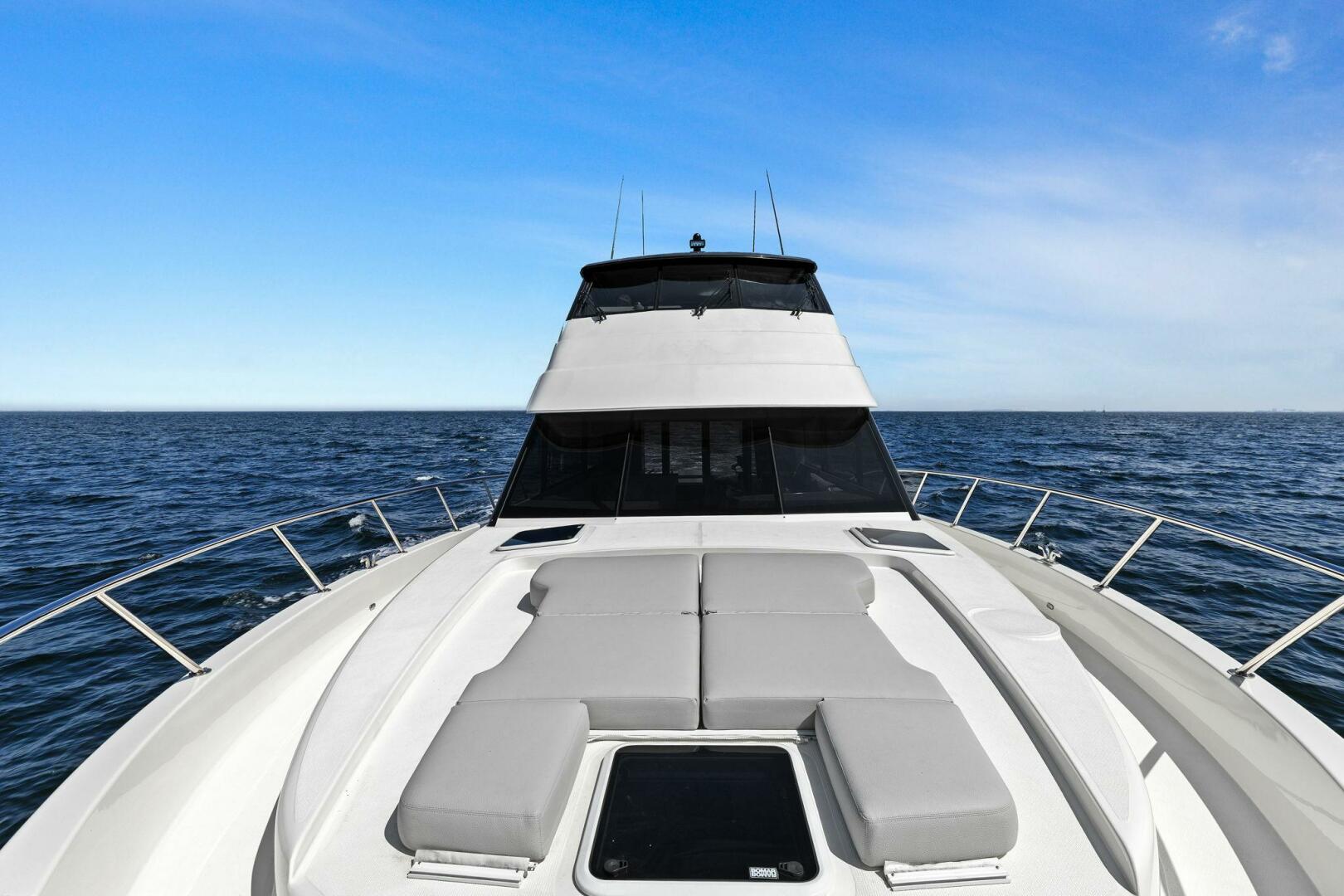 - Flybridge: Extended aft, U-shaped lounge seating, balcony outlet, stereo speakers, aft drop cover