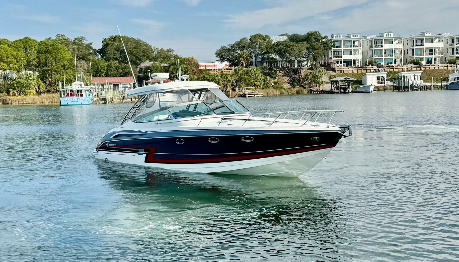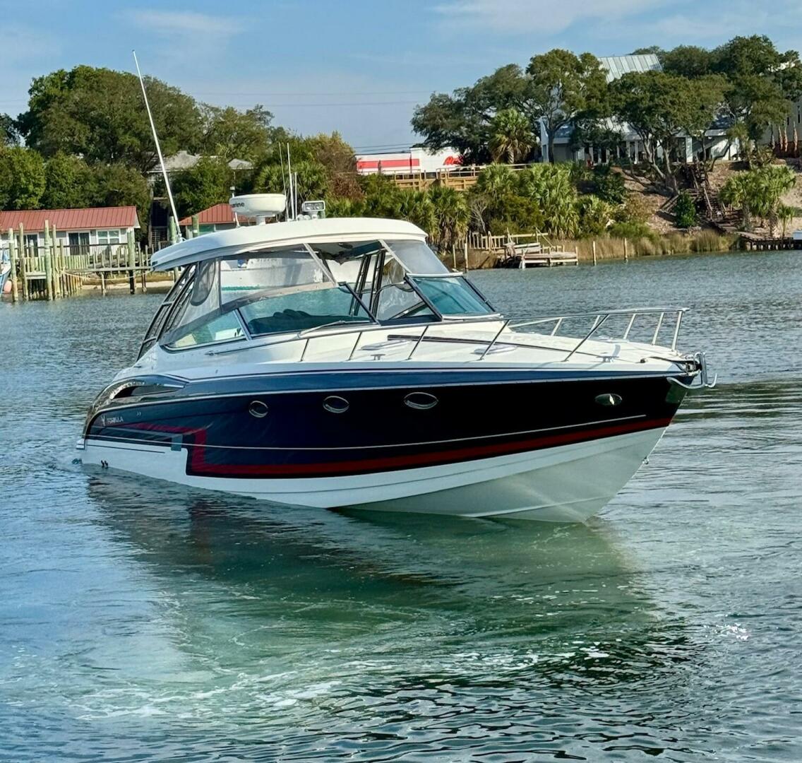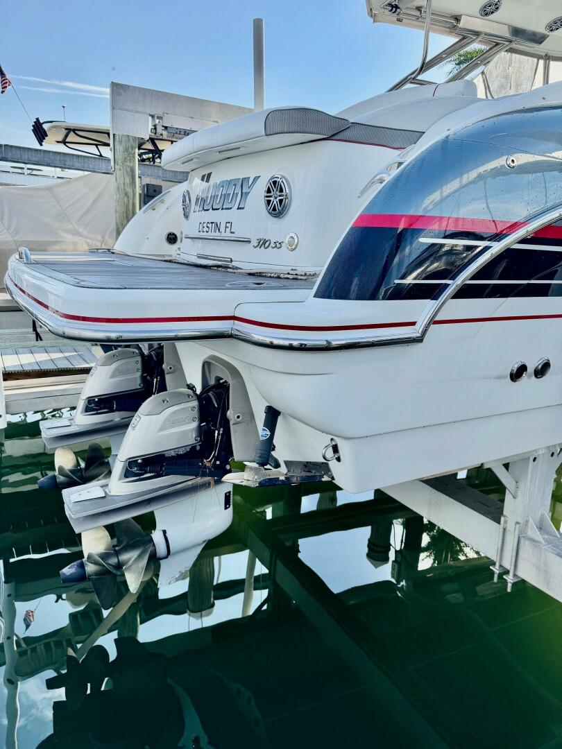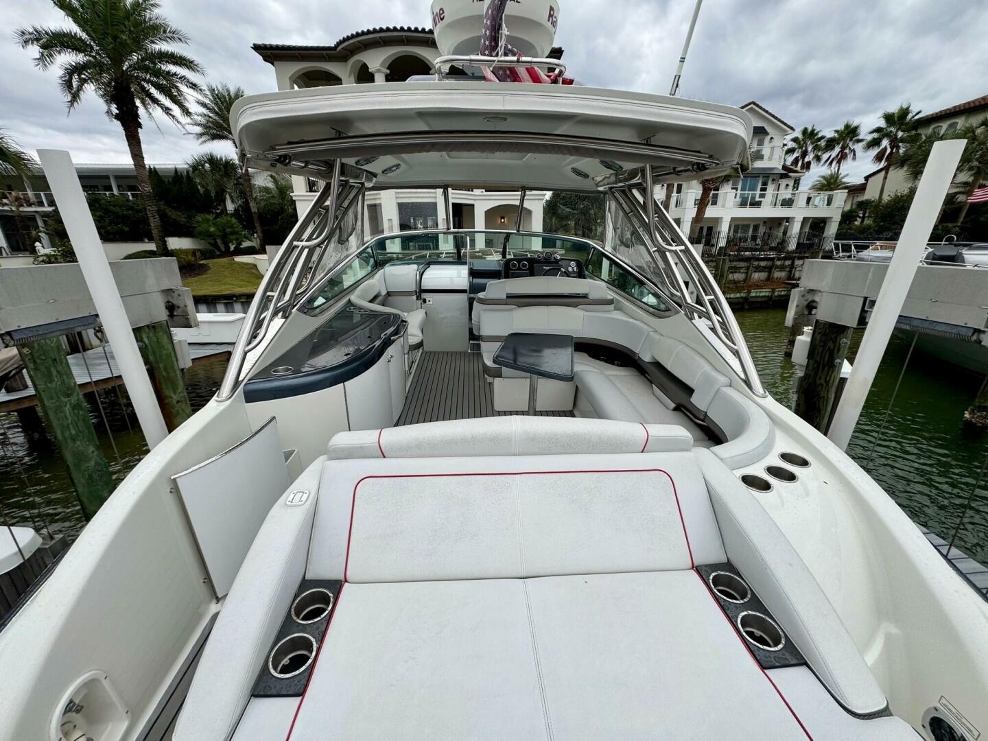 2016 37' Formula 370 Super Sport "Hoody" for sale- This Formula 370 Super Sport sits high and dry on a lift and is maintained by a yacht management company. She’s super sleek with a low profile that cuts through wind and waves with ease. She also has a complete cabin to take you to those overnight spots or long afternoon naps. The 370 SS cockpit adds more versatility than ever with a doublewide captain’s helm, wet bar, and sun lounger. Drive in style with easy joystick controls, with a fully equipped radar and chart plotter. The aft-facing lounge is electrically activated to create a generous sun pad. There's also a hard top with Sure Shade. Her expertly presented textures and colors, recessed alcoves with stainless railing, integrated, blue LED lighting, and cupholders set in eye-catching Corian® position the 370 SS at the forefront of marine design. Contact us today for an immediate showing.