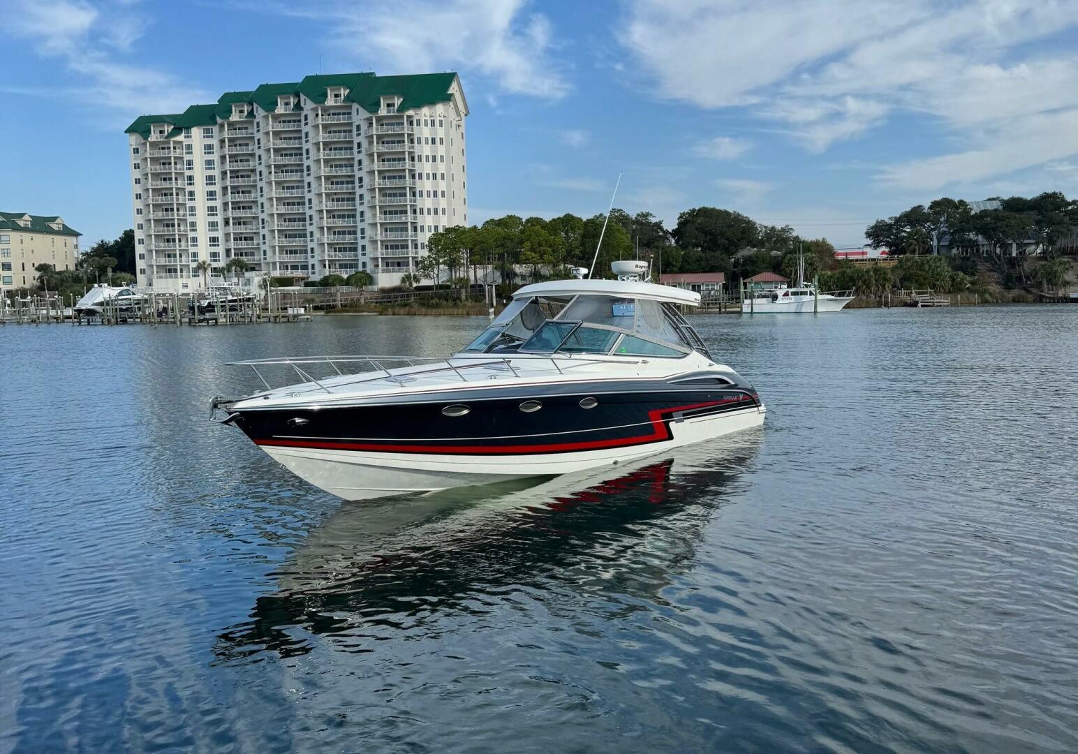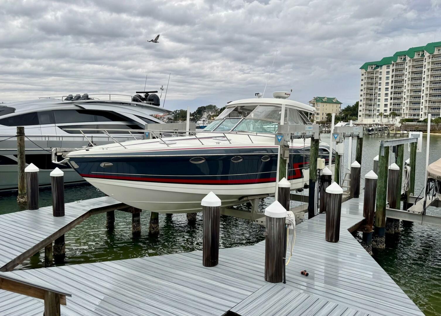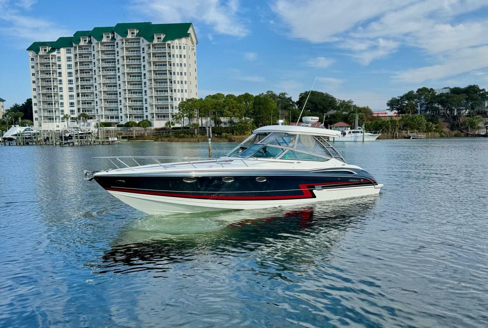 2016 37' Formula 370 Super Sport "Hoody" for sale- This Formula 370 Super Sport sits high and dry on a lift and is maintained by a yacht management company. She’s super sleek with a low profile that cuts through wind and waves with ease. She also has a complete cabin to take you to those overnight spots or long afternoon naps. The 370 SS cockpit adds more versatility than ever with a doublewide captain’s helm, wet bar, and sun lounger. Drive in style with easy joystick controls, with a fully equipped radar and chart plotter. The aft-facing lounge is electrically activated to create a generous sun pad. There's also a hard top with Sure Shade. Her expertly presented textures and colors, recessed alcoves with stainless railing, integrated, blue LED lighting, and cupholders set in eye-catching Corian® position the 370 SS at the forefront of marine design. Contact us today for an immediate showing.