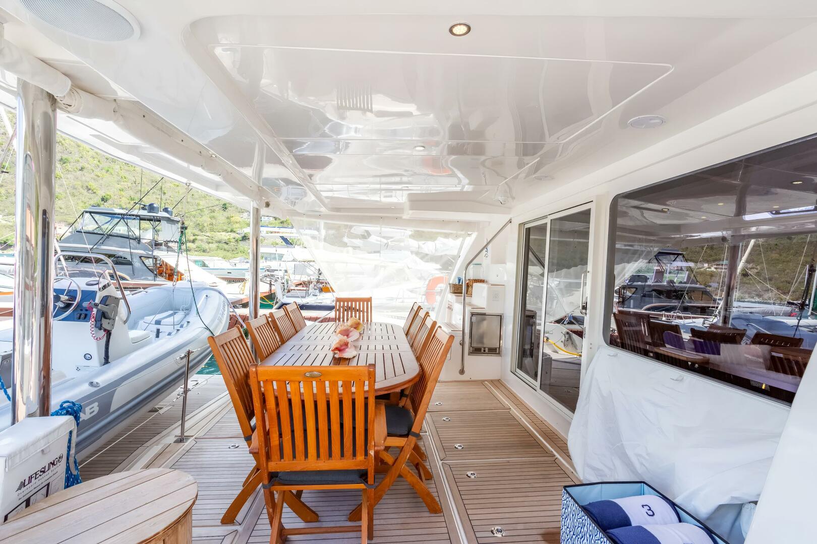 Step onto the swim platform of the 2014 Leopard 58 “ANNEX,” and you immediately feel the scale, luxury, and meticulous care that set this privately owned, non-charter flagship apart. Wide transom steps with hot/cold shower access lead you into the expansive aft cockpit—an inviting outdoor living area with a teak dining table for ten, plush seating, and seamless indoor–outdoor flow. This area has clearly benefited from the yacht’s recent interior refinishing and updated soft goods, giving it a fresh, modern feel that reflects the vessel’s continual professional upkeep.