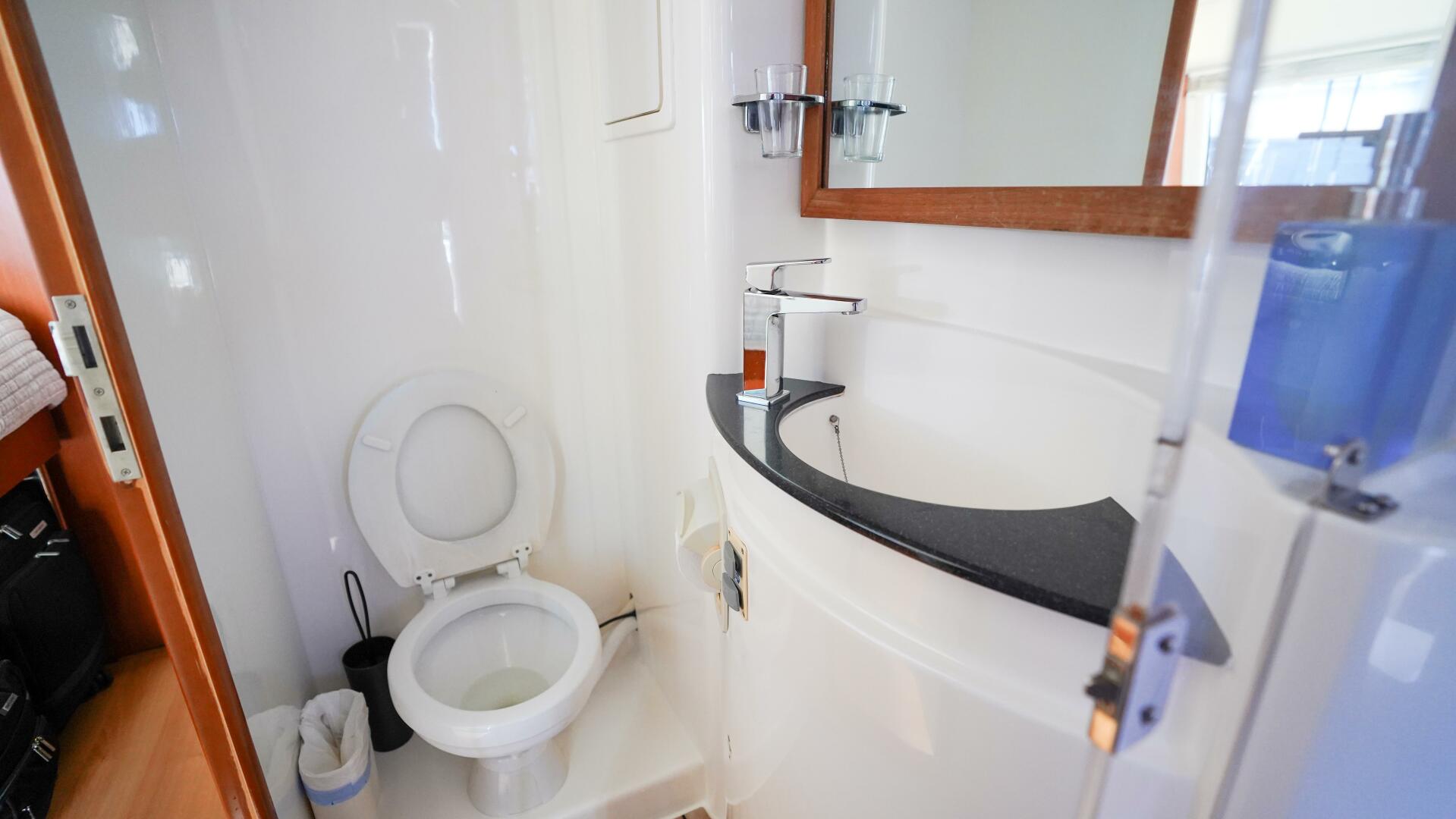 Descending below, ANNEX reveals her highly sought-after true six-cabin, six-head layout, each cabin offering private en-suite facilities, excellent ventilation, and generous storage. Two forward cabins open directly to the forward cockpit—an exclusive feature beloved by guests and crew—while four additional cabins below offer exceptional comfort with Webasto multi-zone air conditioning (recently serviced and blowing cold) and warm teak-style flooring throughout. The survey conducted in late 2024 confirms that all cabins, heads, and Vacuflush systems are fully operational and in serviceable condition, with no signs of structural fatigue or wear.