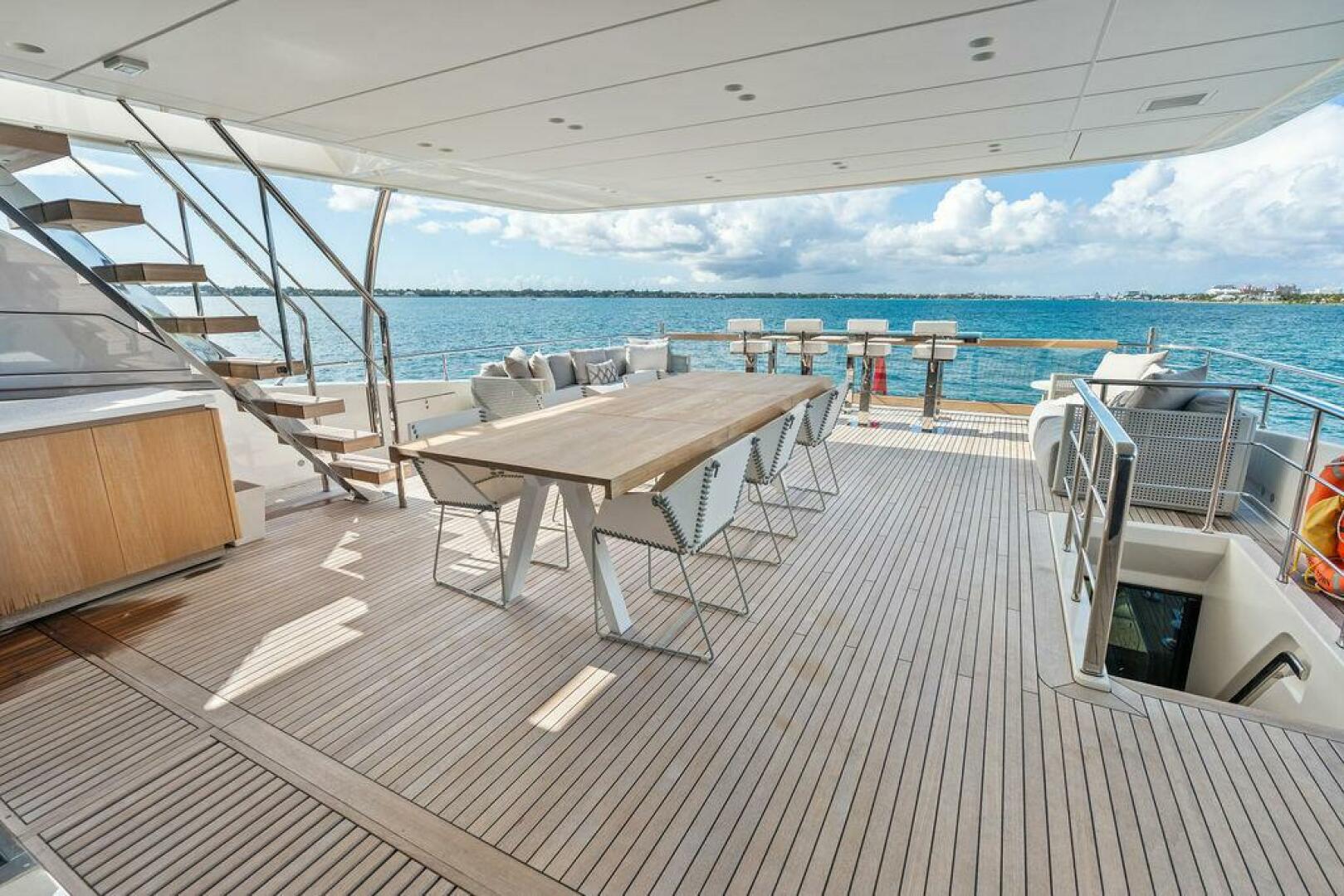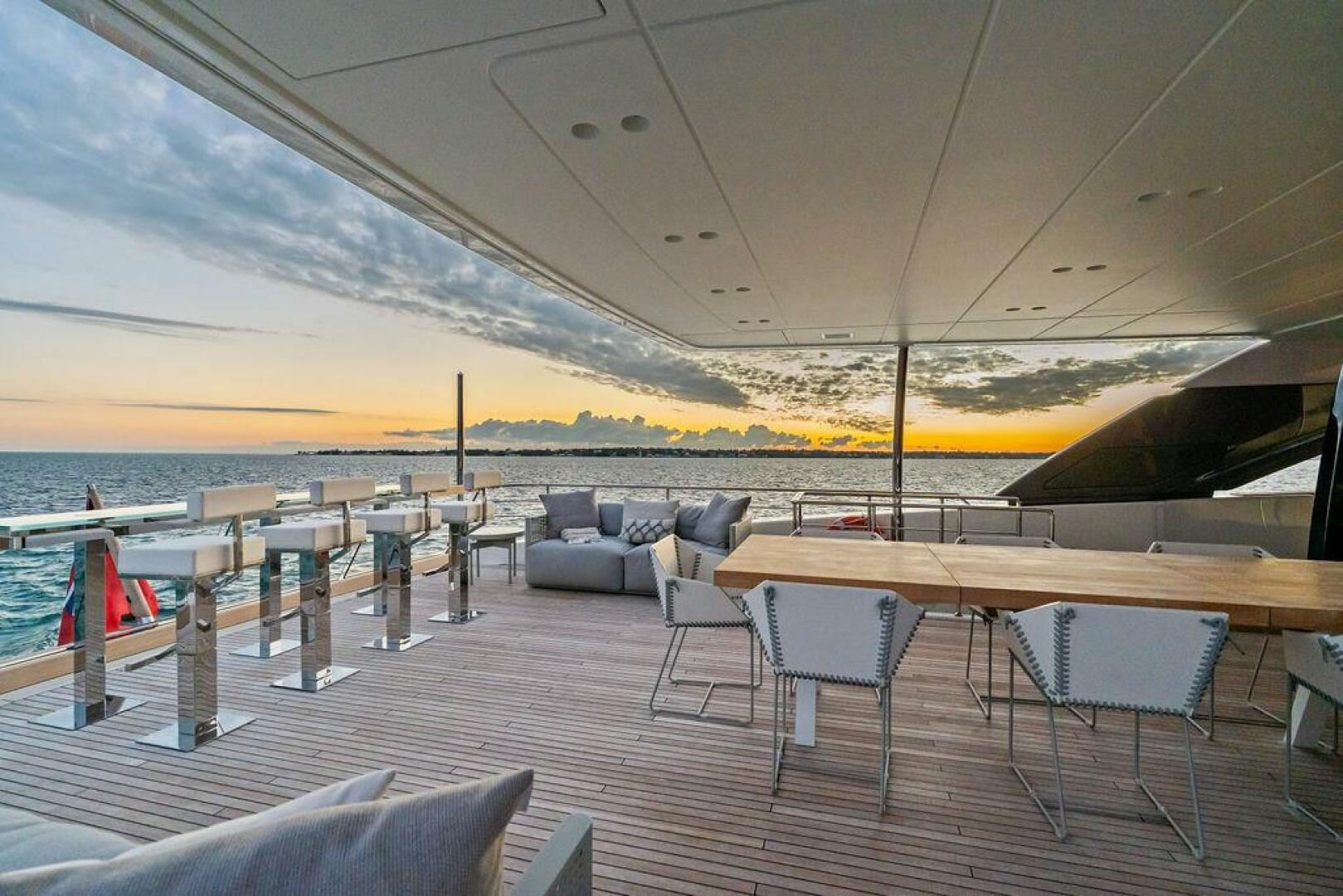 - Upper deck with aft-facing custom bar and stools
