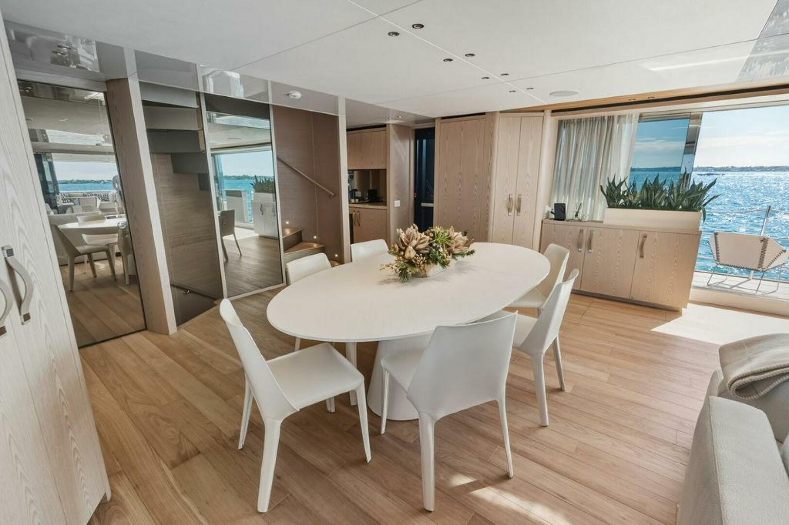 Just above the beach club, the main deck aft is designed as an inviting social hub. A generous fixed sofa faces the saloon, offering a comfortable and relaxed setting for conversation, cocktails, or simply enjoying the view while underway or at anchor.