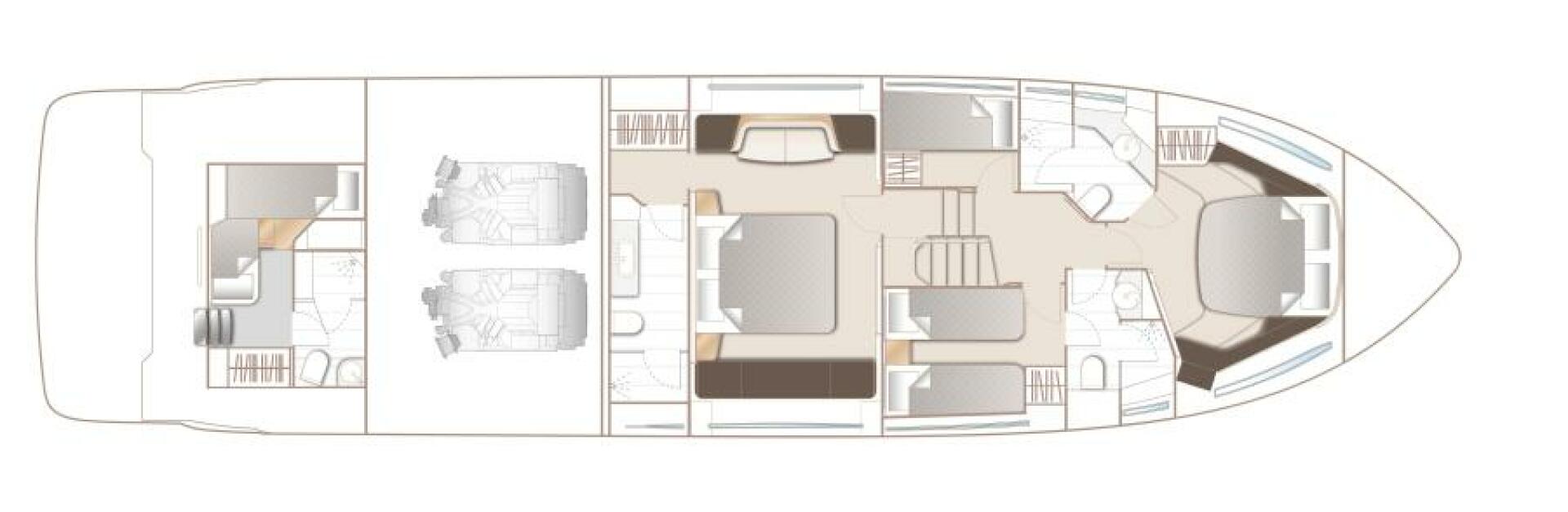 The all-new F65-075 boasts a contemporary use of layout featuring the latest geometric design elements. Focused around a sociable use of space, she provides accommodation for eight guests across four cabins. Vast panoramic saloon windows and signature wrap around front screens offer uninterrupted vistas from the main deck whilst elongated hull windows generously flood her accommodation areas with light.