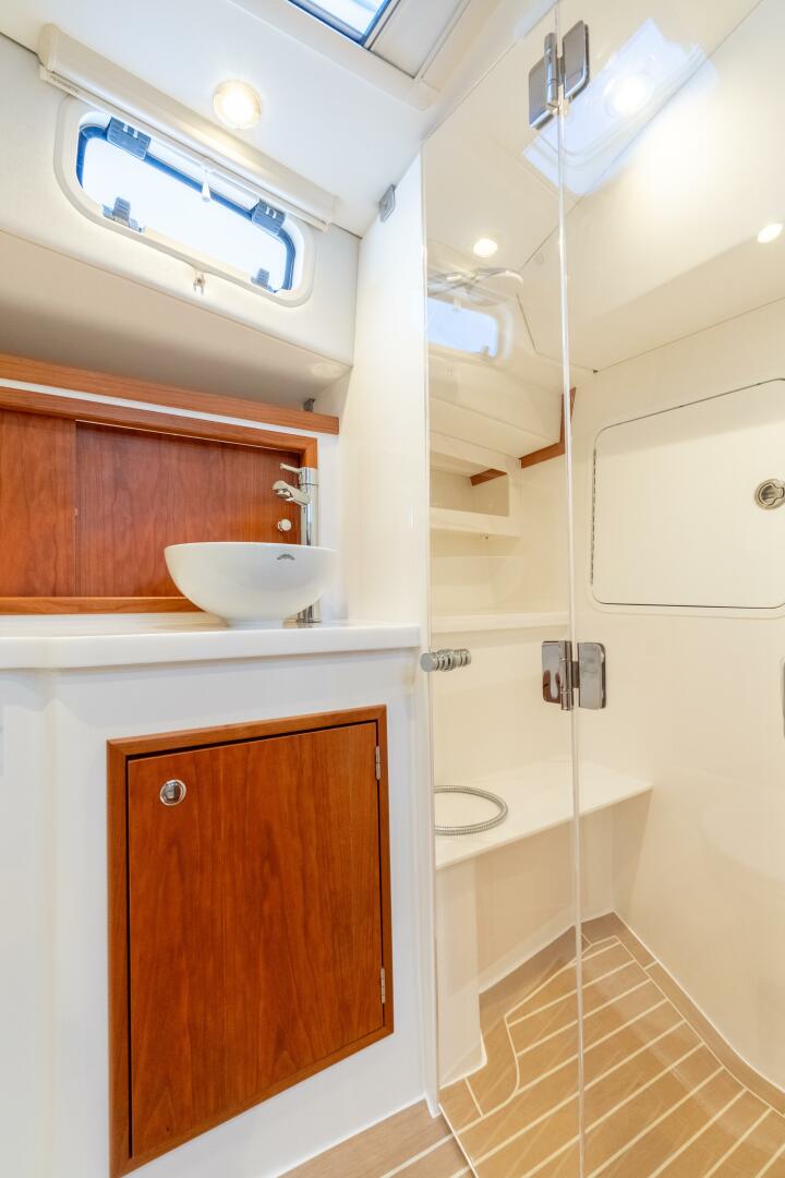 The cockpit is purpose-built for weekend anglers, featuring rod holders, dual live wells, tackle storage, and a removable bait prep station, all seamlessly integrated into a layout that still feels spacious and welcoming. After the action, the same cockpit transforms into a luxury lounge with an optional grill, refrigerator, icemaker, and sink; a perfect setting for entertaining.