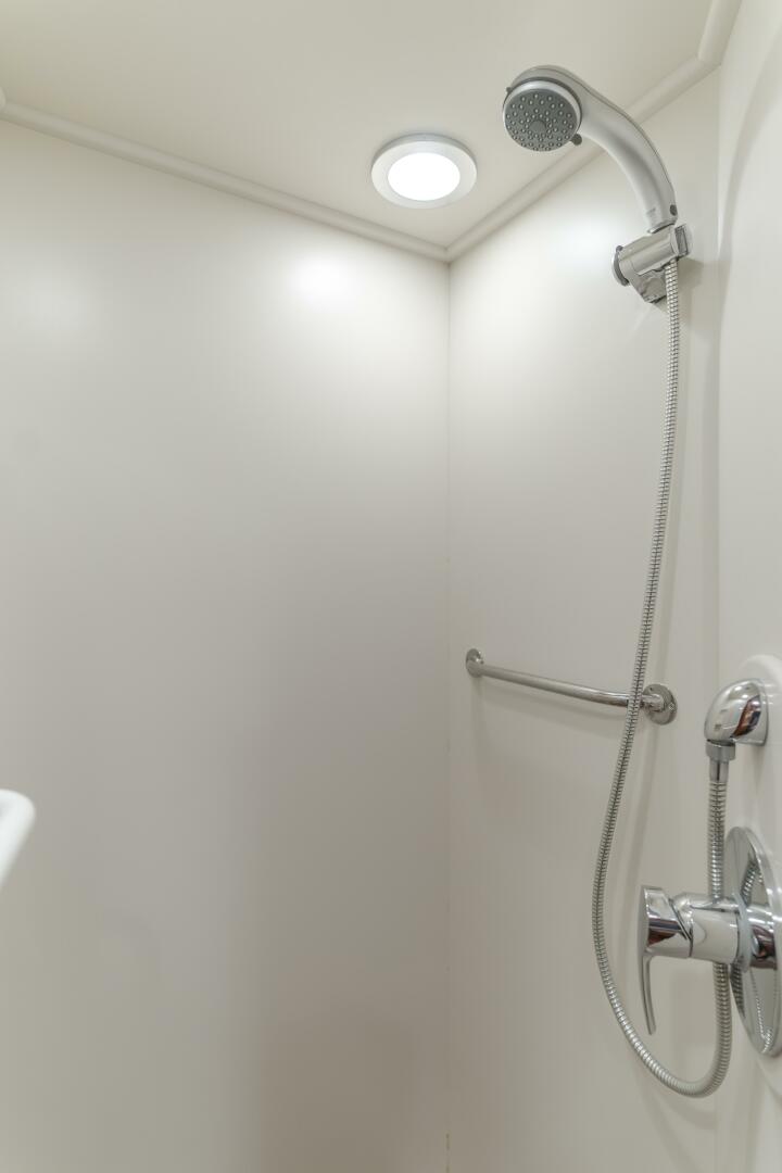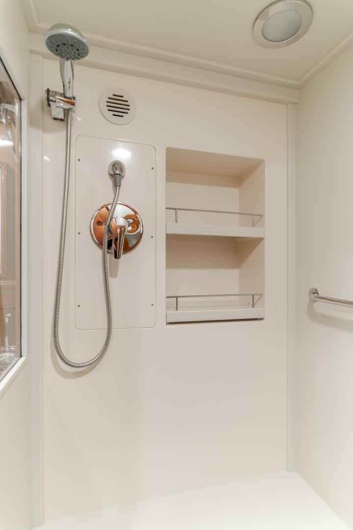 The Master Stateroom offers a beautiful Island berth under a teak headboard with two (2) night tables on each side of the berth with two (2) Cantalupi chrome swivel lights above. To the starboard side of the cabin is a built-in desk with 3 drawers on the port side of the desk and center pencil drawer which can be used for a computer or as a vanity. Forward and port is a large TV, cedar-lined hanging locker and additional storage cabinets with shelves, and bank of four (4) large drawers below counter level. Opening ports for natural lighting are positioned with two (2) to port and two (2) to starboard. This makes for a fantastic master stateroom. The ensuite head is to starboard in the forward part of the stateroom with an arched door with trim moldings that isn’t made this way any longer, so a beautiful feature. There is a separate large shower stall with entry door and two (2) shelves for toiletries. There are three (3) mirrors forward, the center one is fixed and the inboard and outboard ones both open for large medicine cabinets. There are granite countertops, opening port for natural light/ventilation and an abundance of storage.