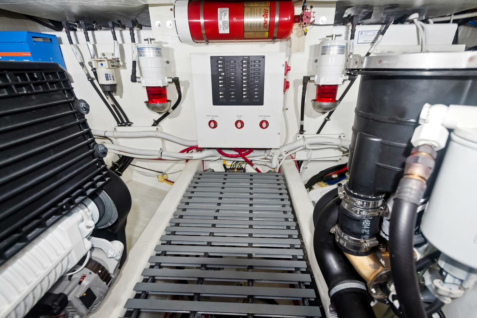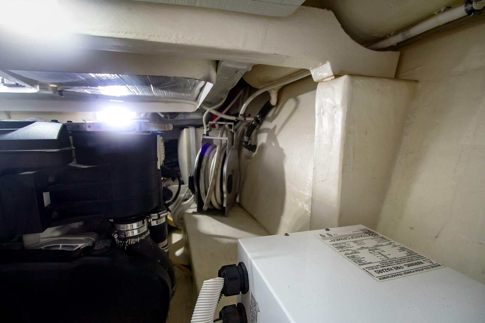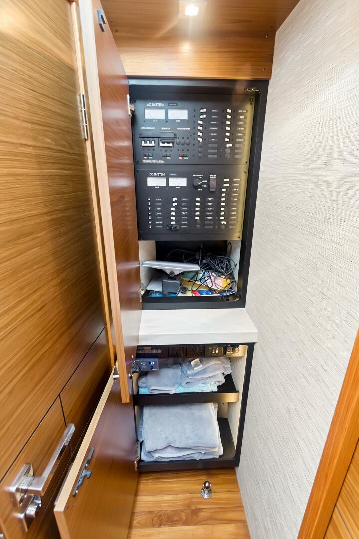 - Tiara custom 12V DC and 120V/240V AC electrical system with master distribution panels in the atrium